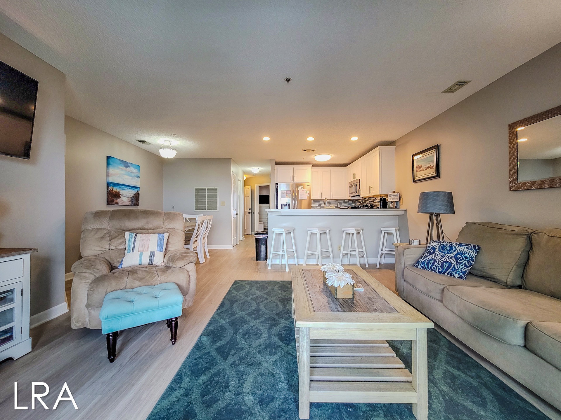 Inside, the living area is the perfect spot for family gatherings. Curl up on the comfortable sofa, select your favorite movie on the large flat-screen TV, and enjoy a night of entertainment. The fully remodeled kitchen is a chef’s dream, featuring stainless steel appliances, sleek quartz countertops, a stylish tile backsplash, and upgraded cabinetry. With a breakfast bar that seats four and a dining table for six, there’s plenty of room for everyone to enjoy a meal together.
