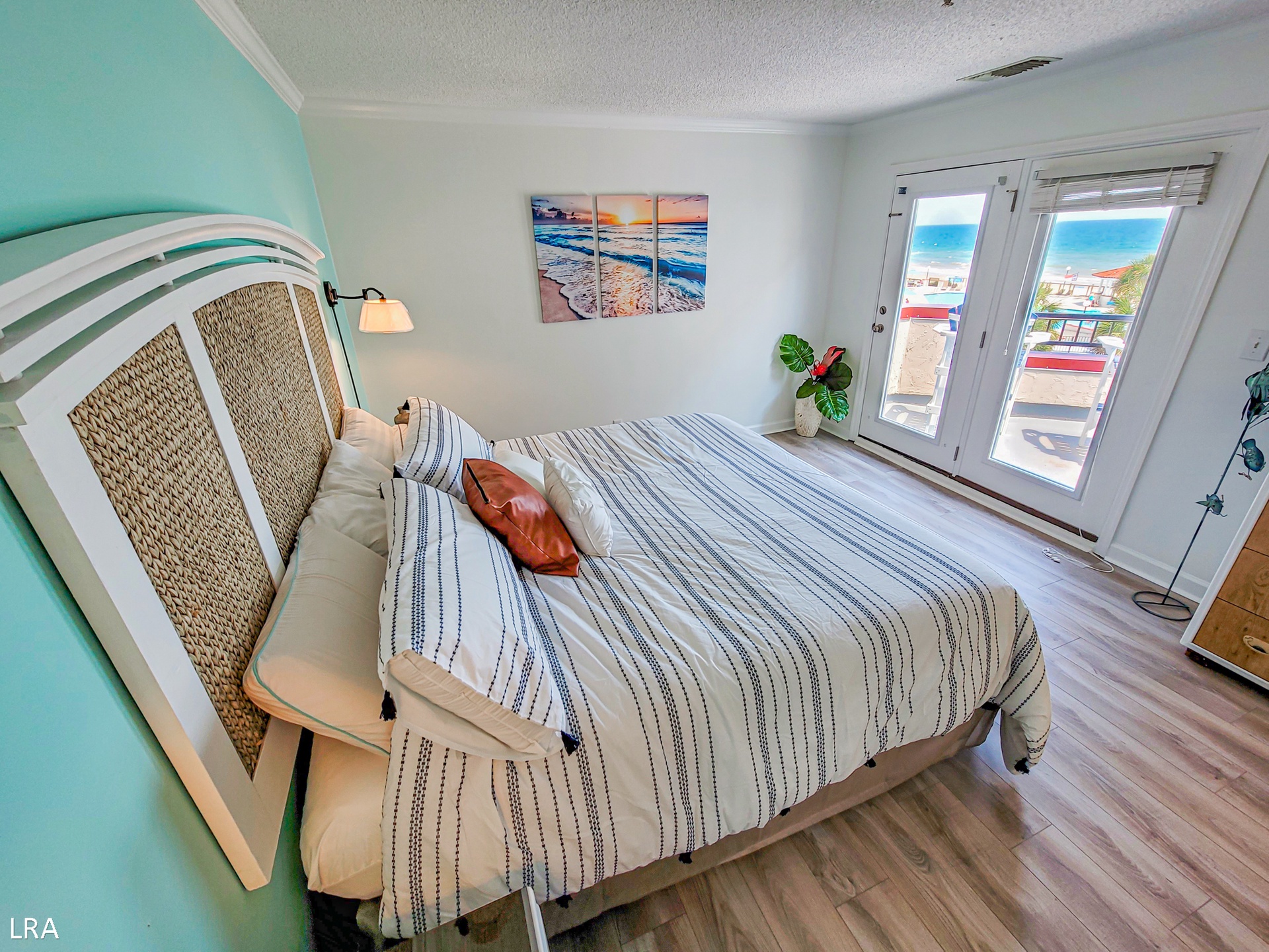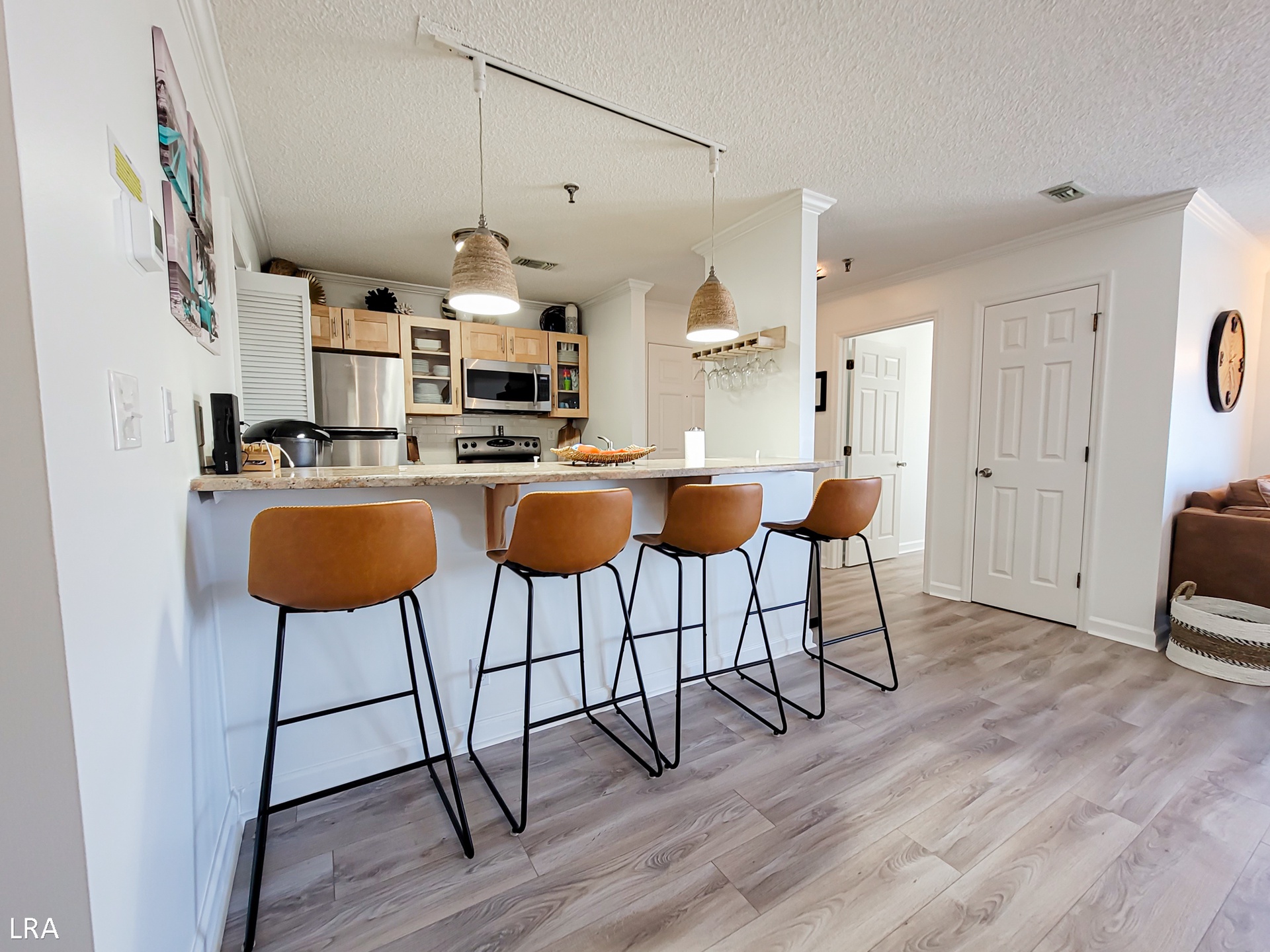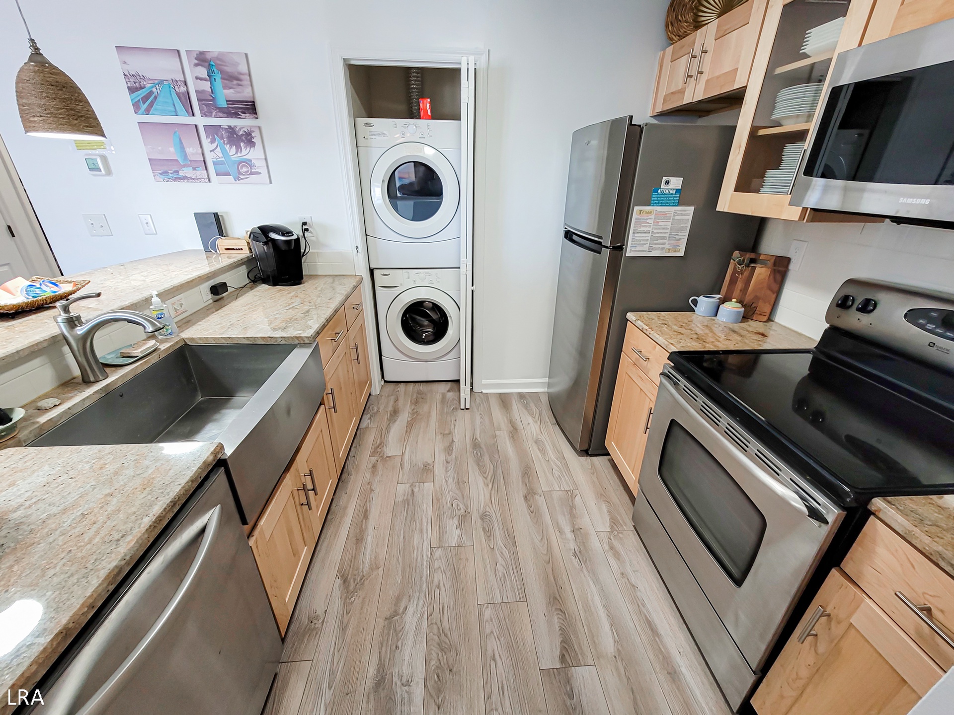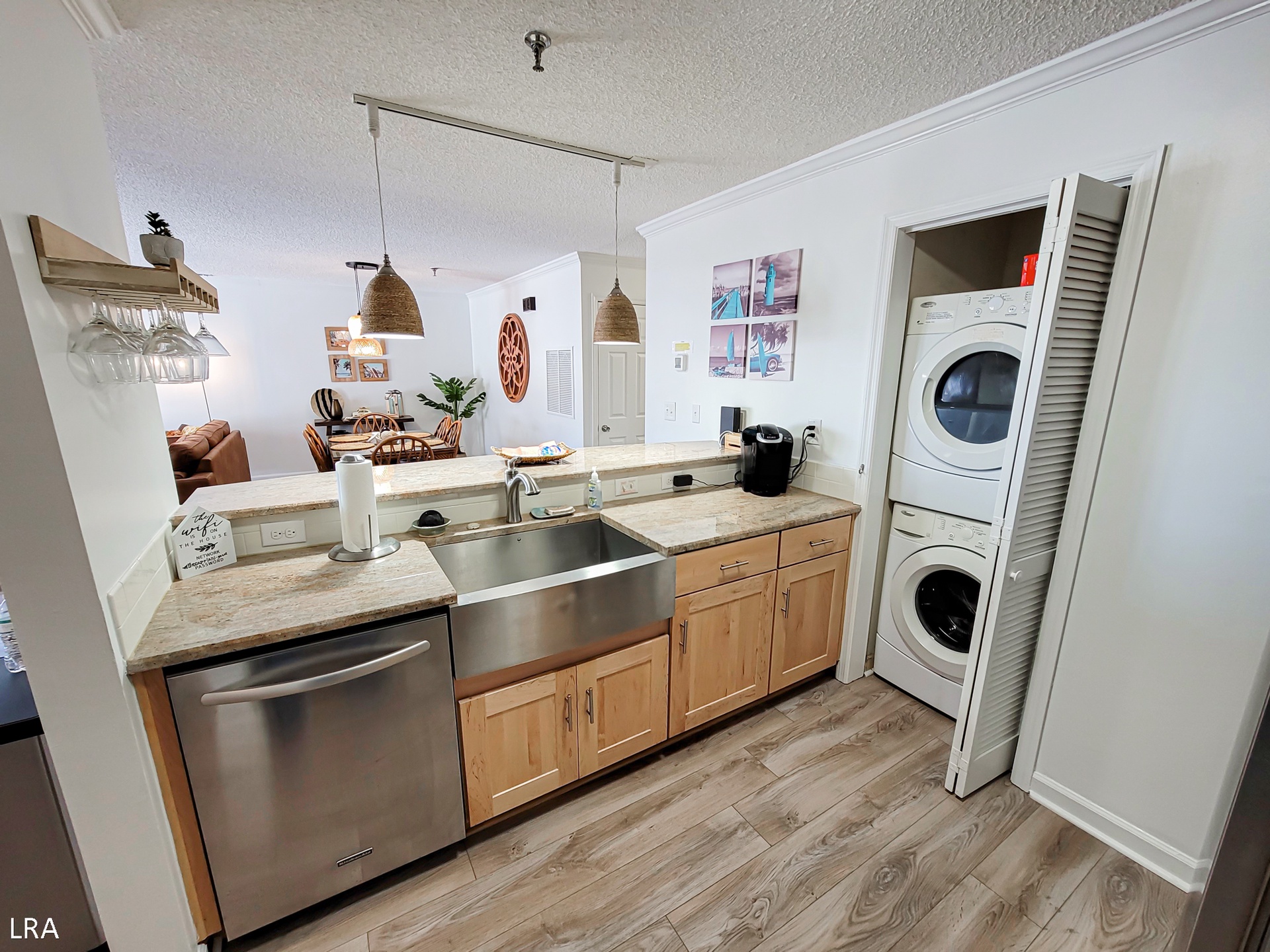 When you first arrive at the unit, use your Keyless Access code to get your vacation started! You are greeted by a foyer area that leads you to the kitchen, living room, and Master Bedroom. The spacious living area offers comfortable seating arrangements so that your group can gather together after a long day on the beach to watch a movie or catch up on your favorite shows. The large Flat Screen TV Smart offers cable service and access to streaming apps. Step out on the private deck where you can enjoy a stunning view of the courtyard and the Atlantic Ocean. Whip up amazing meals for your family in the stunning modern kitchen, which is equipped with stainless steel appliances, wooden cabinetry, a Farmhouse sink, and all of your basic cooking needs. A full-sized stackable washer and dryer are tucked away in a closet off the kitchen for your convenience. The dining area offers a large glass-top table with 6 chairs and 4 stools at the kitchen bar so everyone can enjoy their meals together.