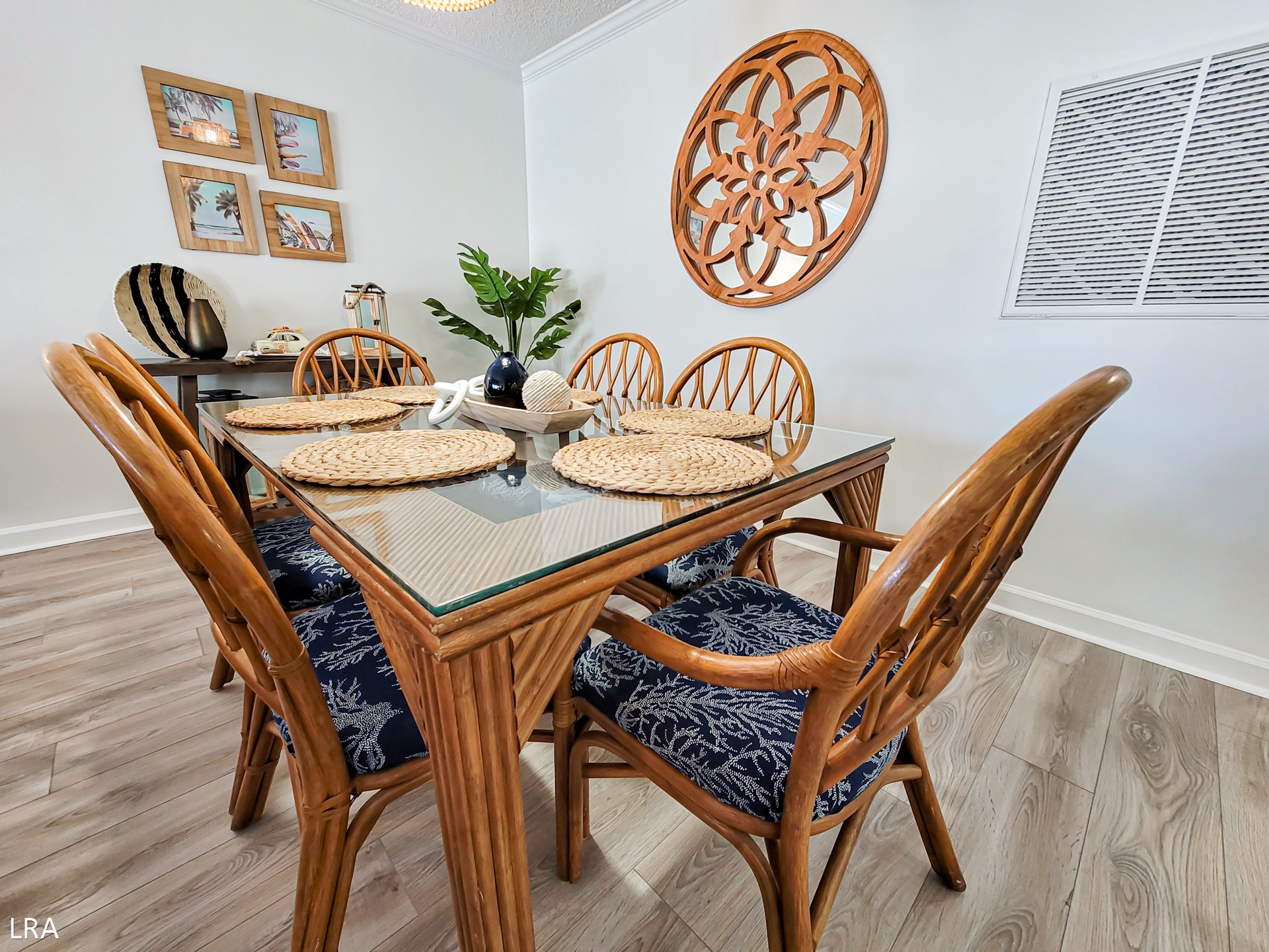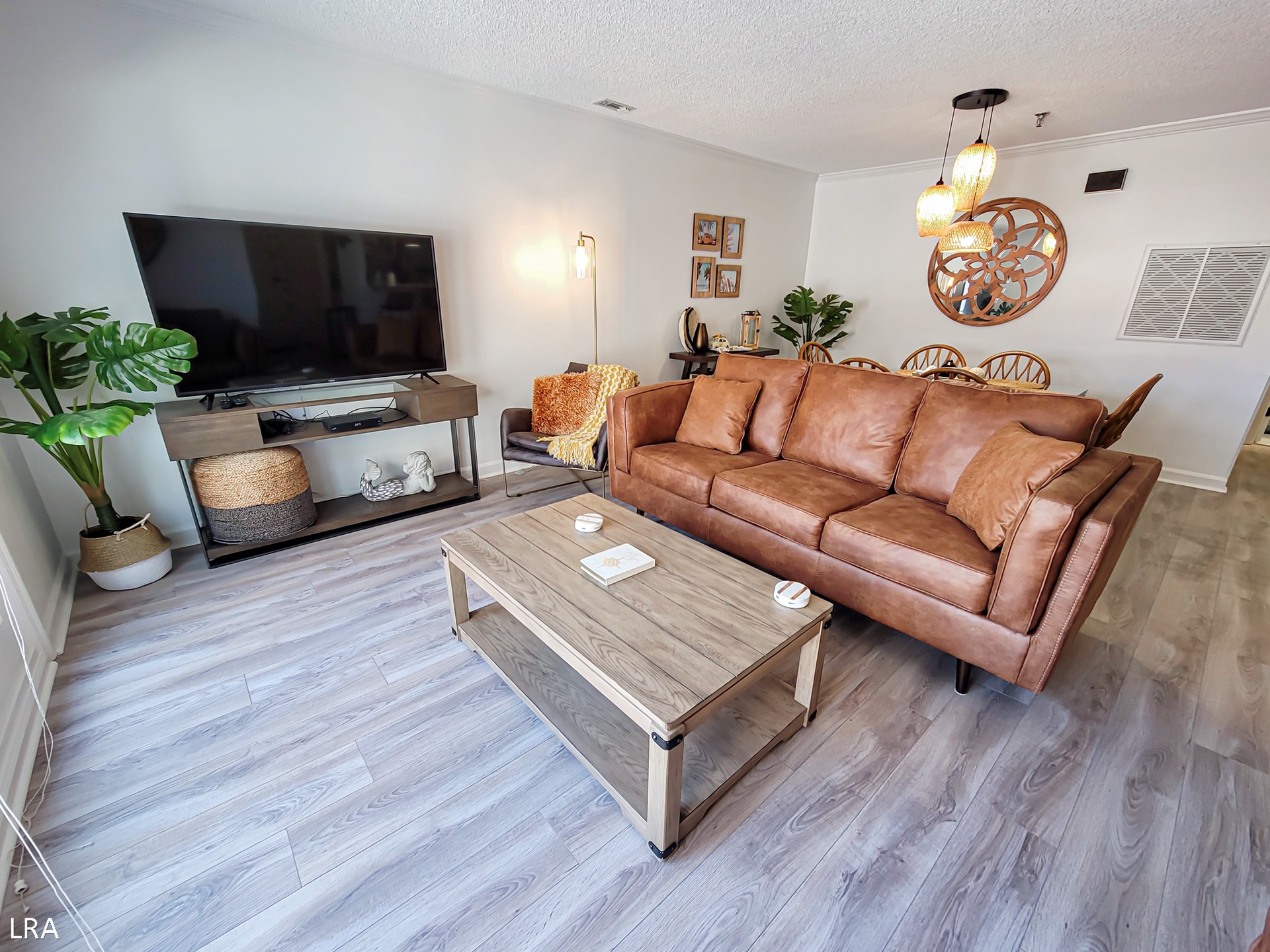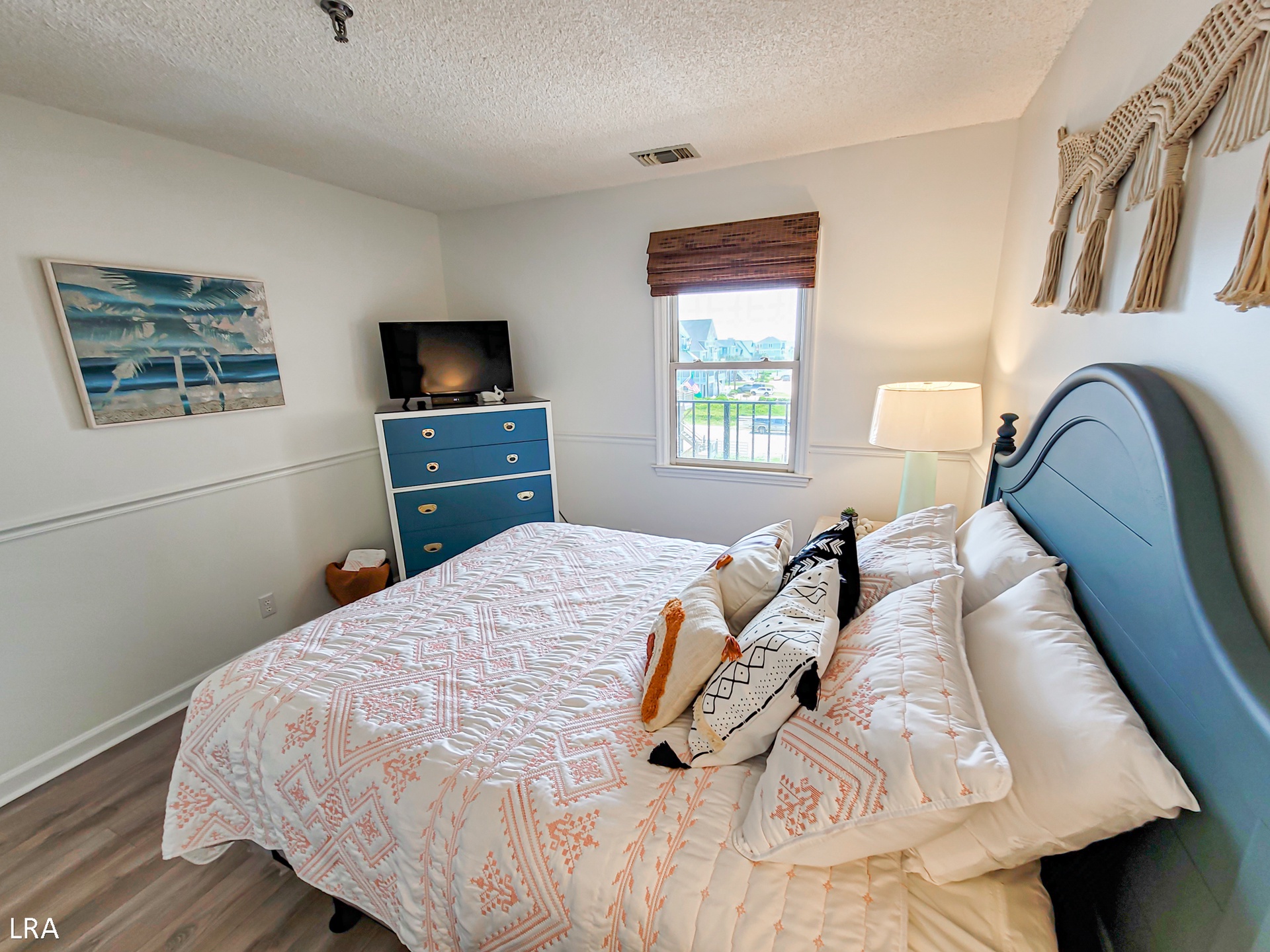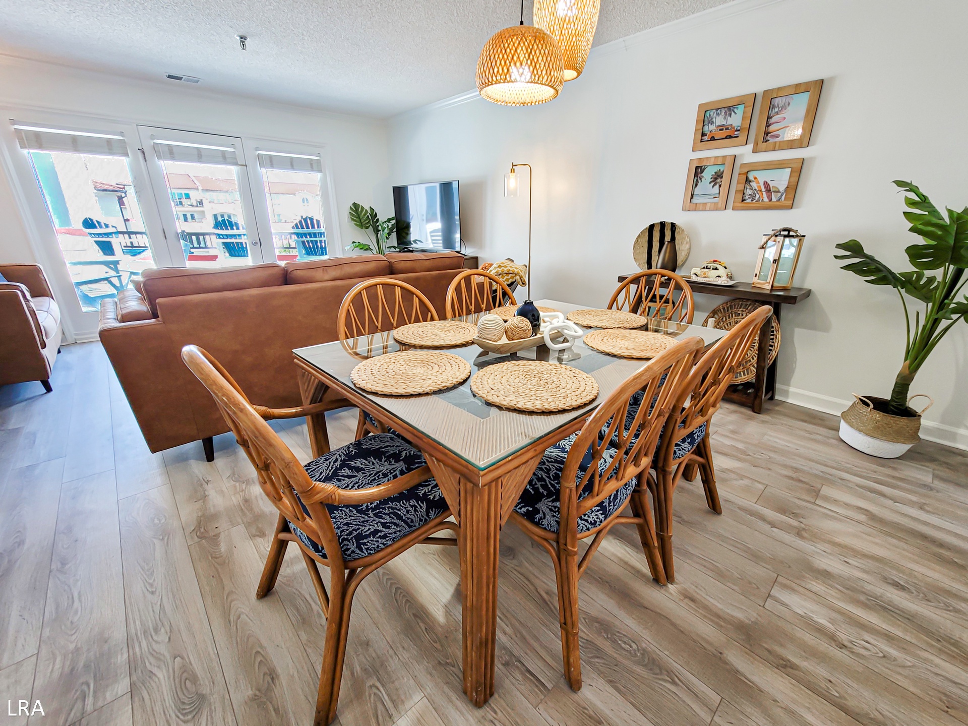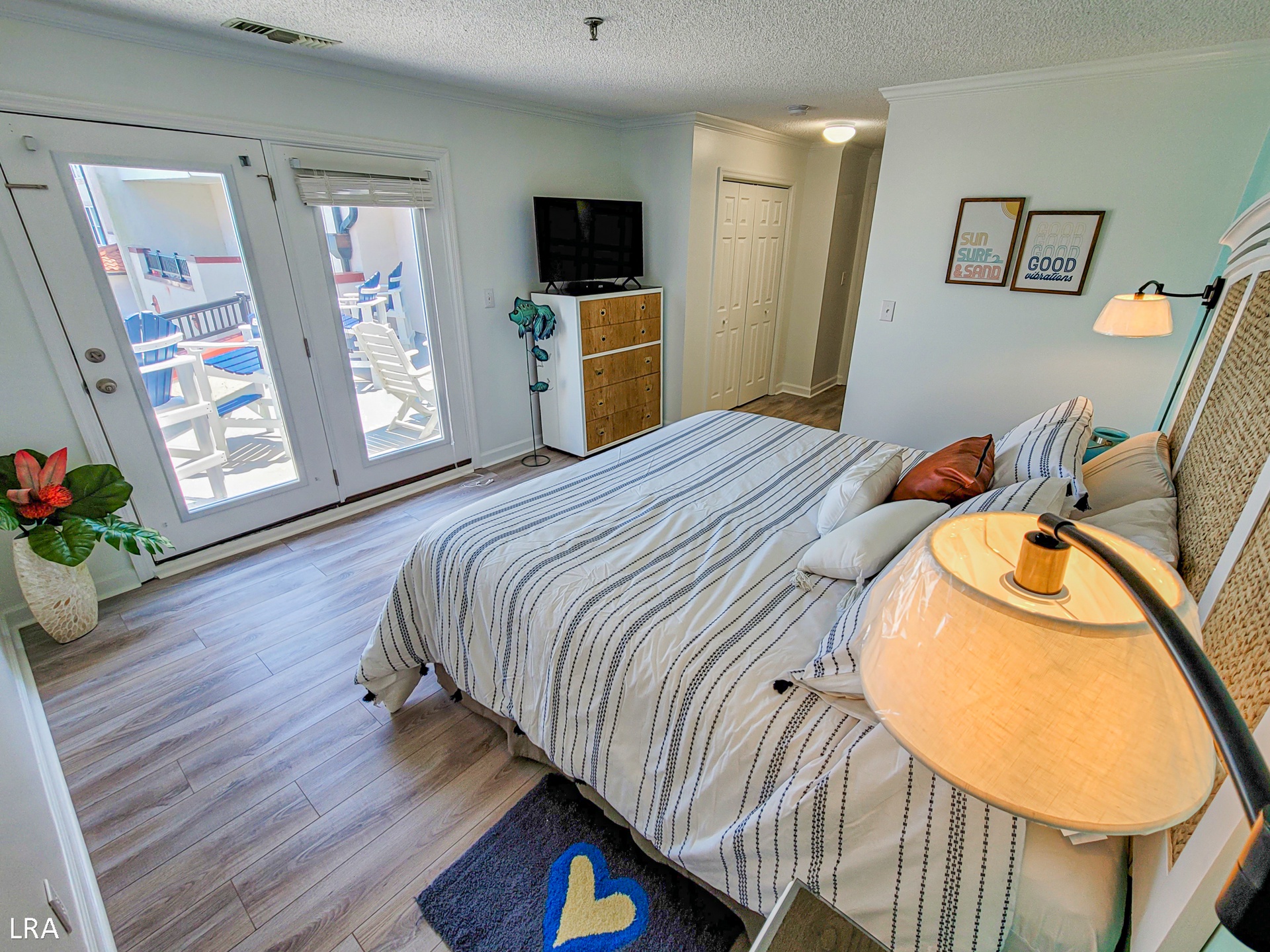 When you first arrive at the unit, use your Keyless Access code to get your vacation started! You are greeted by a foyer area that leads you to the kitchen, living room, and Master Bedroom. The spacious living area offers comfortable seating arrangements so that your group can gather together after a long day on the beach to watch a movie or catch up on your favorite shows. The large Flat Screen TV Smart offers cable service and access to streaming apps. Step out on the private deck where you can enjoy a stunning view of the courtyard and the Atlantic Ocean. Whip up amazing meals for your family in the stunning modern kitchen, which is equipped with stainless steel appliances, wooden cabinetry, a Farmhouse sink, and all of your basic cooking needs. A full-sized stackable washer and dryer are tucked away in a closet off the kitchen for your convenience. The dining area offers a large glass-top table with 6 chairs and 4 stools at the kitchen bar so everyone can enjoy their meals together.