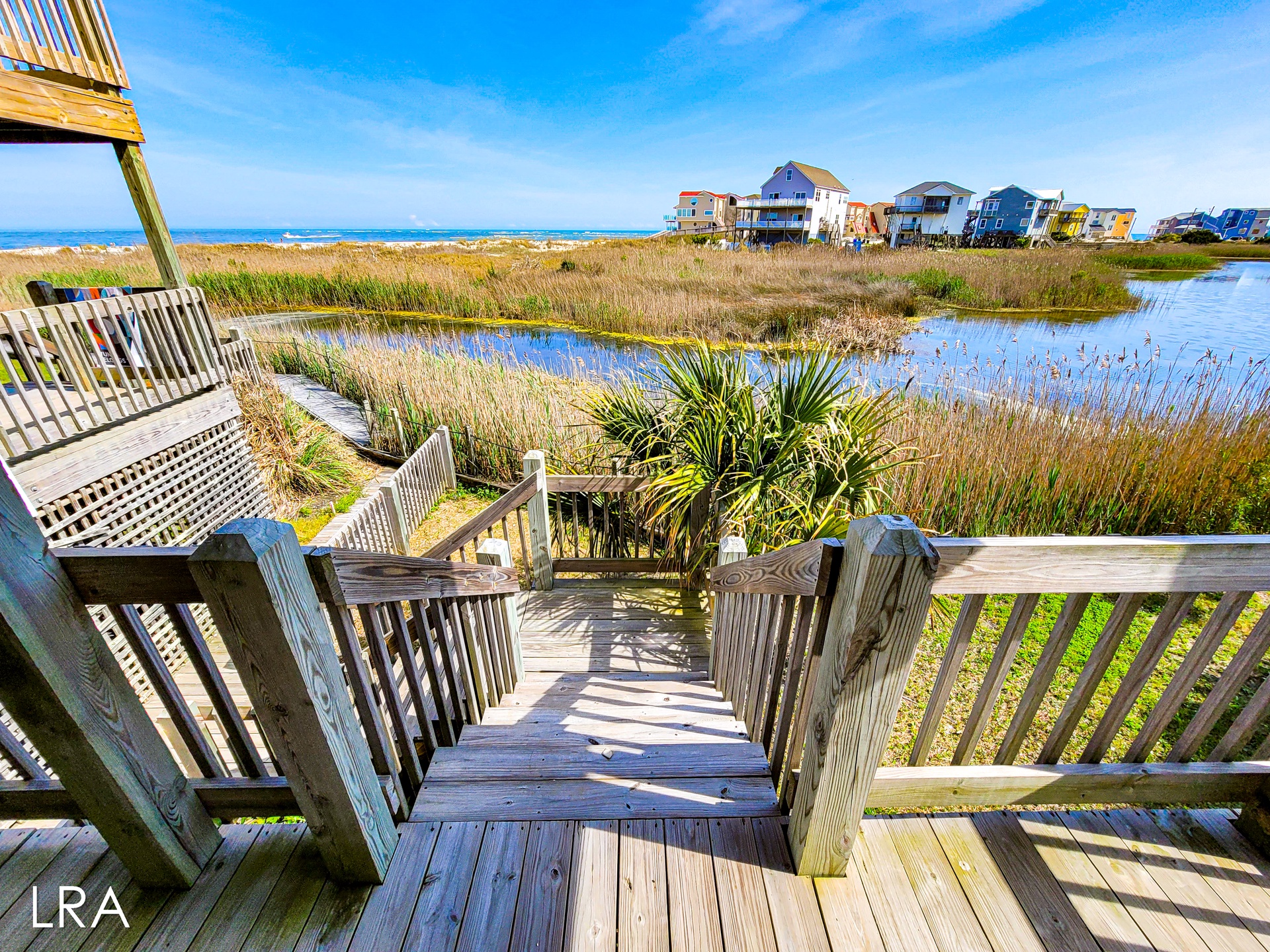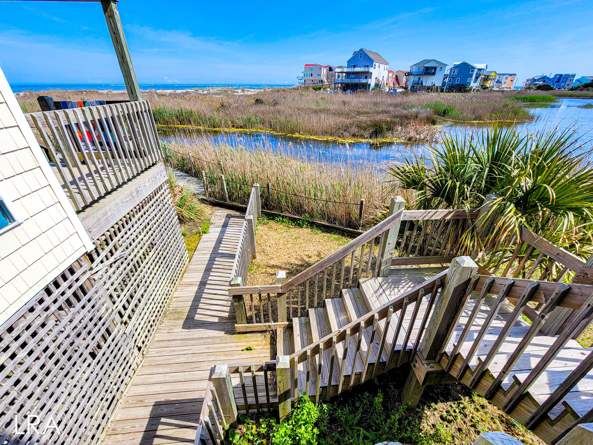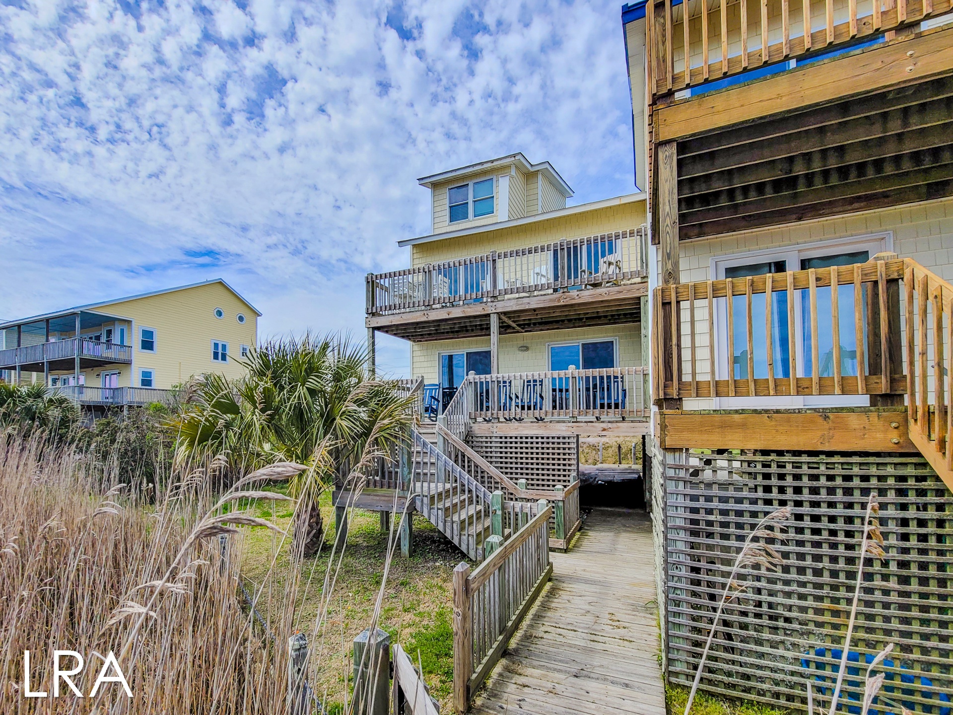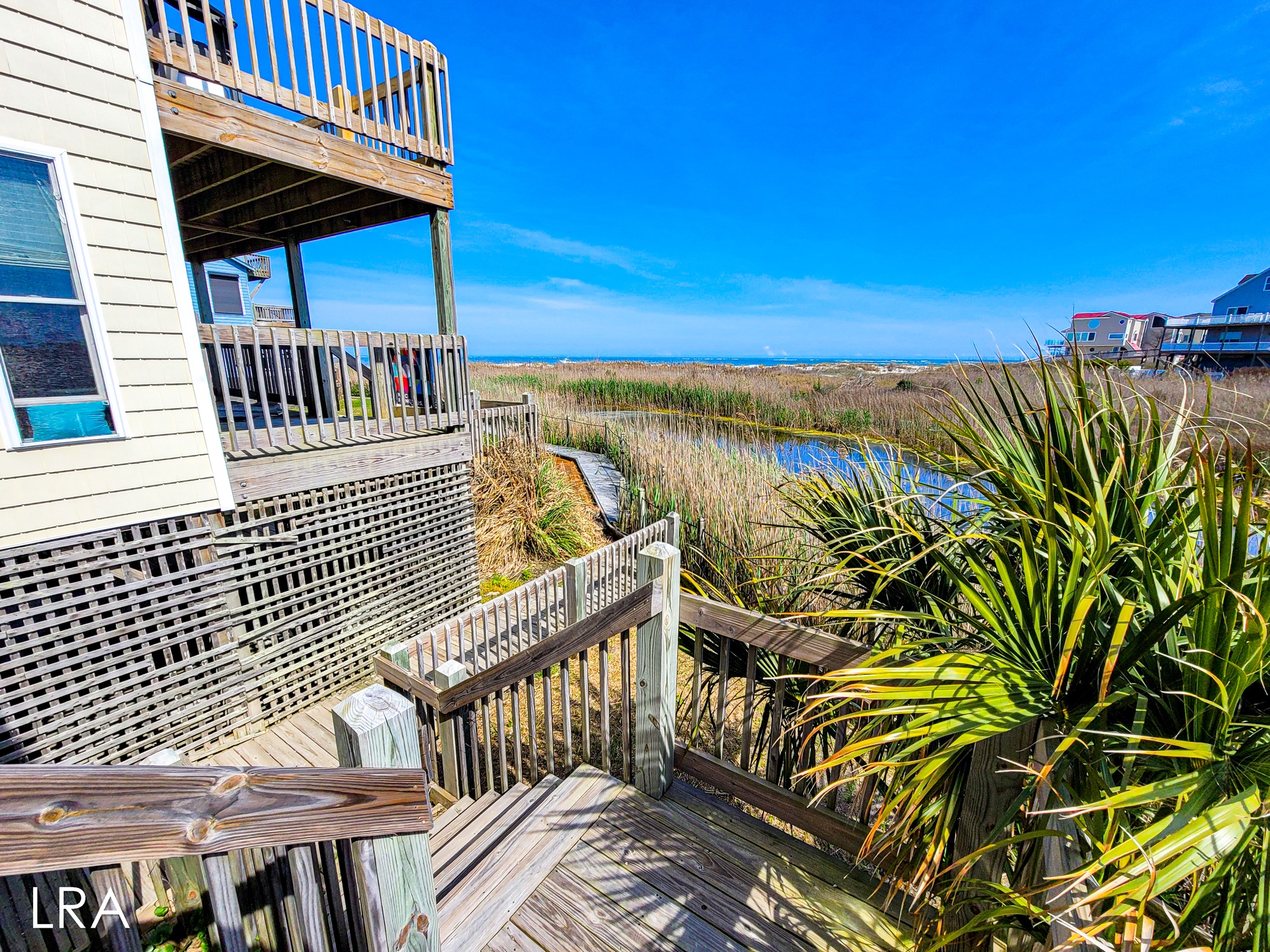 This house has an attached boardwalk that leads you directly to the beach. The boardwalk starts right behind the house.