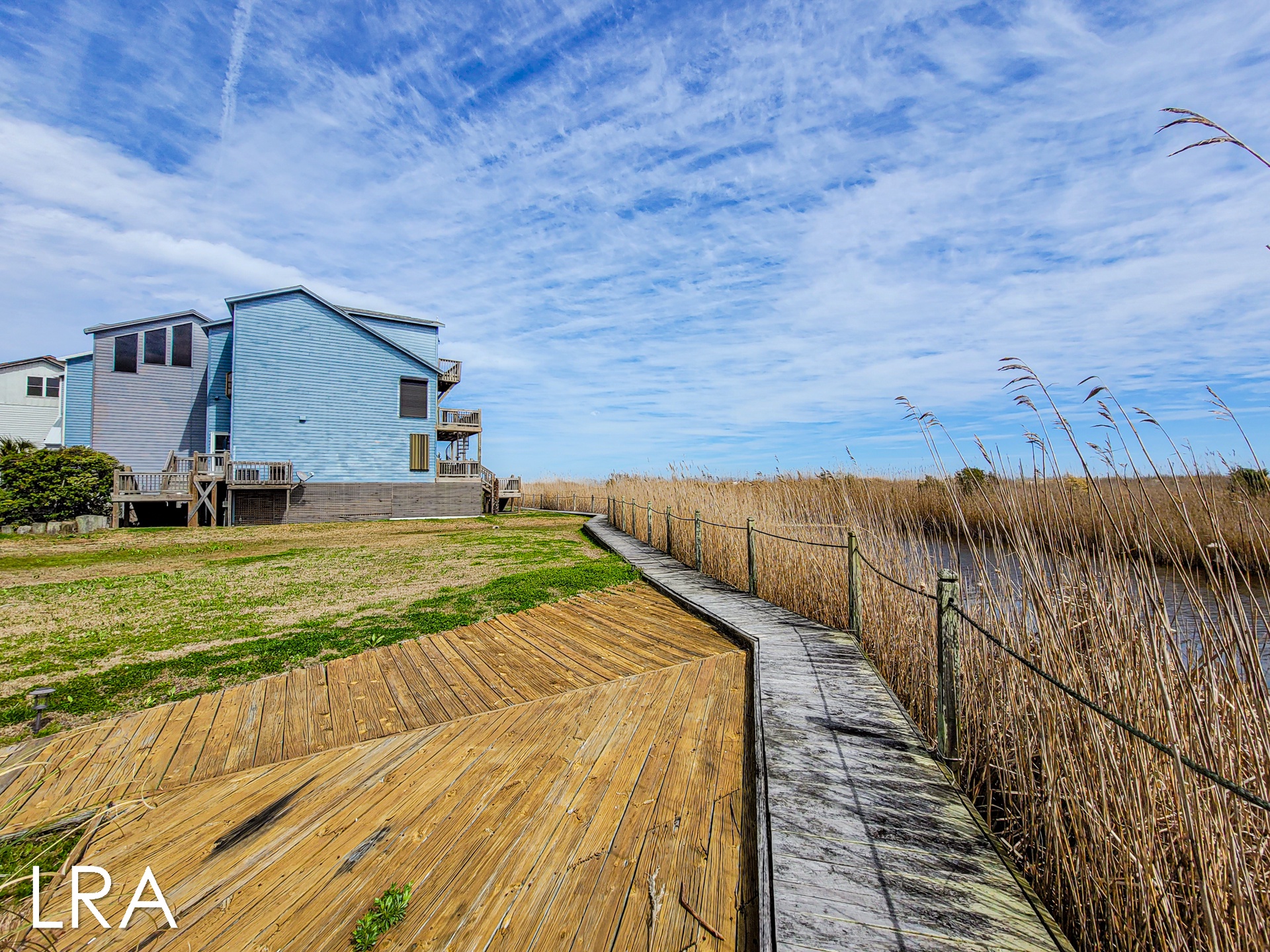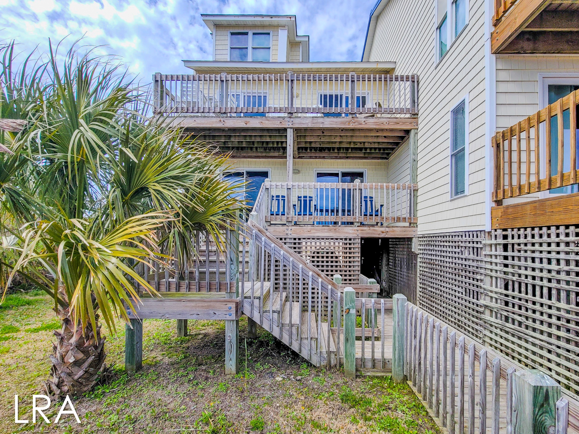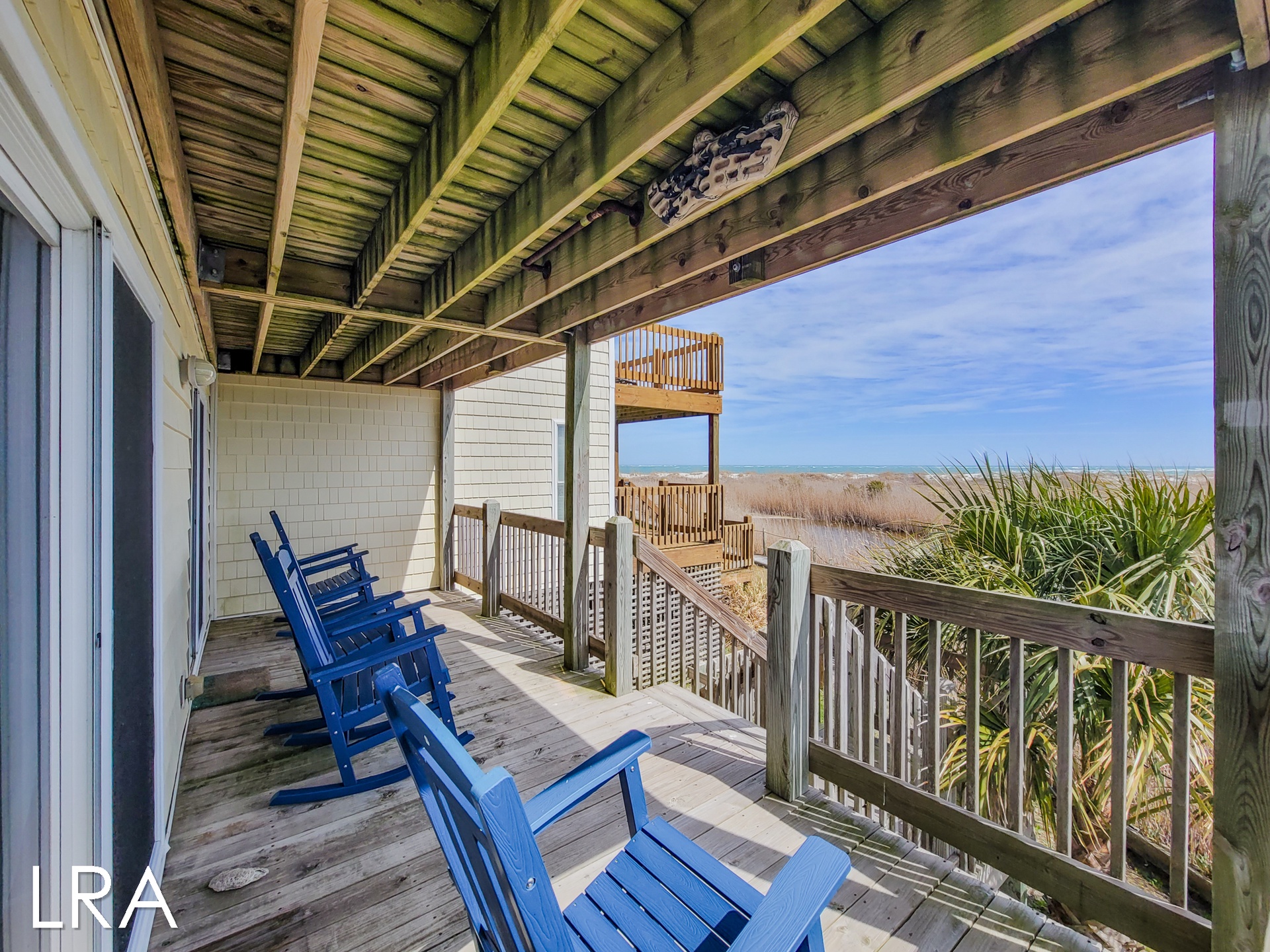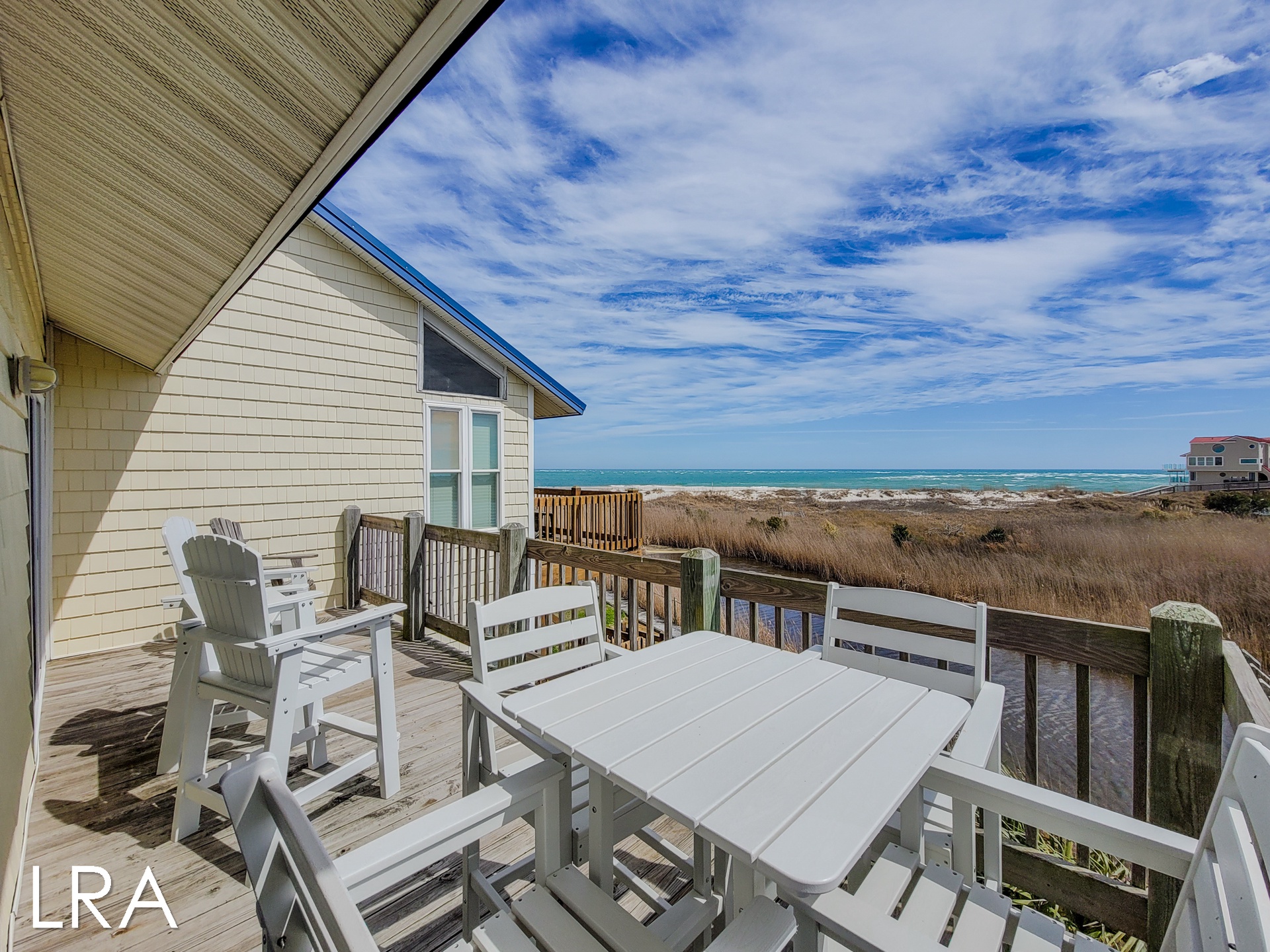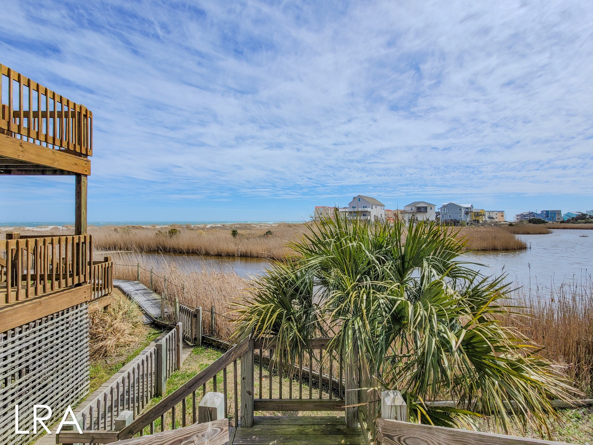 This house has an attached boardwalk that leads you directly to the beach. The boardwalk starts right behind the house.