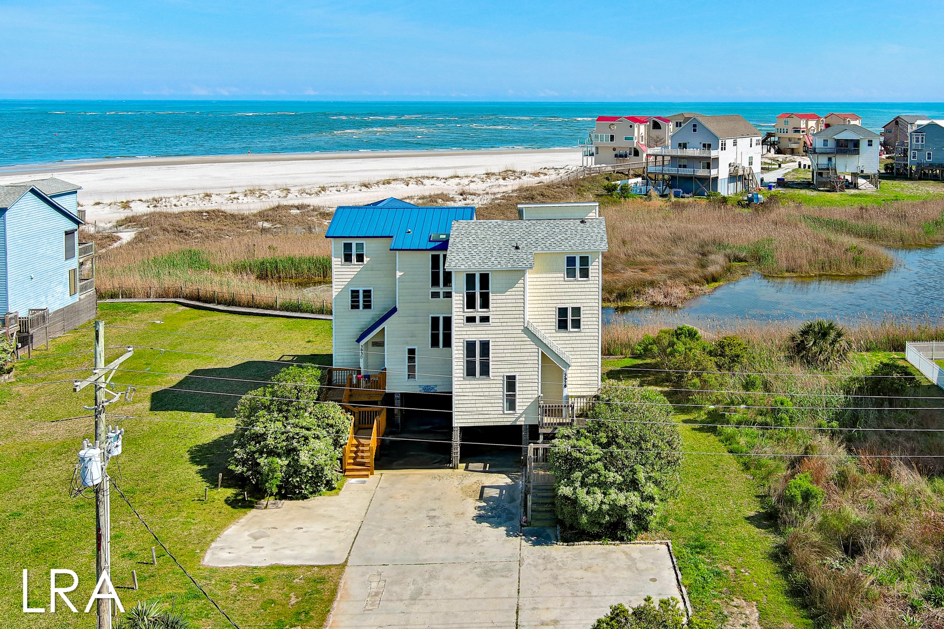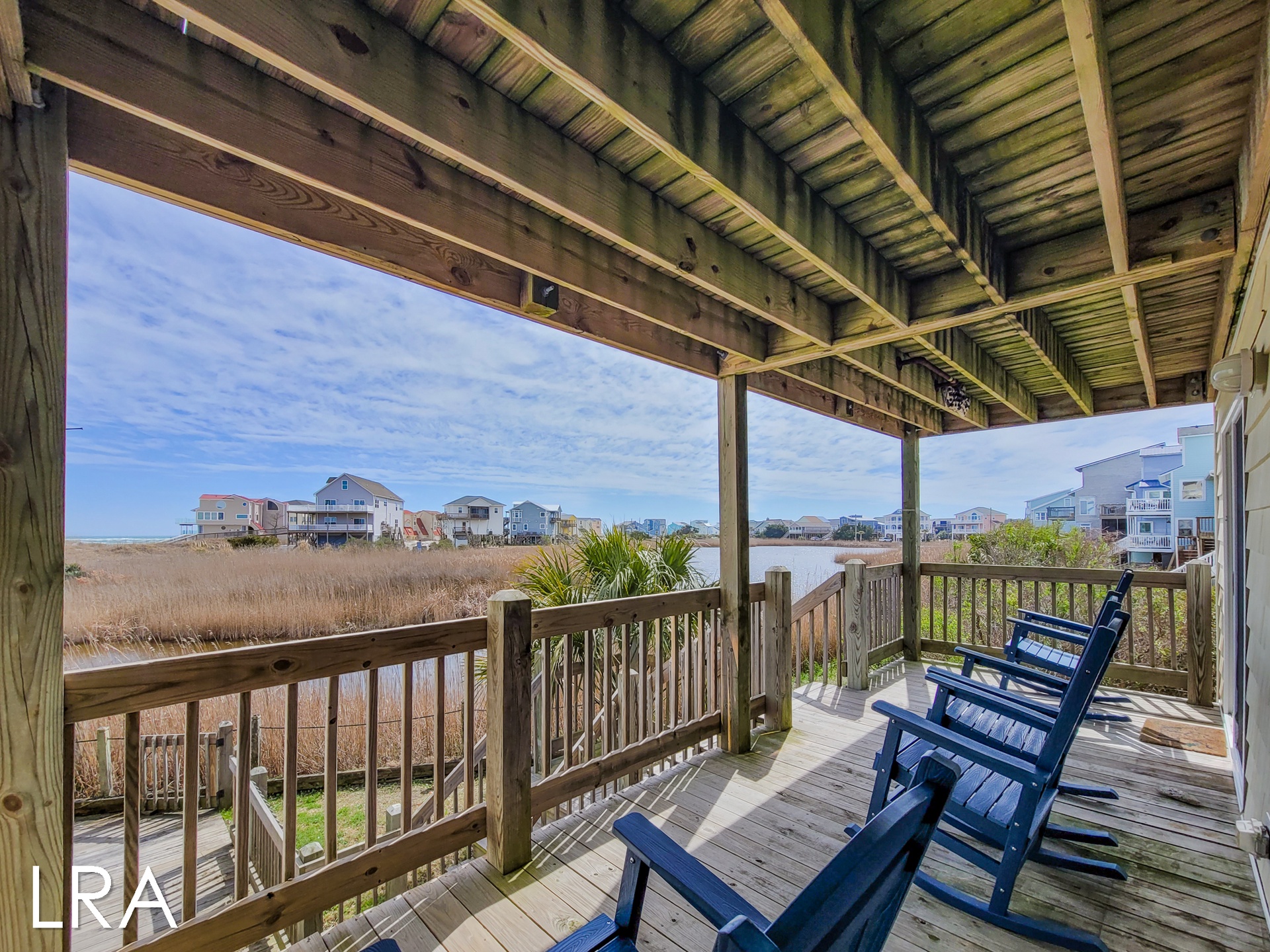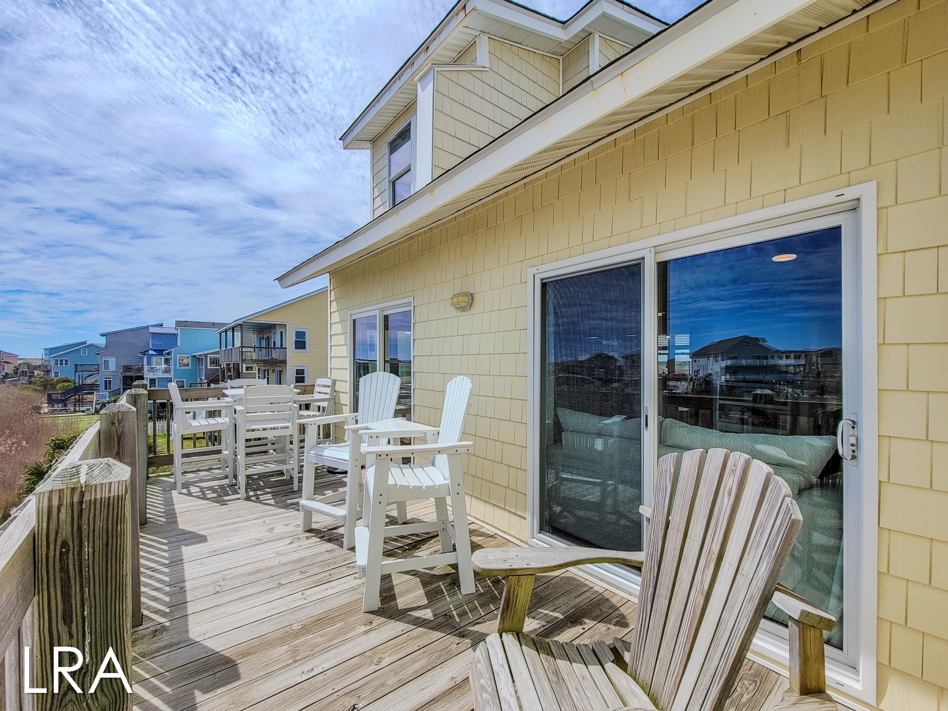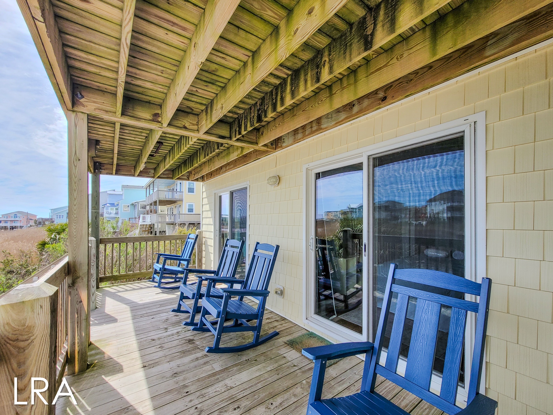 This house has an attached boardwalk that leads you directly to the beach. The boardwalk starts right behind the house.