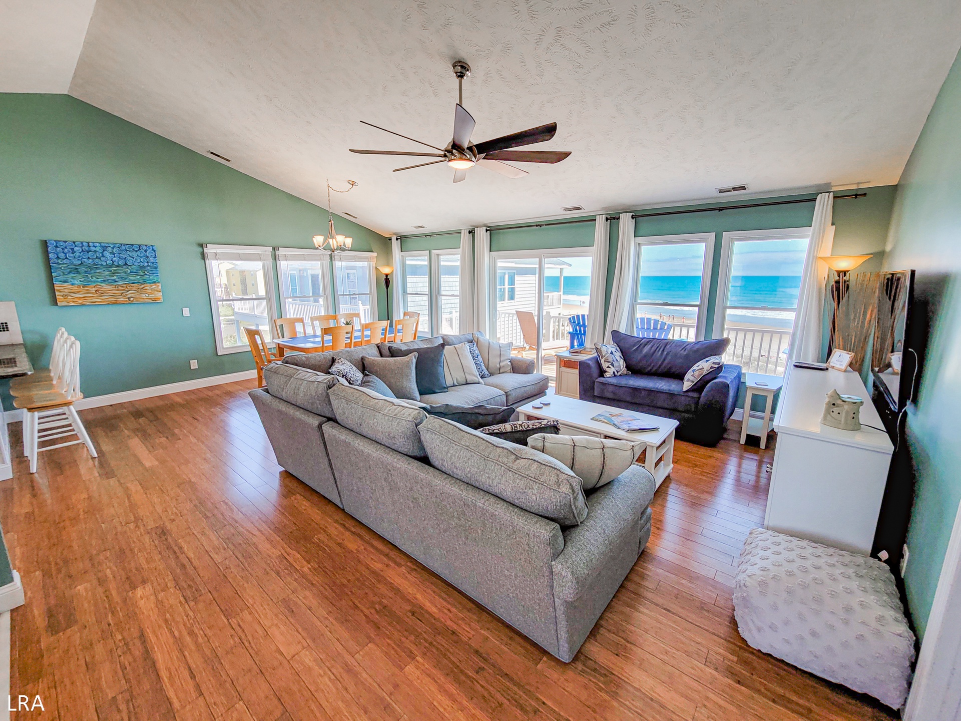 The top floor of Captain's Quarters features a spacious kitchen with granite countertops, seamlessly flowing into the open and inviting living and dining area adorned with beautiful bamboo flooring. The top floor also boasts a master suite with an ocean view and separate access to the upper deck. Additionally, there is a double bunk room that provides ample space for kids to unwind and enjoy. On the first floor, you'll find a second master suite, two additional bedrooms, and a bathroom. Each room offers ocean views and sliding glass doors for easy access to the deck.