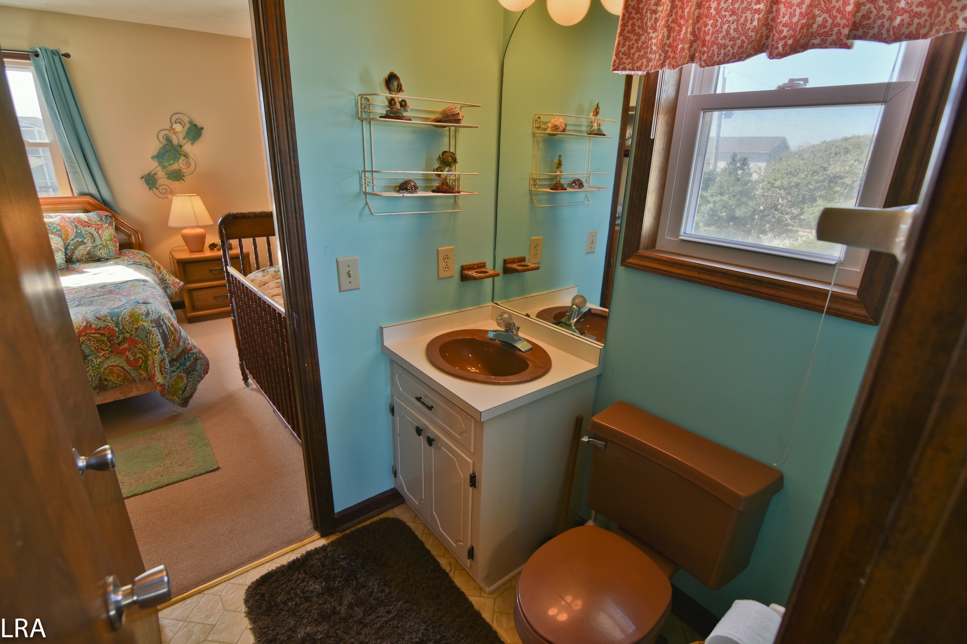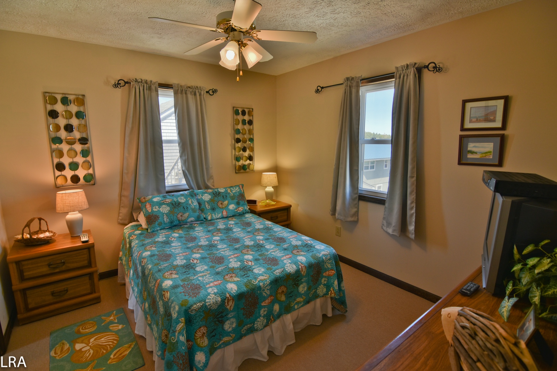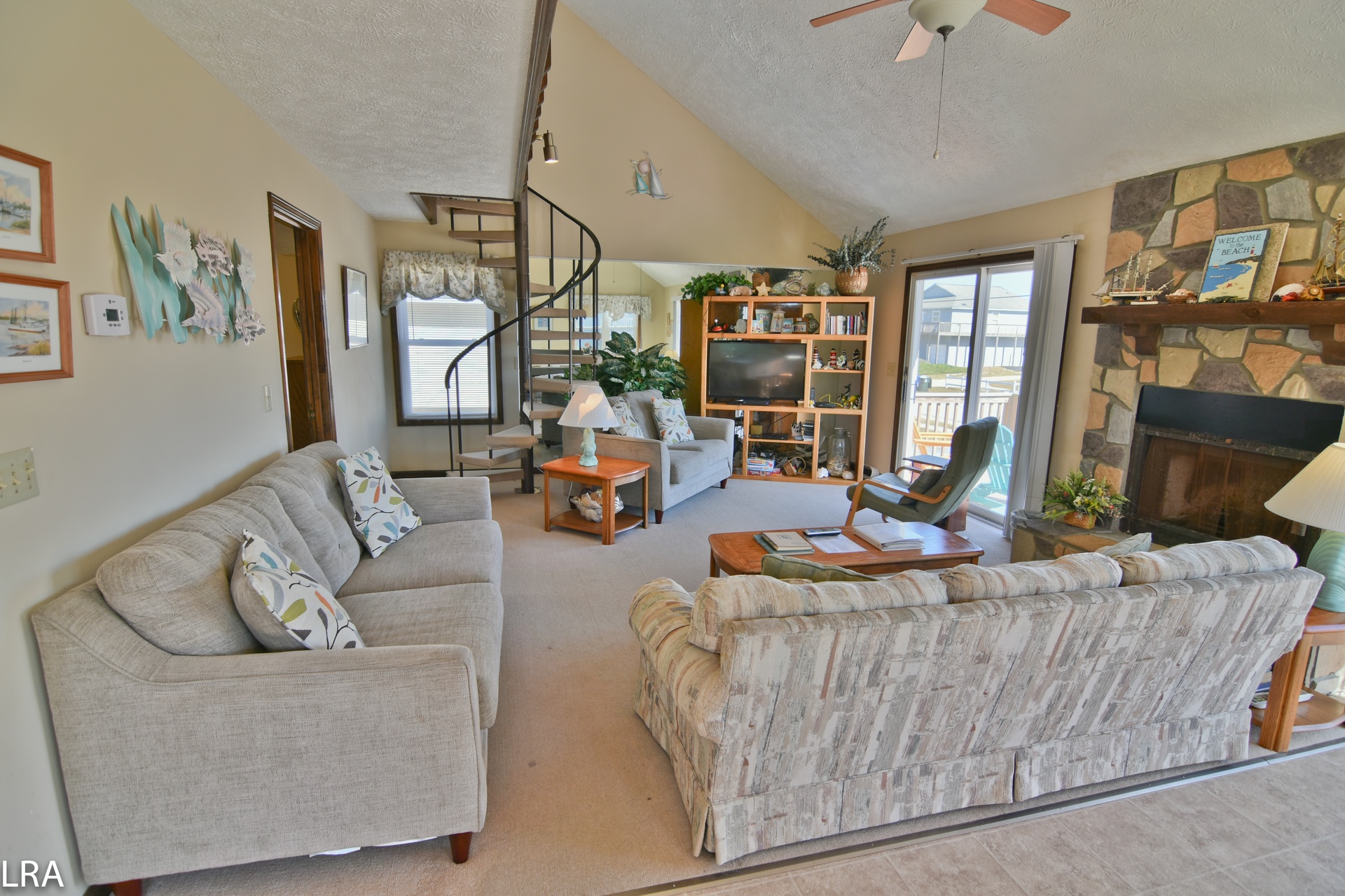 The heart of the home, the living area, revolves around another set of sliding glass doors that lead to the deck facing the ocean. Behind the living area, you'll discover the master suite, a tranquil retreat adorned with a queen bed and a private bathroom. Ascend the elegant spiral staircase to find the second and third bedrooms, as well as a second bathroom. The upstairs hallway overlooks the lower level, infusing the space with ample natural light and a cozy atmosphere.
