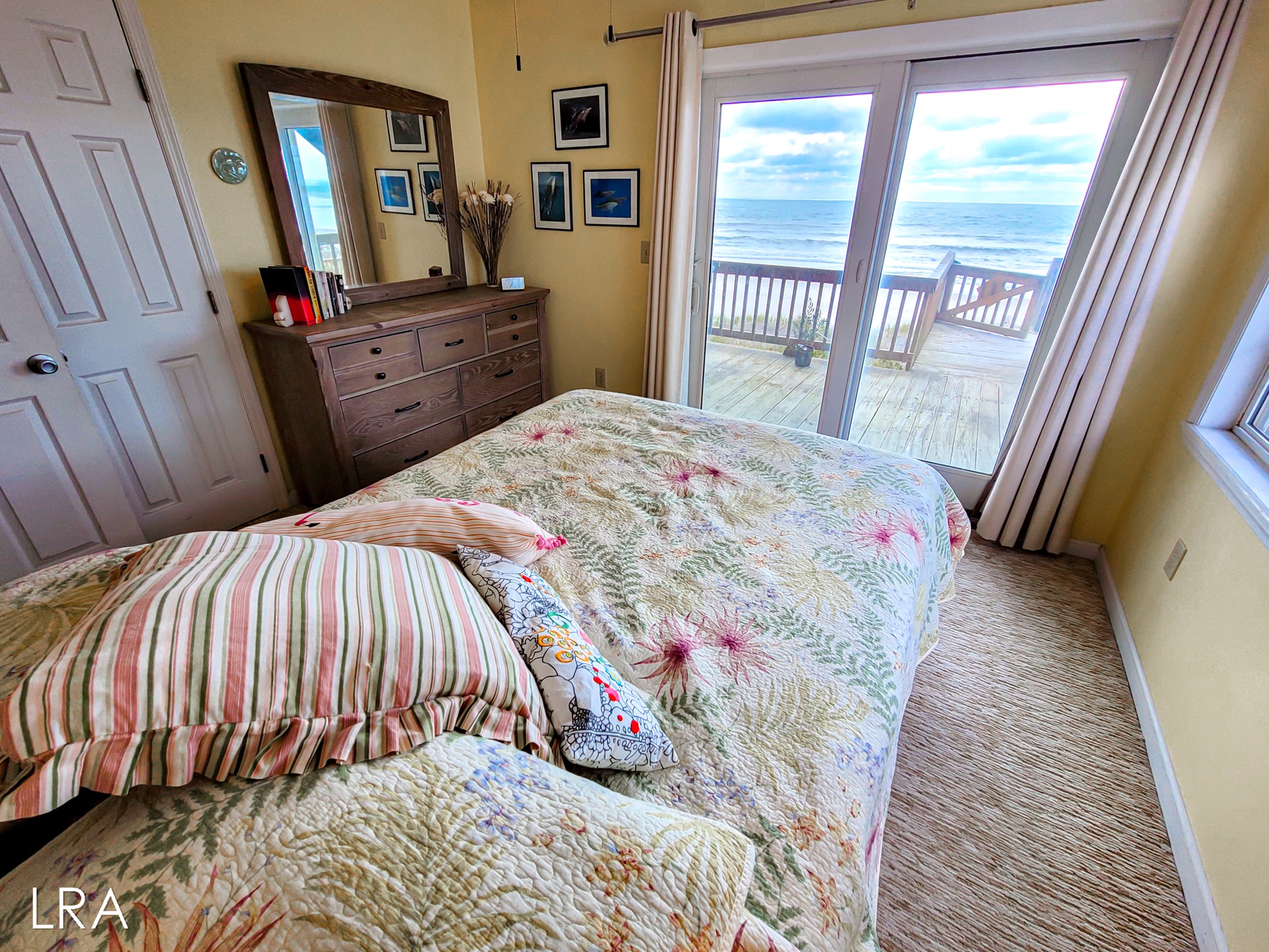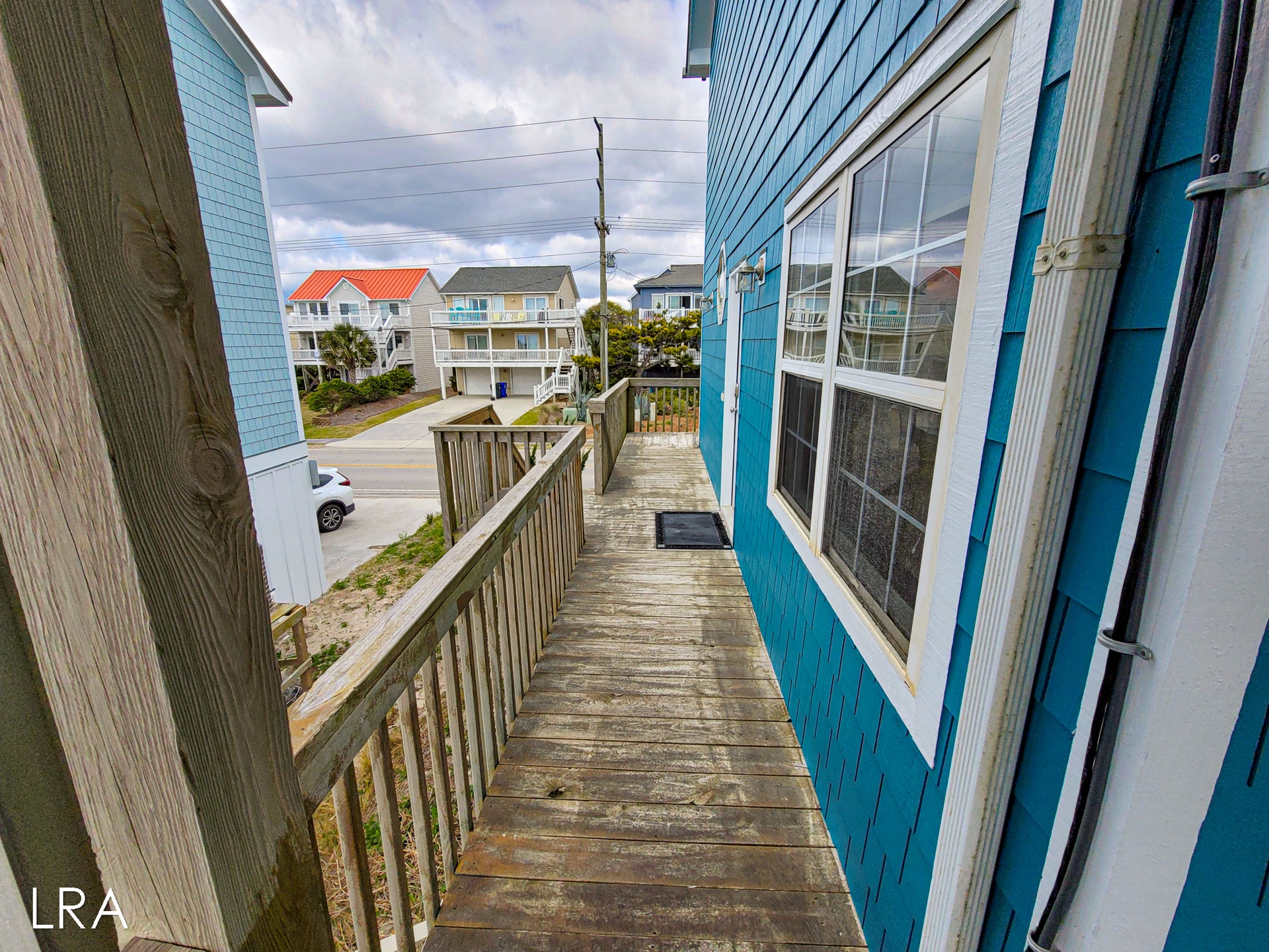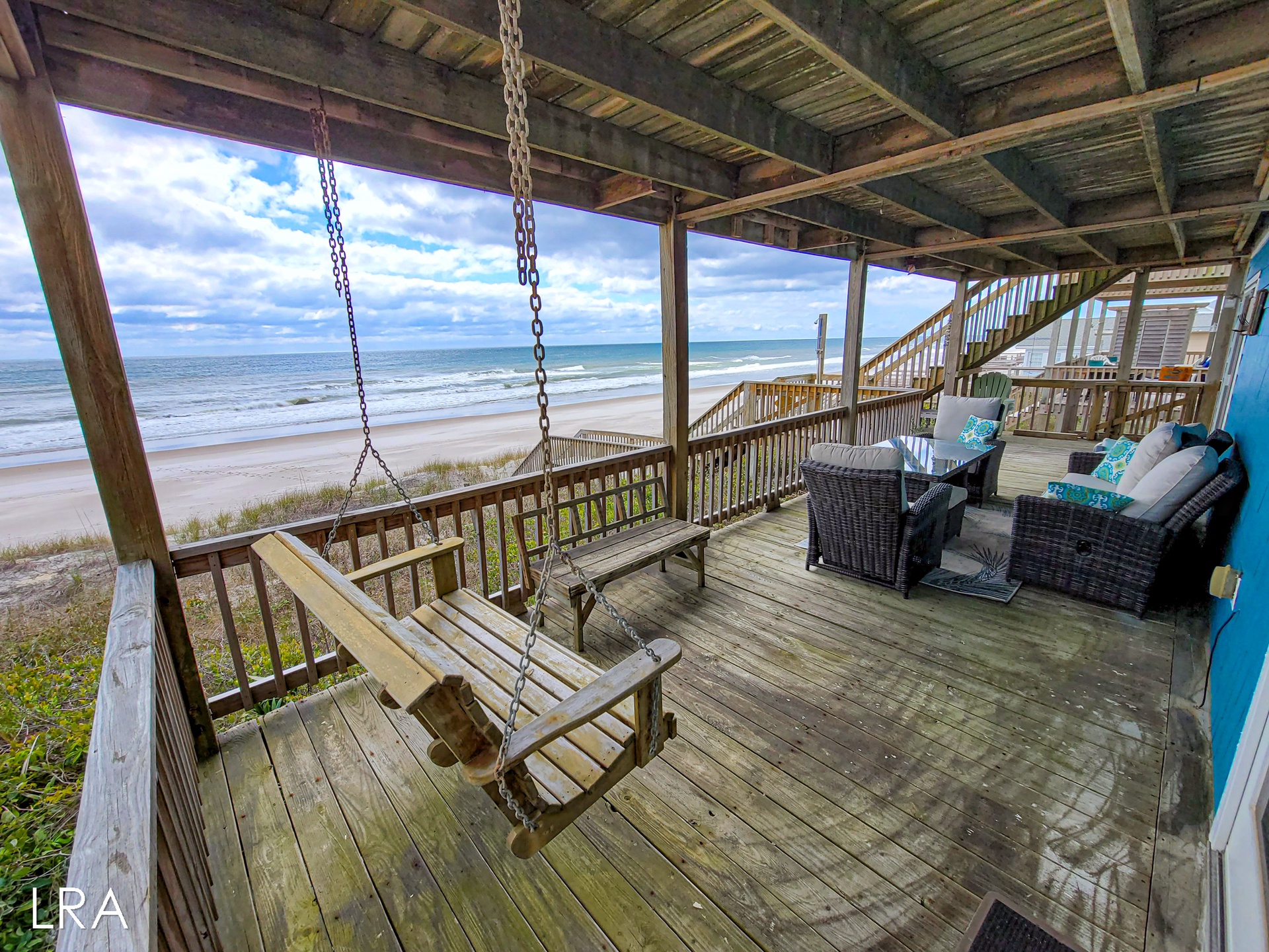 When you first arrive, you are greeted by a paved driveway that offers parking for 3 cars. Take the stairs on the side of the property up to the main door and use your keyless access code to get your vacation started. You enter on the bedroom level of this reverse floor plan property. The first bedroom offers a queen bed and access to the covered first-floor oceanfront deck. The second bedroom also offers a queen bed, has a flat-screen TV, and offers access to the covered first-floor oceanfront deck. These bedrooms share a full bath with a shower tub combo that is conveniently located in the hall for easy access. The final bedroom is the Master Suite which offers a queen bed, Flat screen TV, and a Private full bath with a large Shower Stall. A full-sized washer and dryer are also located on this floor for your convenience.