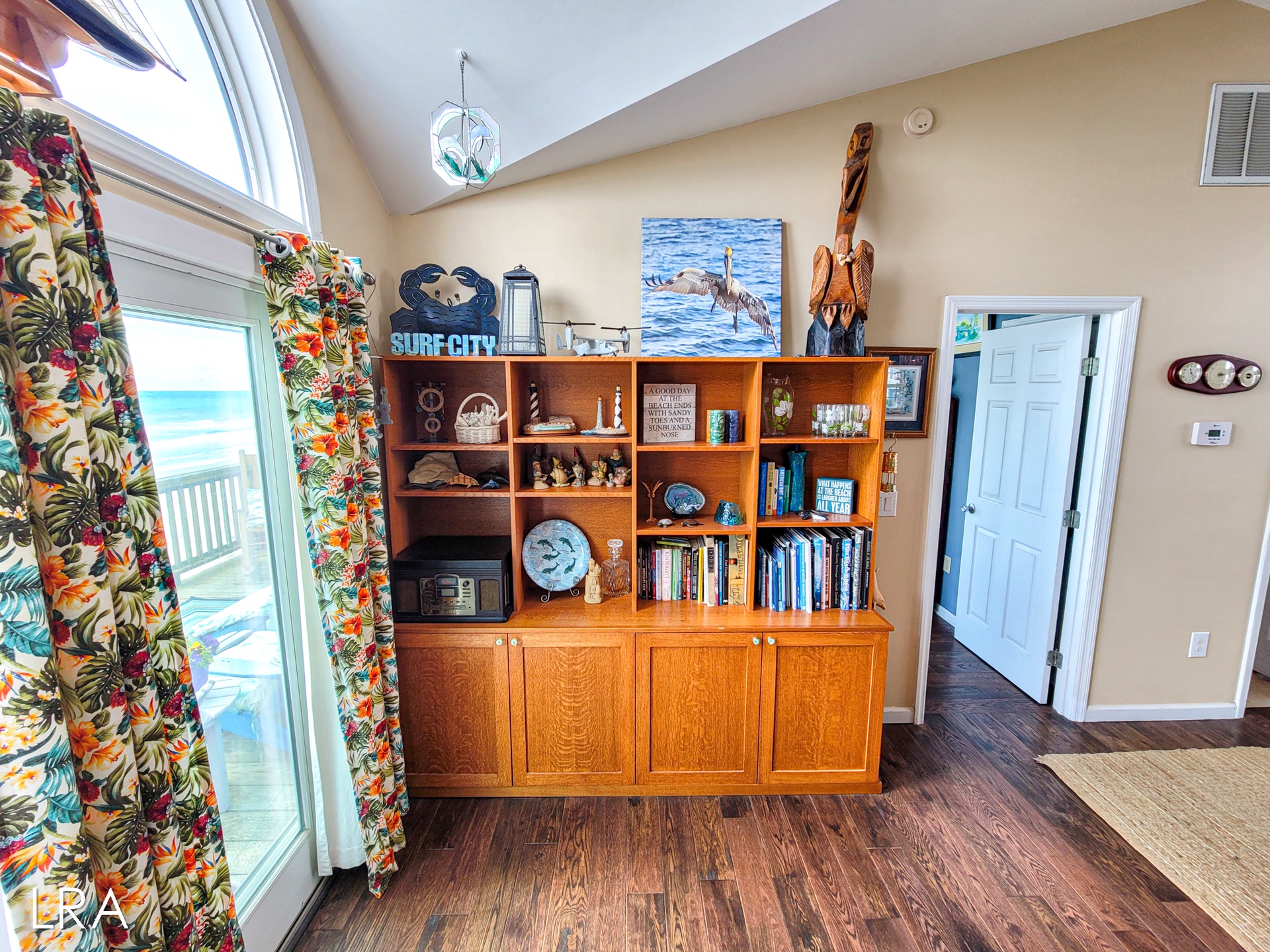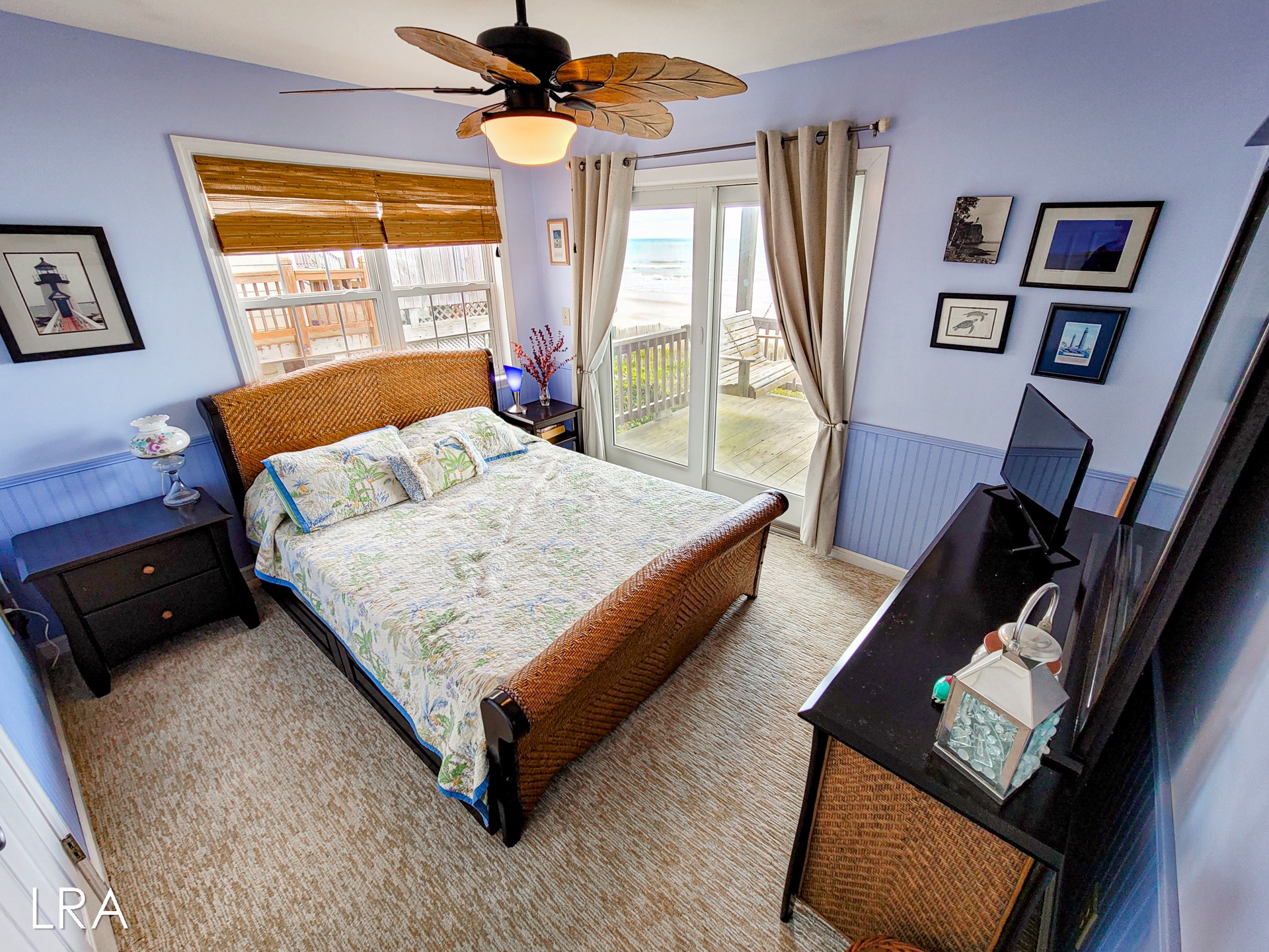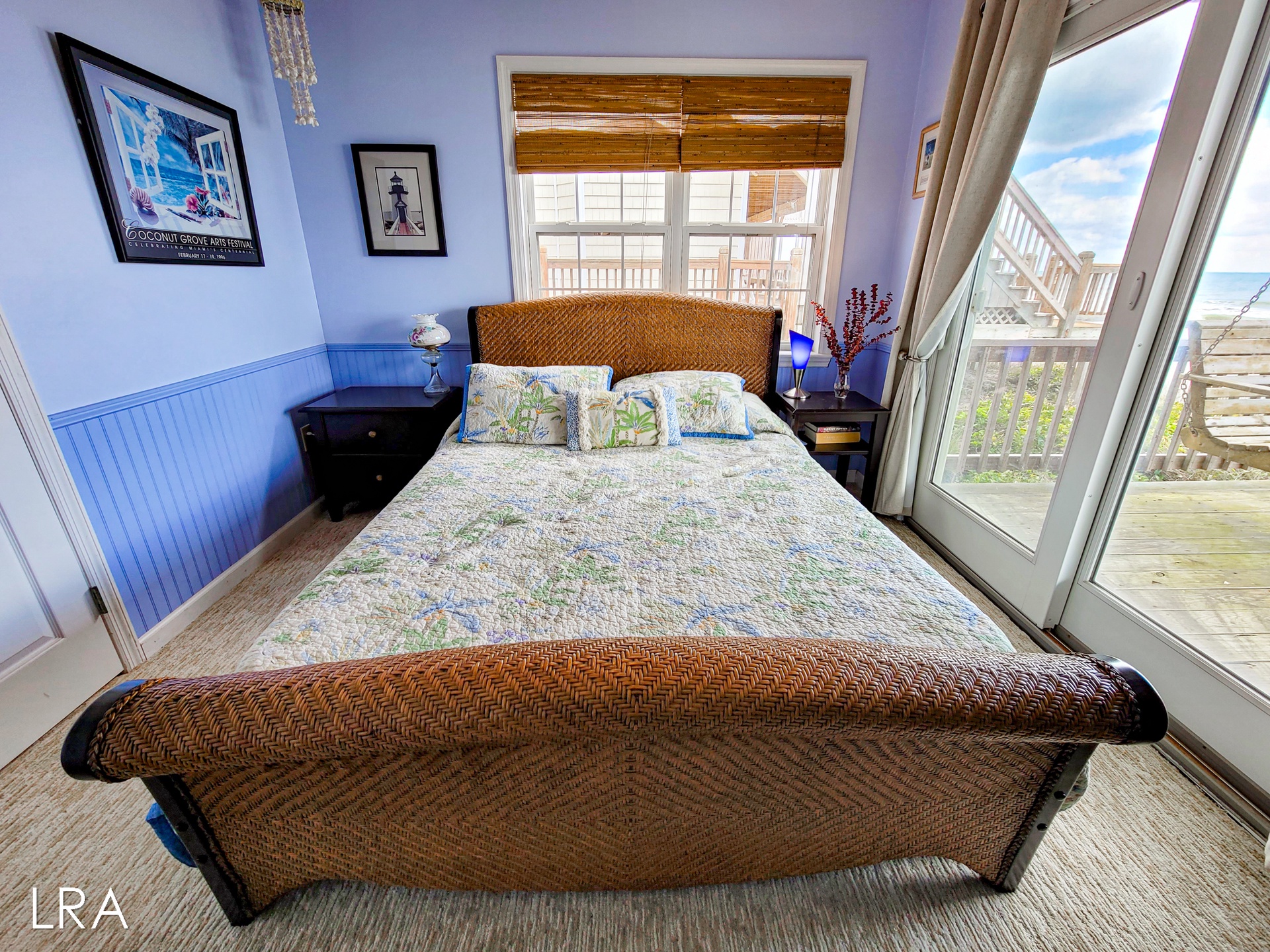 When you first arrive, you are greeted by a paved driveway that offers parking for 3 cars. Take the stairs on the side of the property up to the main door and use your keyless access code to get your vacation started. You enter on the bedroom level of this reverse floor plan property. The first bedroom offers a queen bed and access to the covered first-floor oceanfront deck. The second bedroom also offers a queen bed, has a flat-screen TV, and offers access to the covered first-floor oceanfront deck. These bedrooms share a full bath with a shower tub combo that is conveniently located in the hall for easy access. The final bedroom is the Master Suite which offers a queen bed, Flat screen TV, and a Private full bath with a large Shower Stall. A full-sized washer and dryer are also located on this floor for your convenience.