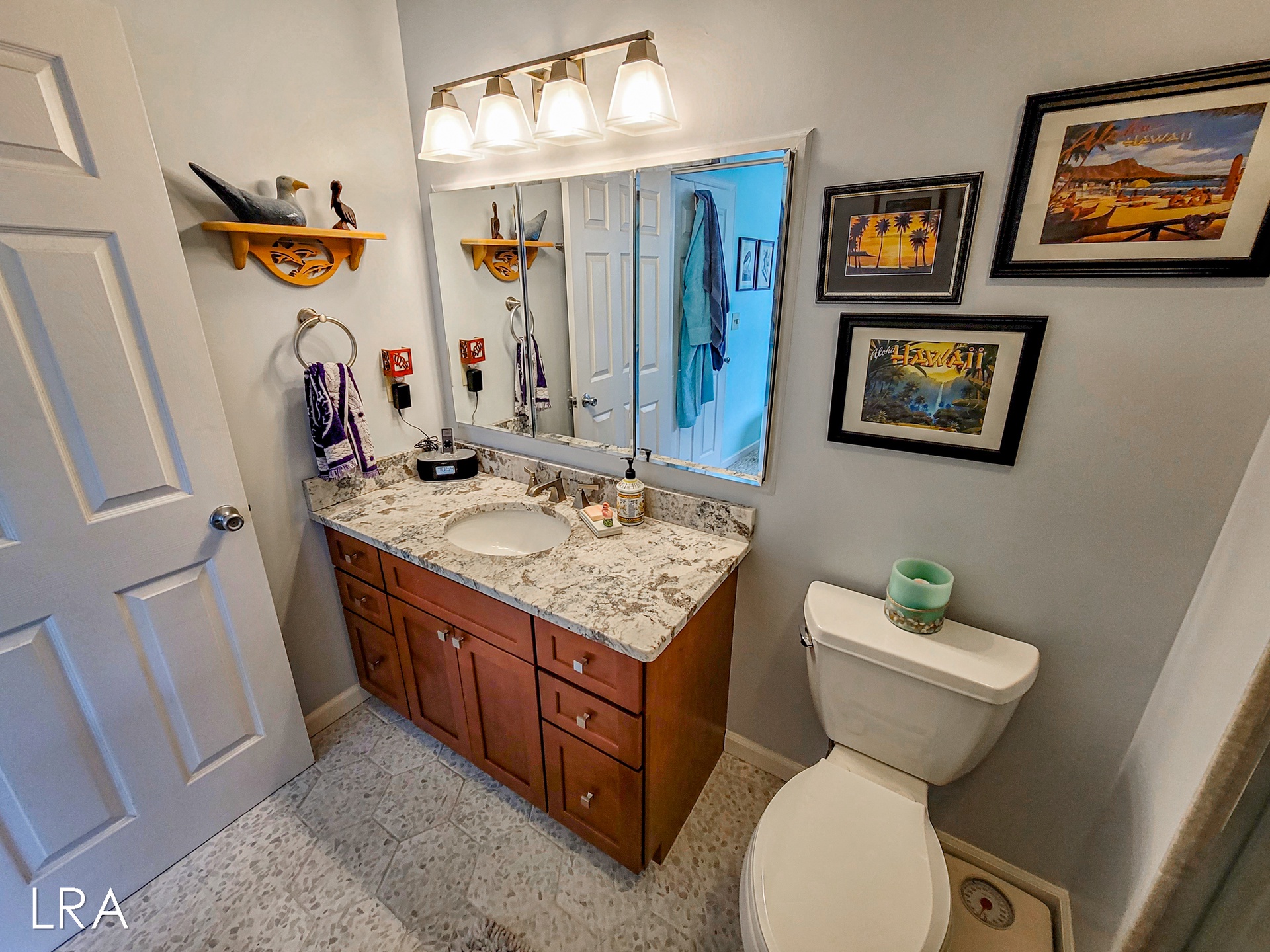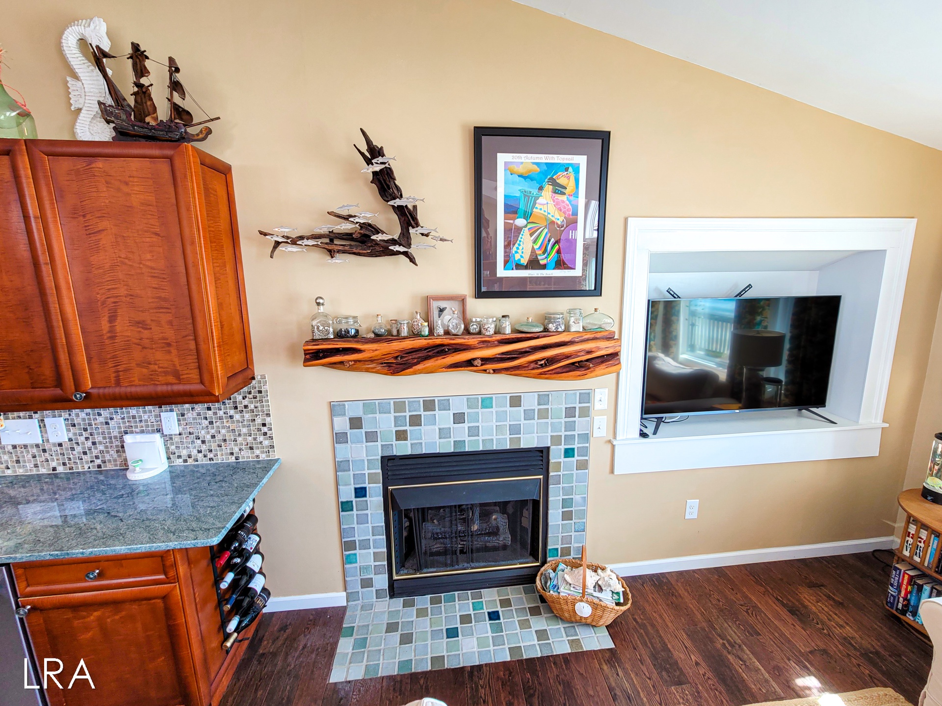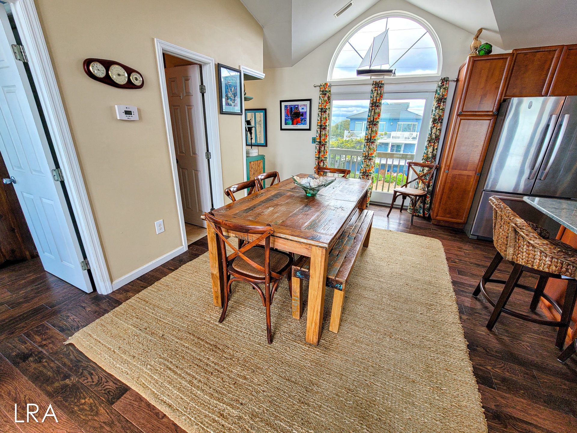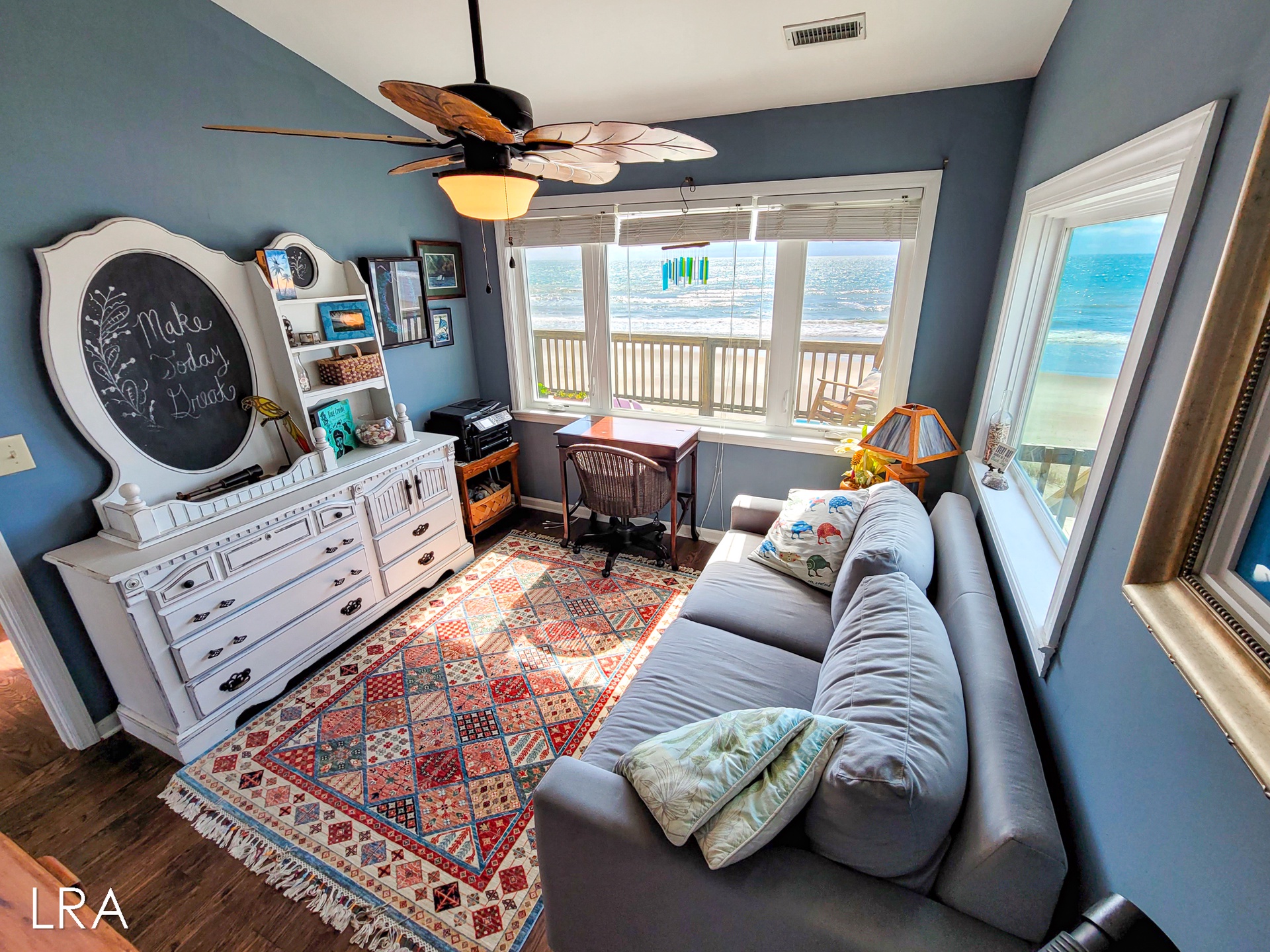 Head up to the top floor where you will find the main living area. The fully equipped kitchen is just at the top of the stairs and is complete with granite countertops, stainless steel appliances, and a square island with seating for 3 people. In the dining area, you have a beautiful solid wood table with chairs and bench seating for 6 people. The living room has vaulted ceilings and a decorative fireplace. Cozy up on the couch to watch a movie or look out at the beautiful views of the ocean. Step out onto the large spacious deck to breathe in that fresh ocean air or just relax on the comfy deck furniture. Enjoy amazing days soaking up the sun and gazing at the stars at night. Off the living room is a quiet sitting area that can easily be converted to a workspace for those who have to work while on vacation, but will want to enjoy amazing ocean views. Off the living room, you will find the final shared full bath with a walk-in shower.