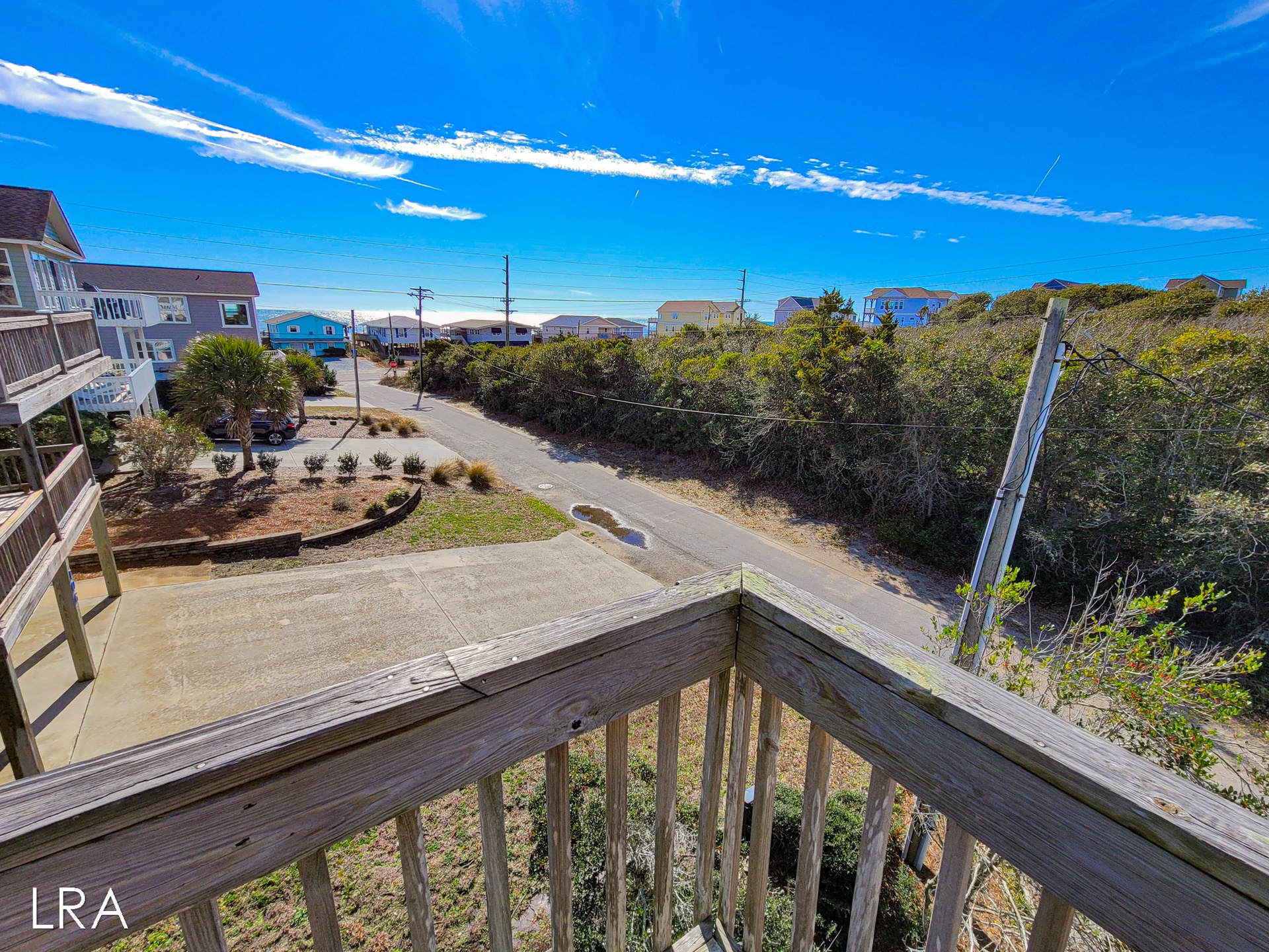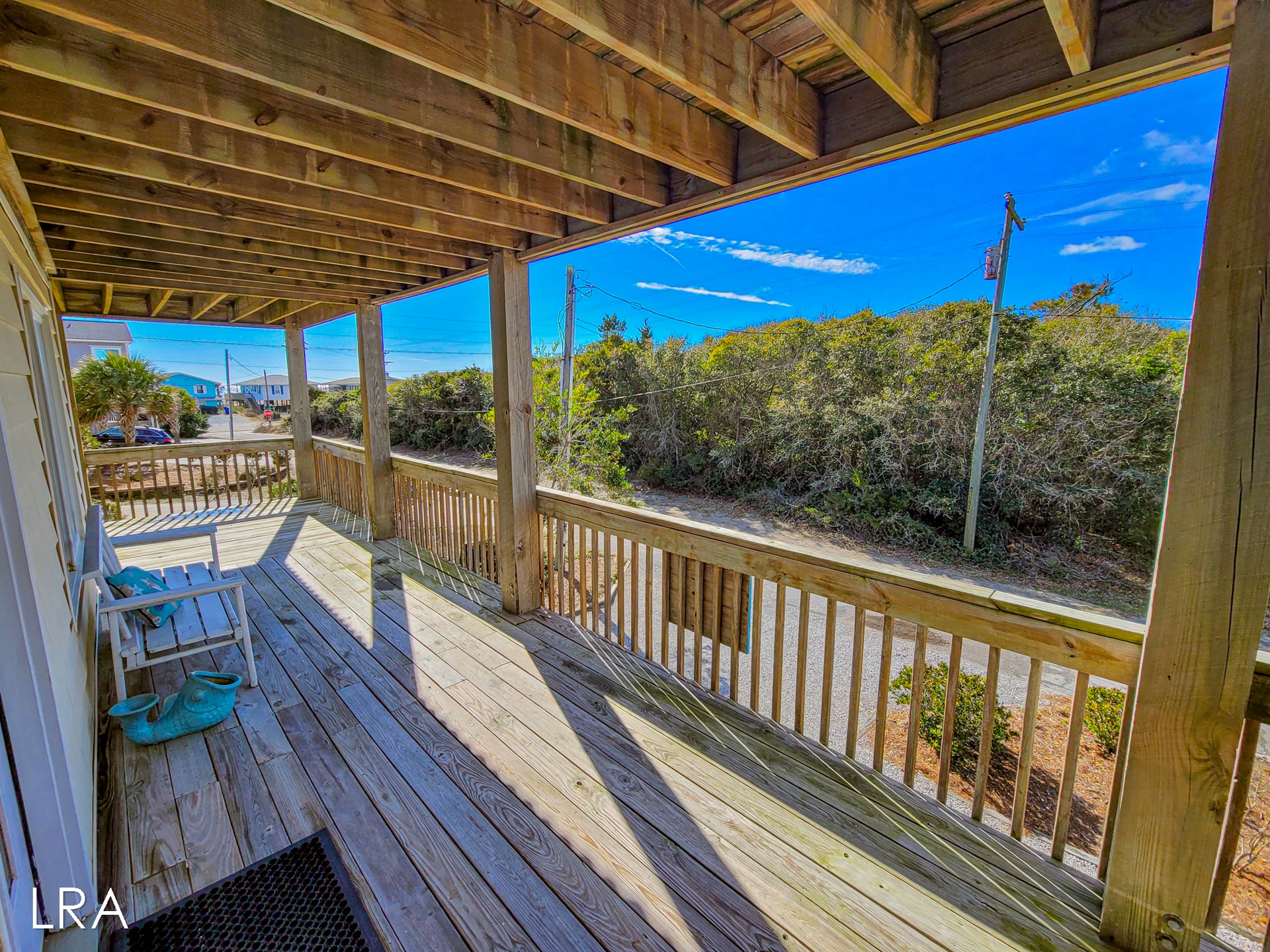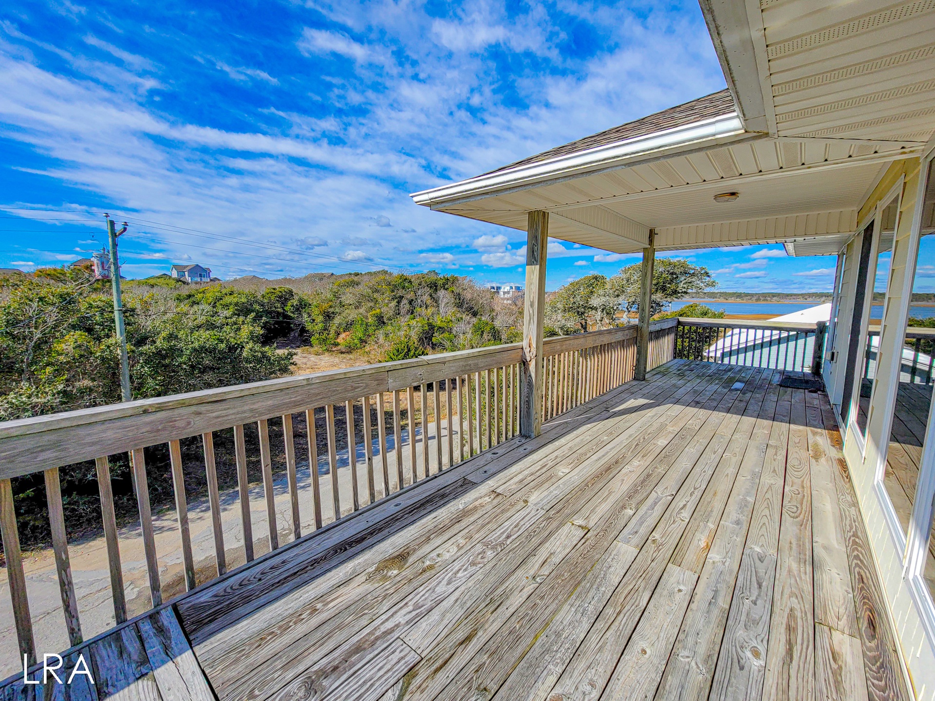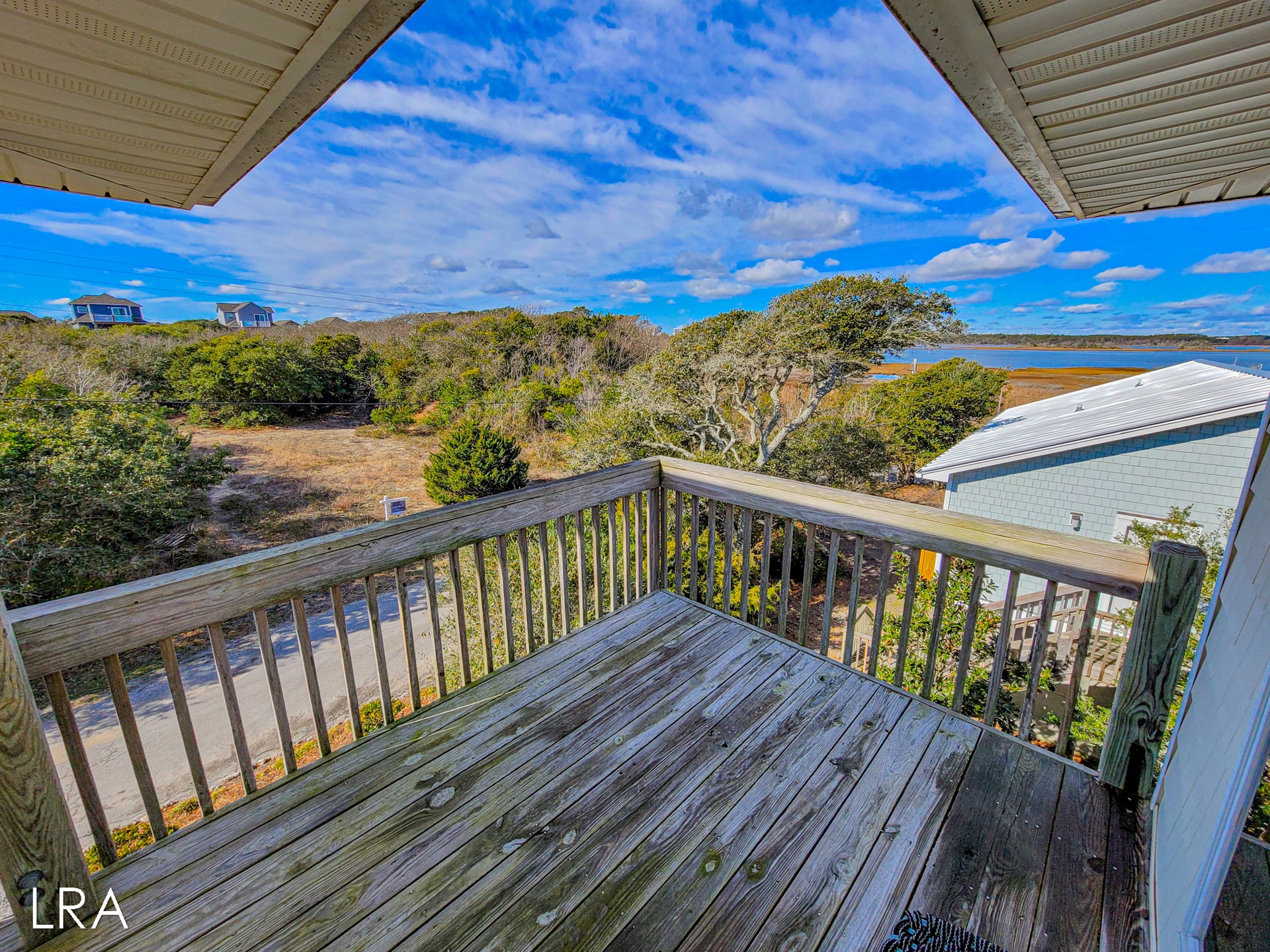 Take the stairs up one more time and you will find the main living area, kitchen, and final bed and bathrooms. Right away you can see the water from every direction out of the multiple windows that surround the room and flood the top floor with natural light. The spacious living room offers comfortable seating and a flat-screen TV, so you can gather around for a movie night after a long day on the beach. Step outside onto the sprawling top-floor deck where you get a tree-top view of Topsail Island like no other! Watch the waves crash on the ocean side, or sailboats float down the Intracoastal waterway, while you enjoy your morning coffee. The large classic kitchen offers all of your basic cooking needs, major appliances, cookware, and dishware to make whipping up meals for the whole family a breeze. The dining room table offers seating for 6 with an additional 4 stools at the kitchen bar. Just off the living room is a full-sized shared bathroom with a vanity sink and shower stall so everyone can freshen up before dinner. The final bedroom sits just off the living room and offers a queen bed, access to the shared bathroom, and access to the large top floor with ocean views.