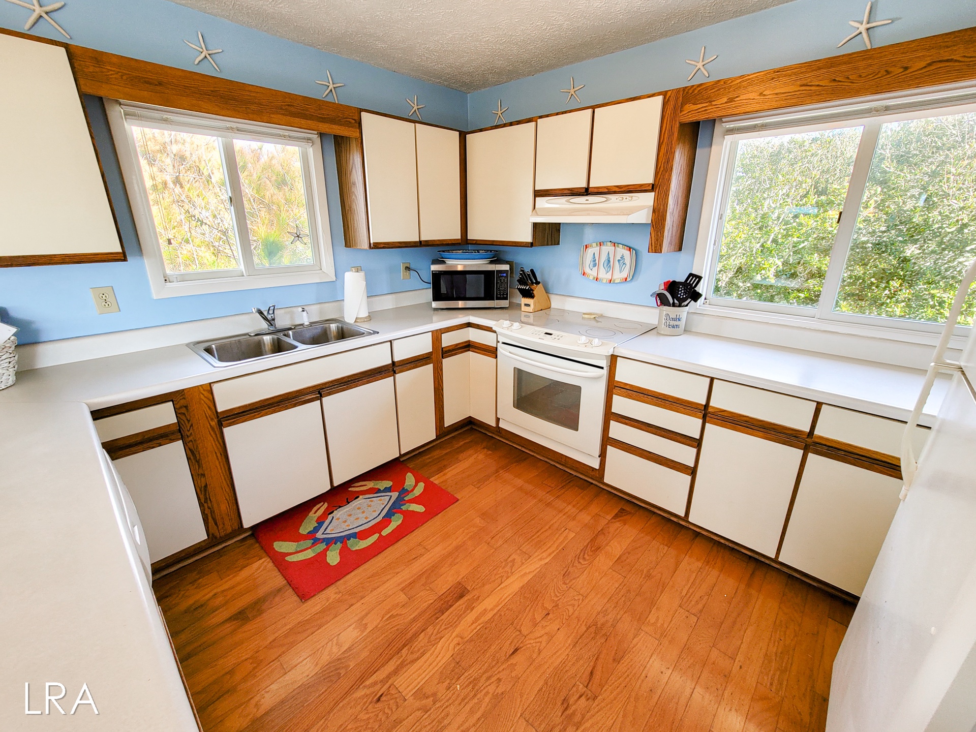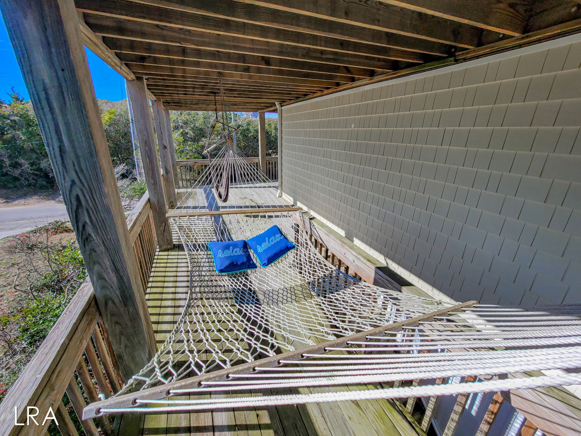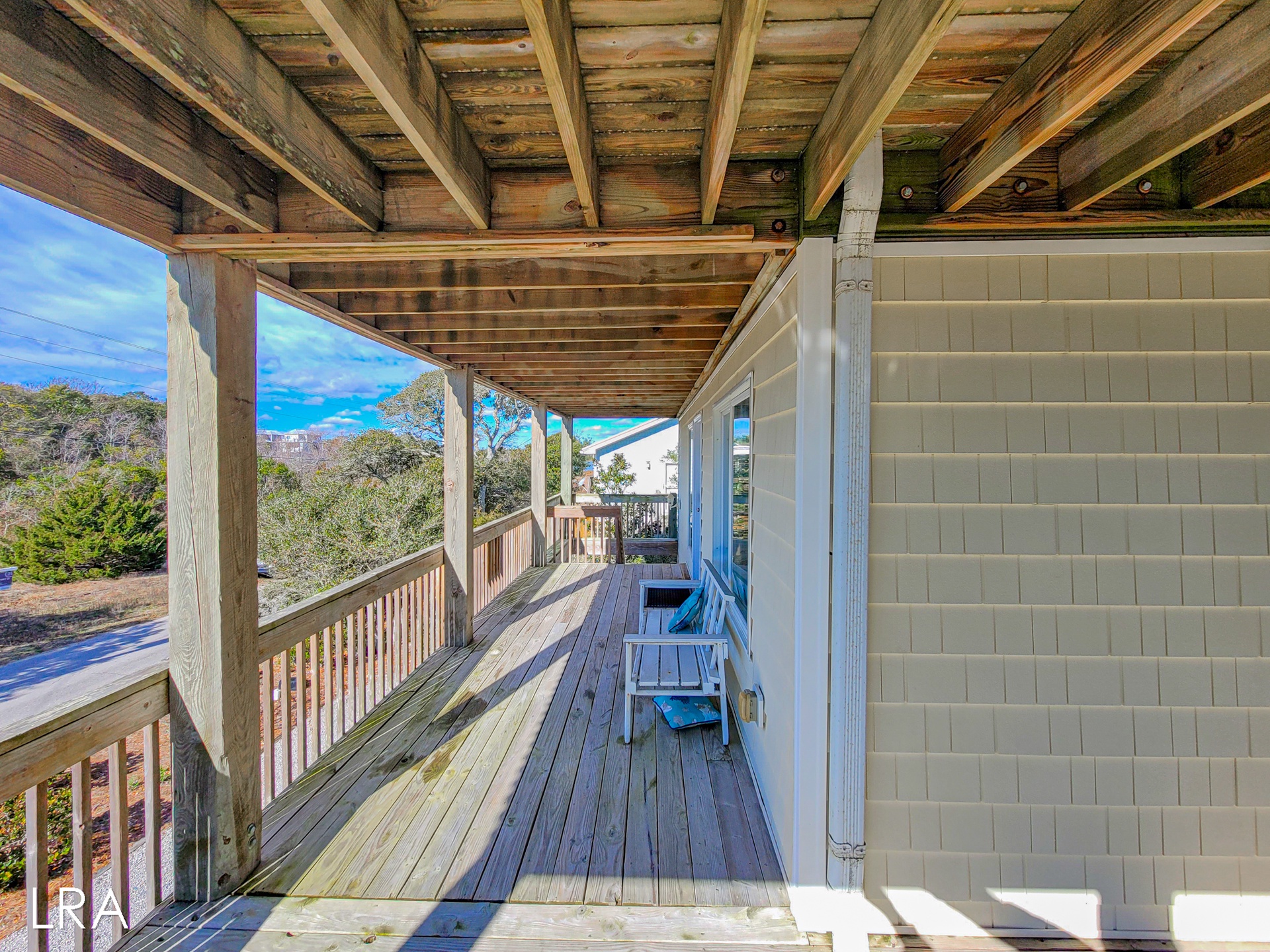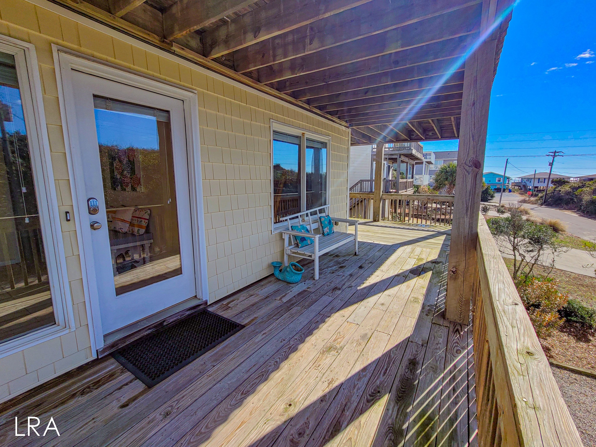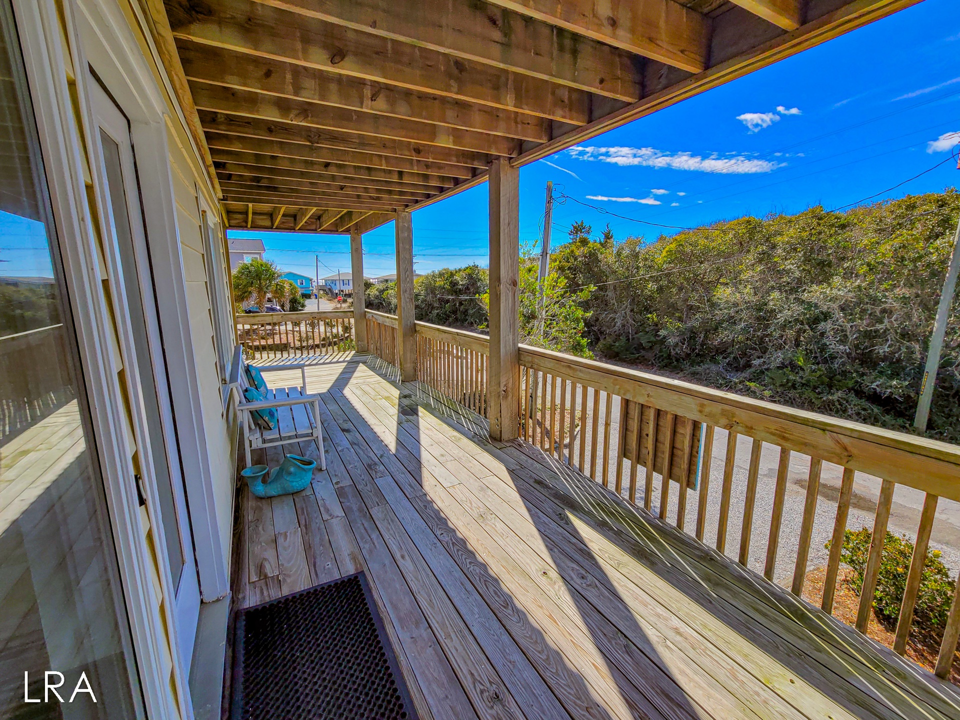 Take the stairs up one more time and you will find the main living area, kitchen, and final bed and bathrooms. Right away you can see the water from every direction out of the multiple windows that surround the room and flood the top floor with natural light. The spacious living room offers comfortable seating and a flat-screen TV, so you can gather around for a movie night after a long day on the beach. Step outside onto the sprawling top-floor deck where you get a tree-top view of Topsail Island like no other! Watch the waves crash on the ocean side, or sailboats float down the Intracoastal waterway, while you enjoy your morning coffee. The large classic kitchen offers all of your basic cooking needs, major appliances, cookware, and dishware to make whipping up meals for the whole family a breeze. The dining room table offers seating for 6 with an additional 4 stools at the kitchen bar. Just off the living room is a full-sized shared bathroom with a vanity sink and shower stall so everyone can freshen up before dinner. The final bedroom sits just off the living room and offers a queen bed, access to the shared bathroom, and access to the large top floor with ocean views.