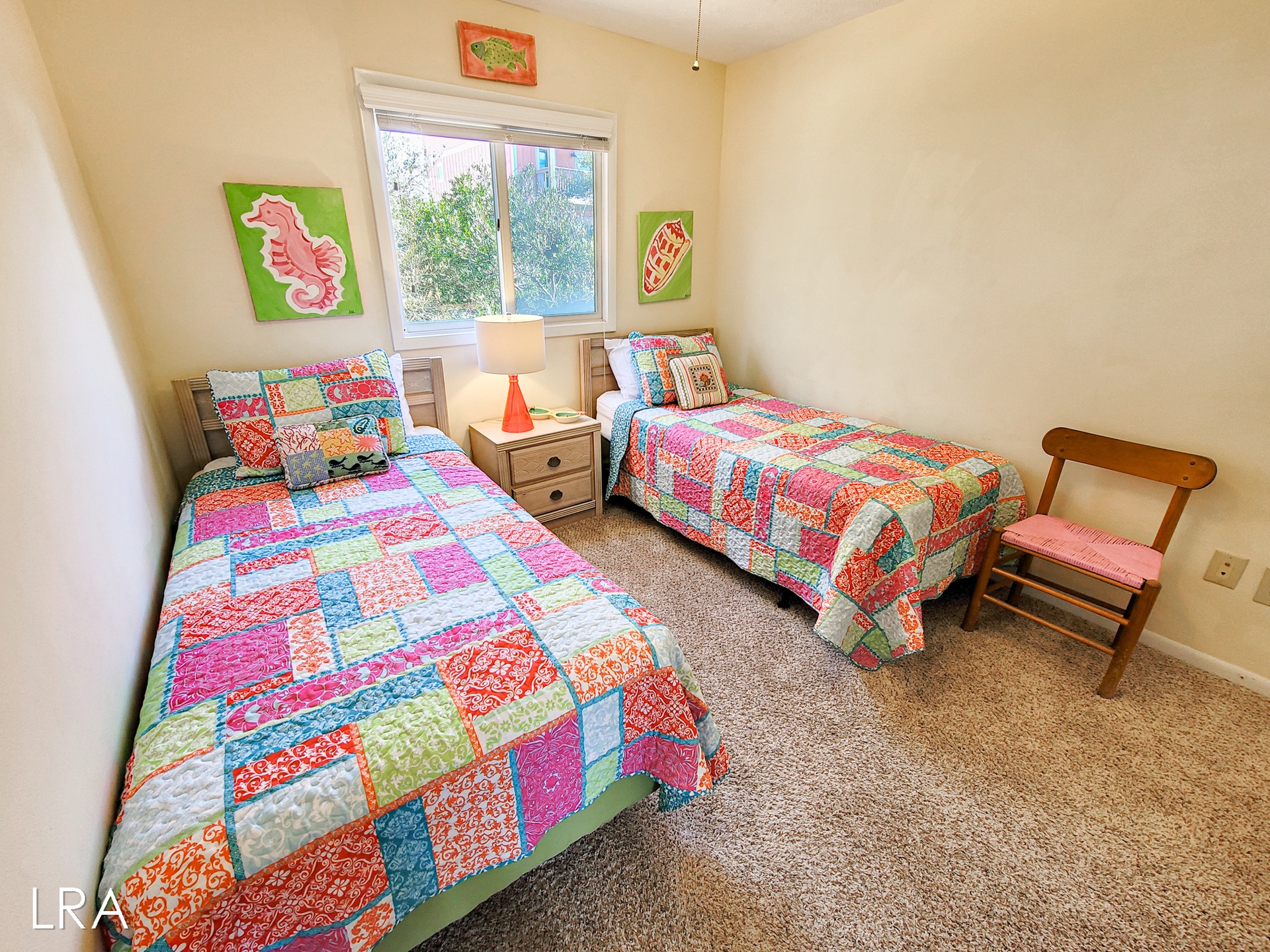 Head up the stairs to the middle floor where you will find 3 more bedrooms and another bathroom. The first bedroom on this floor offers a king bed and access to a half bath with a vanity sink and a full shared bathroom with a shower tub combo. The second bedroom offers two twin beds and the third bedroom offers a Pyramid bunk bed ( Twin over Full). These bedrooms all share the full-sized bathroom that is conveniently located in the hall as well as a stackable washer and dryer. This floor also offers access to a private covered street-side deck.