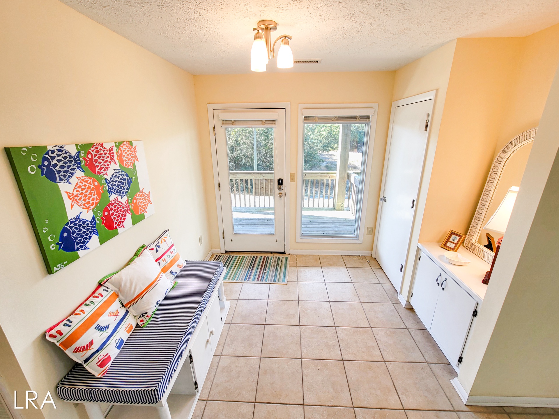 When you first arrive you are greeted by the gravel driveway with both covered and uncovered spaces for up to 4 cars. Use your keyless entry code on the ground floor entry door to get your vacation started. You enter into a cozy sitting area complete with a flat-screen TV, comfortable seating, and a kitchenette. A stackable washer and dryer are also located in this space. 2 of the 6 bedrooms are located on this floor. The first offers a twin bunk bed set. The second offers a king bed, a large closet, and access to the shared full bathroom with a shower-tub combo.