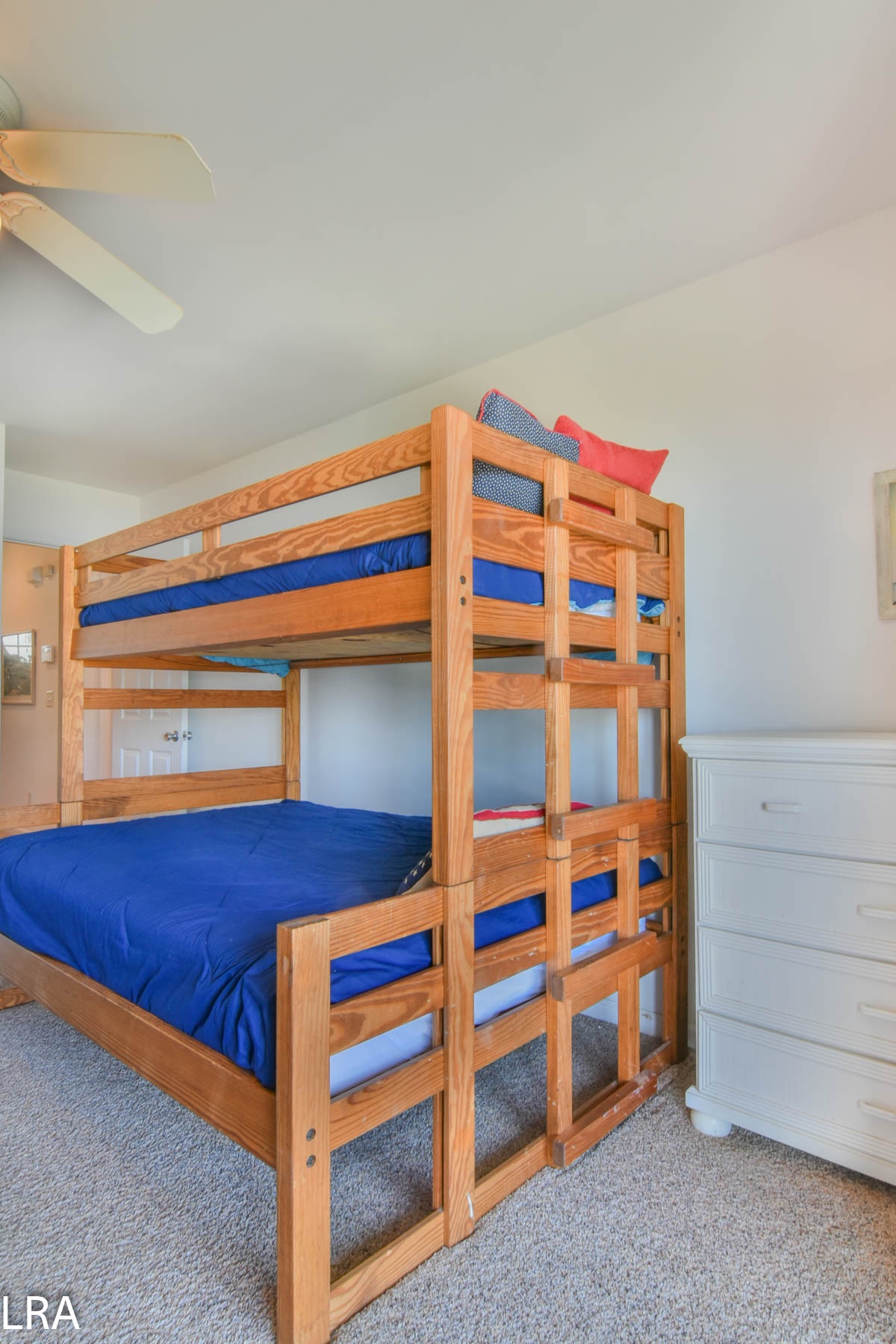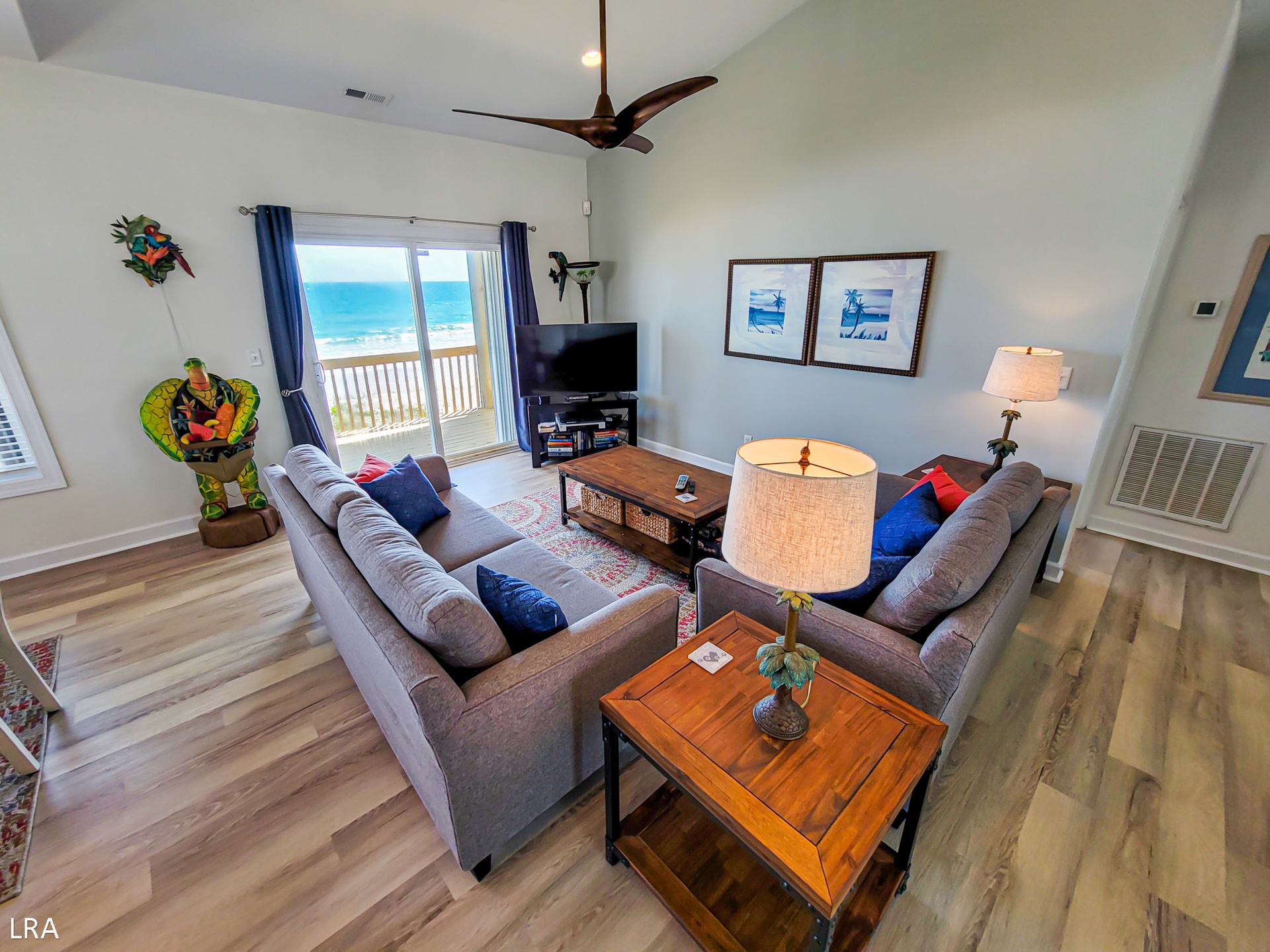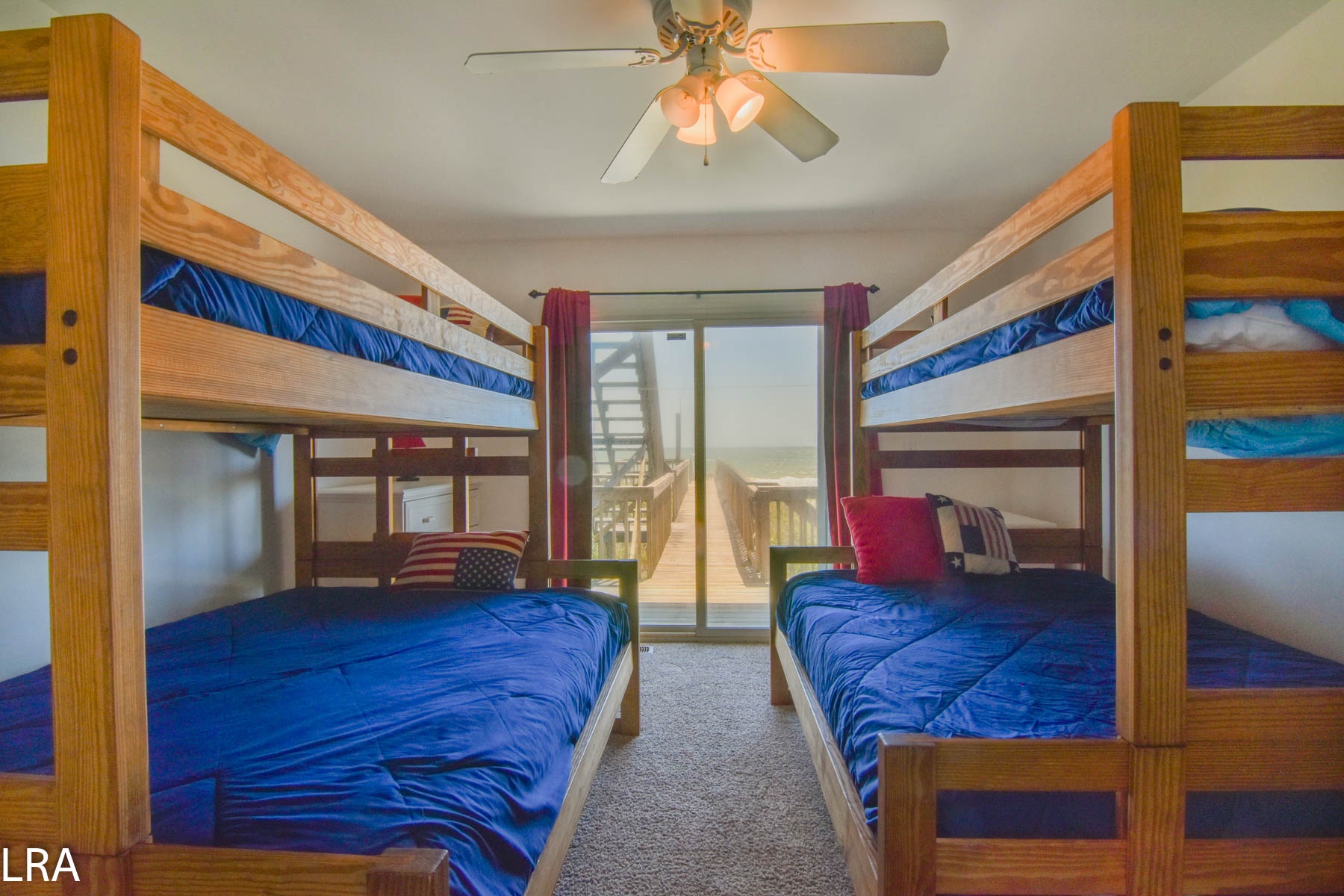The top level consists of the living area, dining area, kitchen, oceanfront bedroom with a King bed and a sliding door to the deck, and a shared full bathroom with access from the bedroom and living area. The lower level consists of three oceanfront bedrooms (2 Queens and 2 sets of Twin/Double Bunk Beds), each with sliding doors to the oceanfront deck. Two shared bathrooms are located at each end of the hallway on this level, and each can be accessed from either the Queen bedroom as well as the hallway.