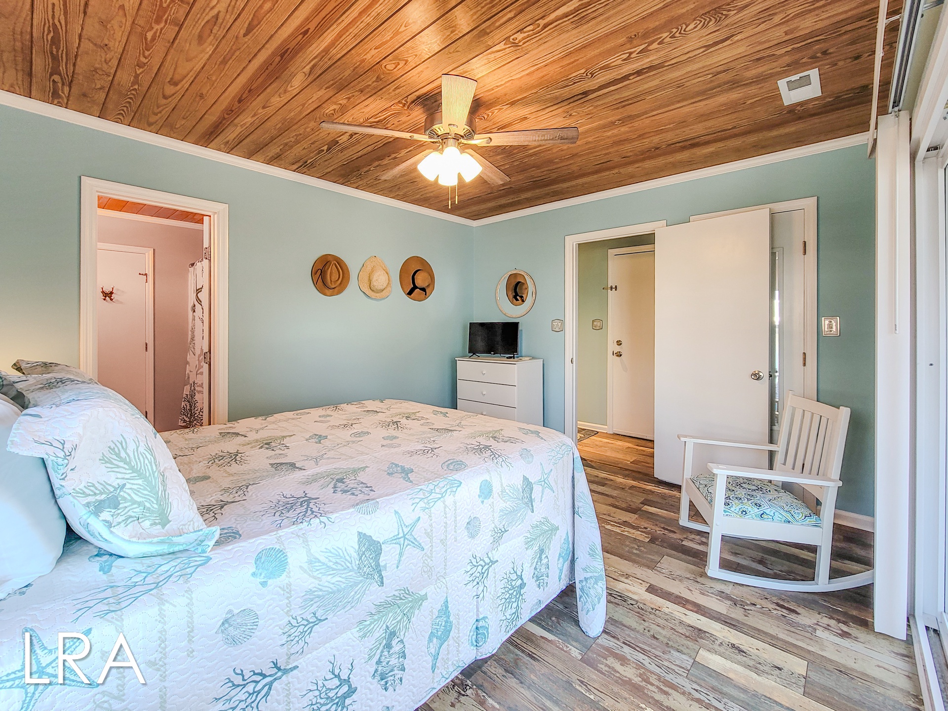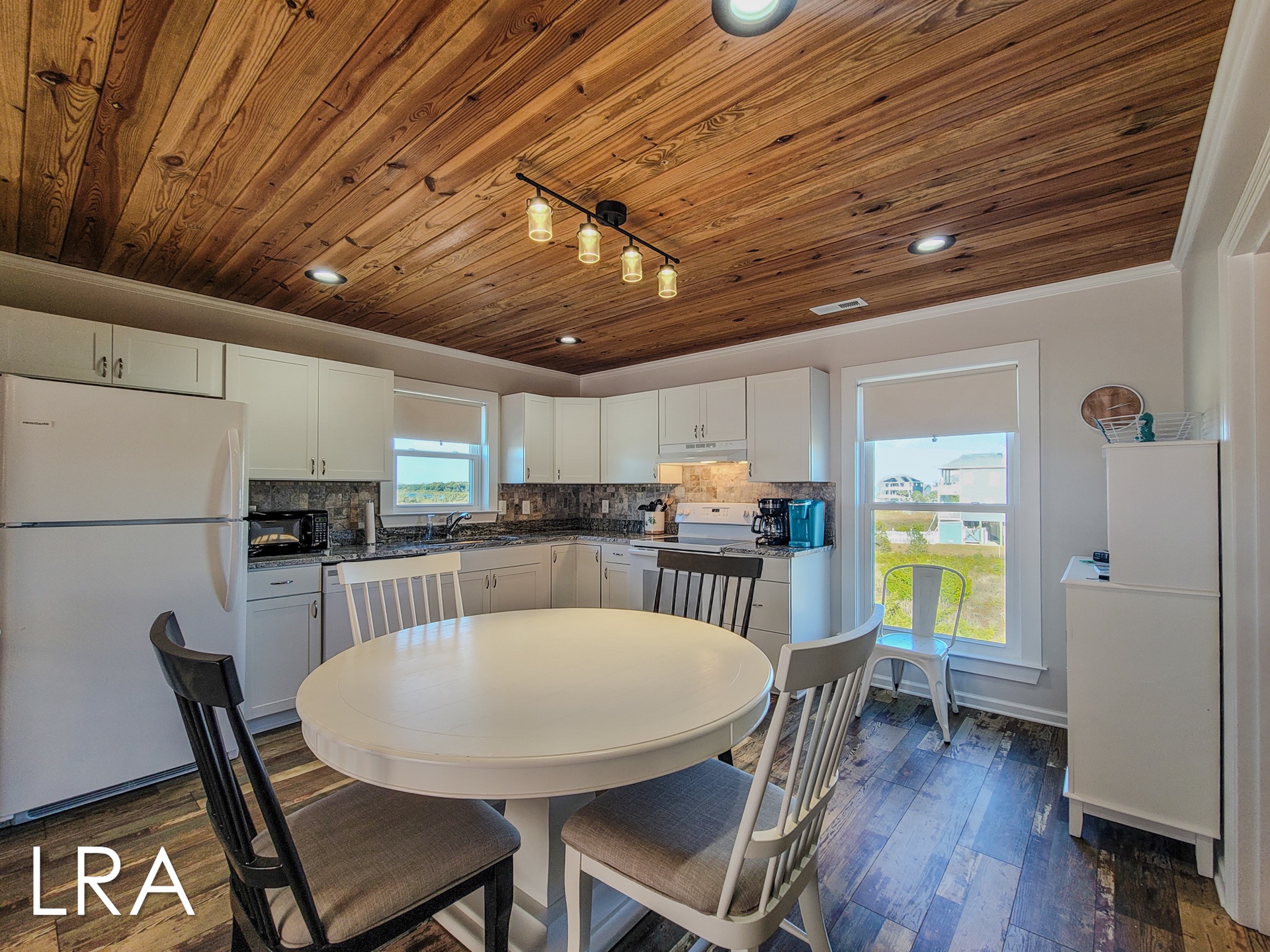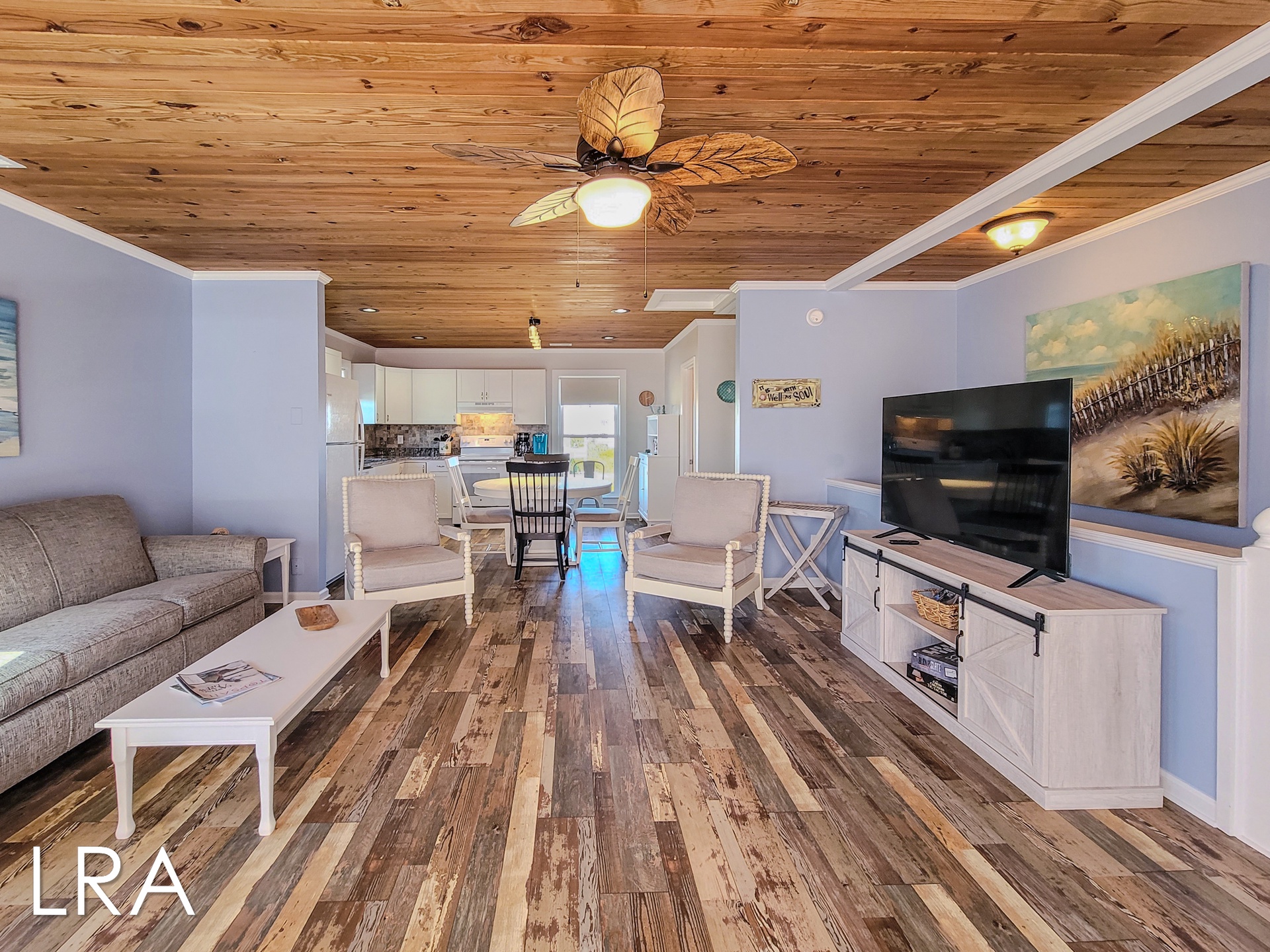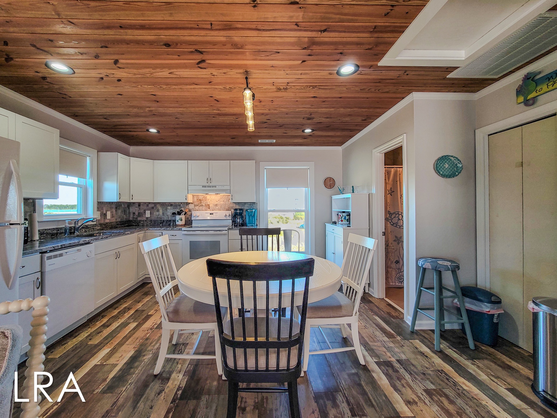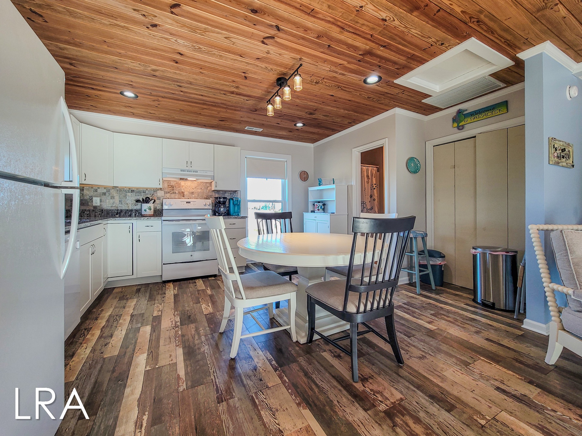 Inside, Fins Up offers a bright, open living space designed for laid-back beach living. Warm wood-plank ceilings, coastal décor, and comfortable furnishings create a relaxed atmosphere that instantly feels like vacation. The living area is perfect for unwinding after a day in the sun, while the fully equipped kitchen makes it easy to whip up fresh seafood dinners or quick beach snacks. The dining area is just right for gathering together, whether you’re starting the day with breakfast or ending it with cards and conversation.