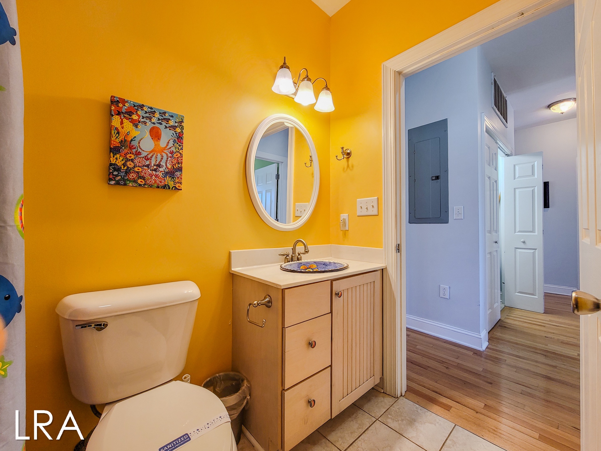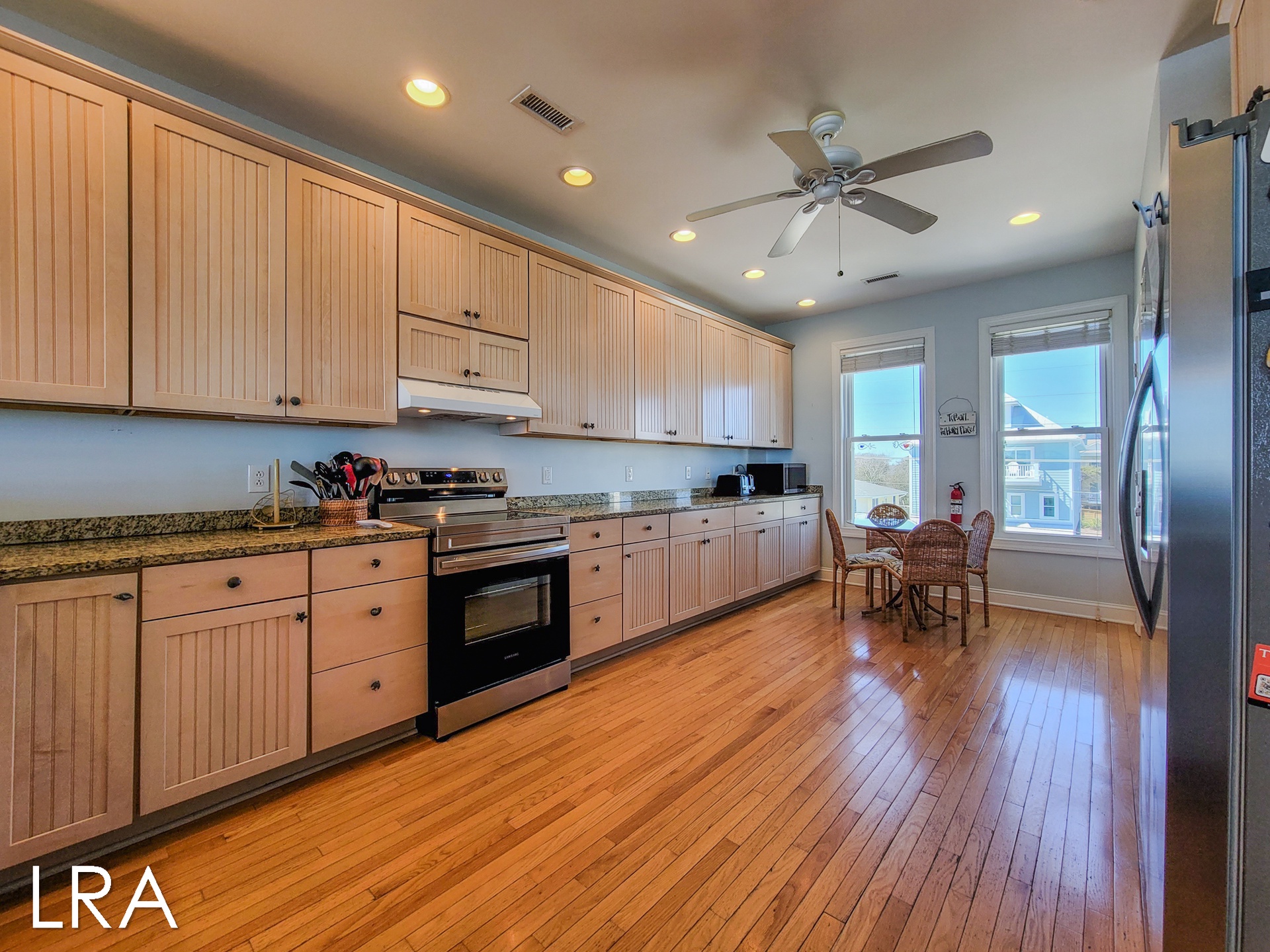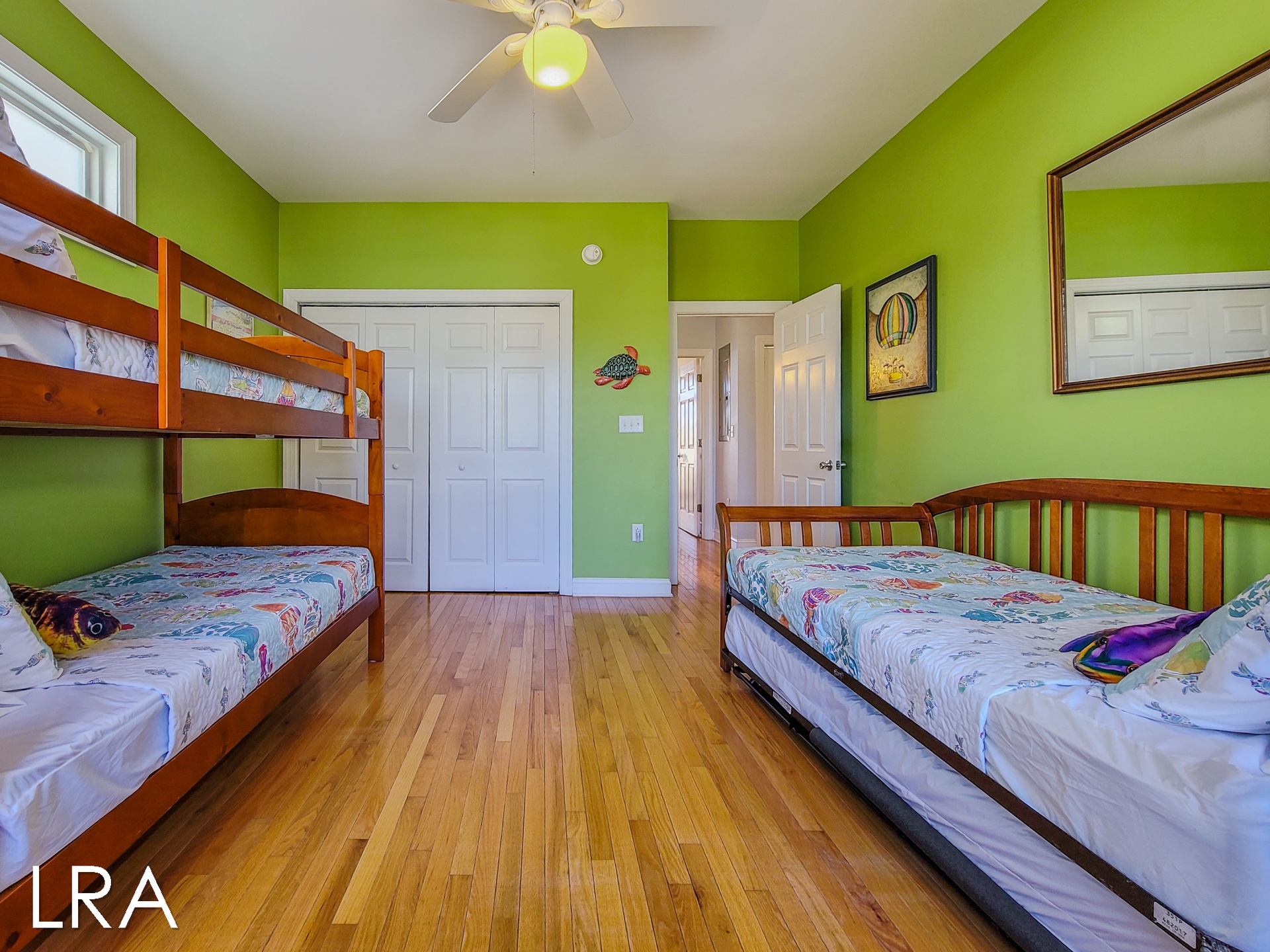 The second floor opens into a spacious great room with a comfortable living area, dining space, and a large, fully equipped kitchen for family meals. A street-side bedroom with two twin beds and a full bathroom at the end of the hall completes the layout of this level.