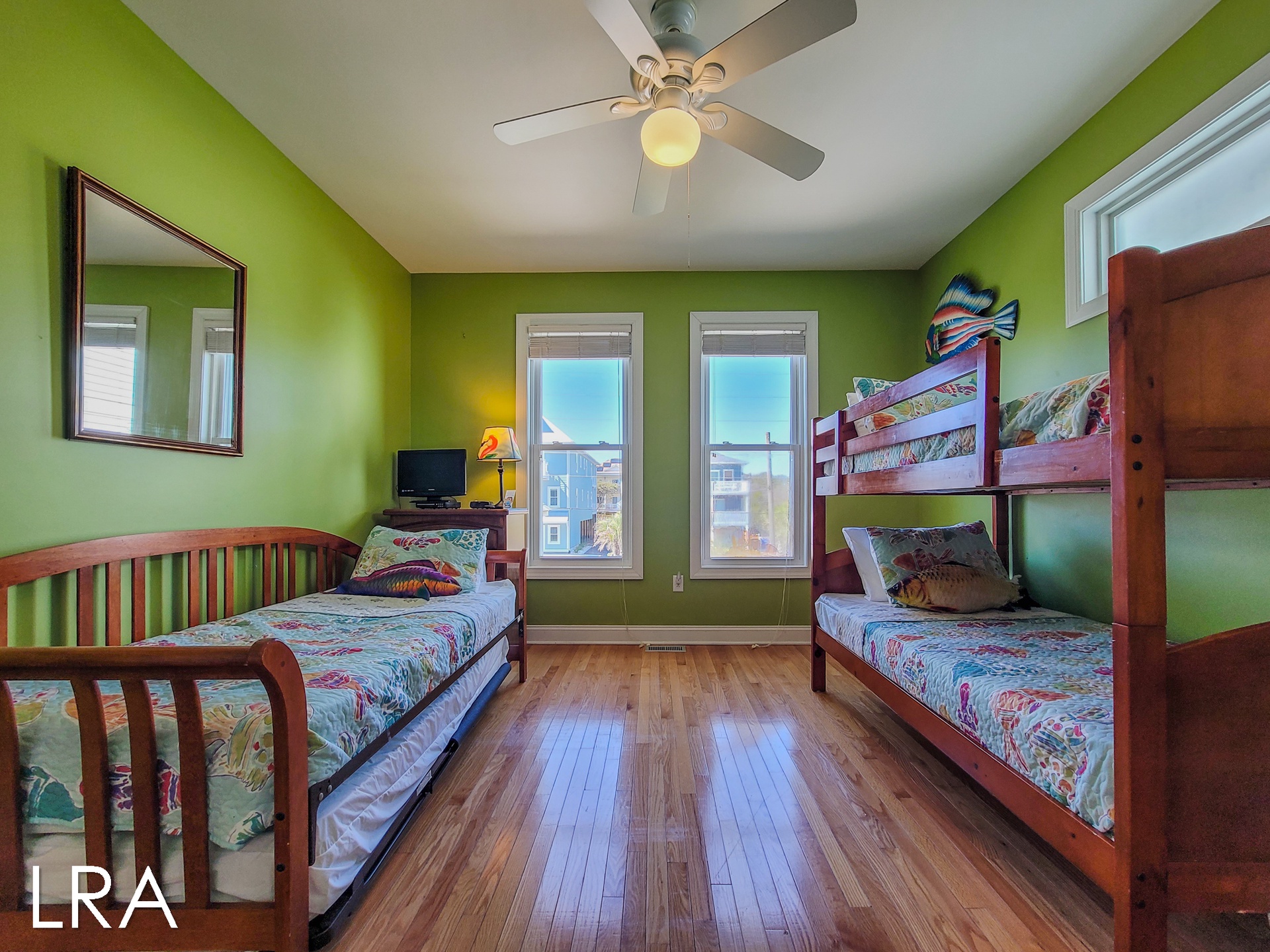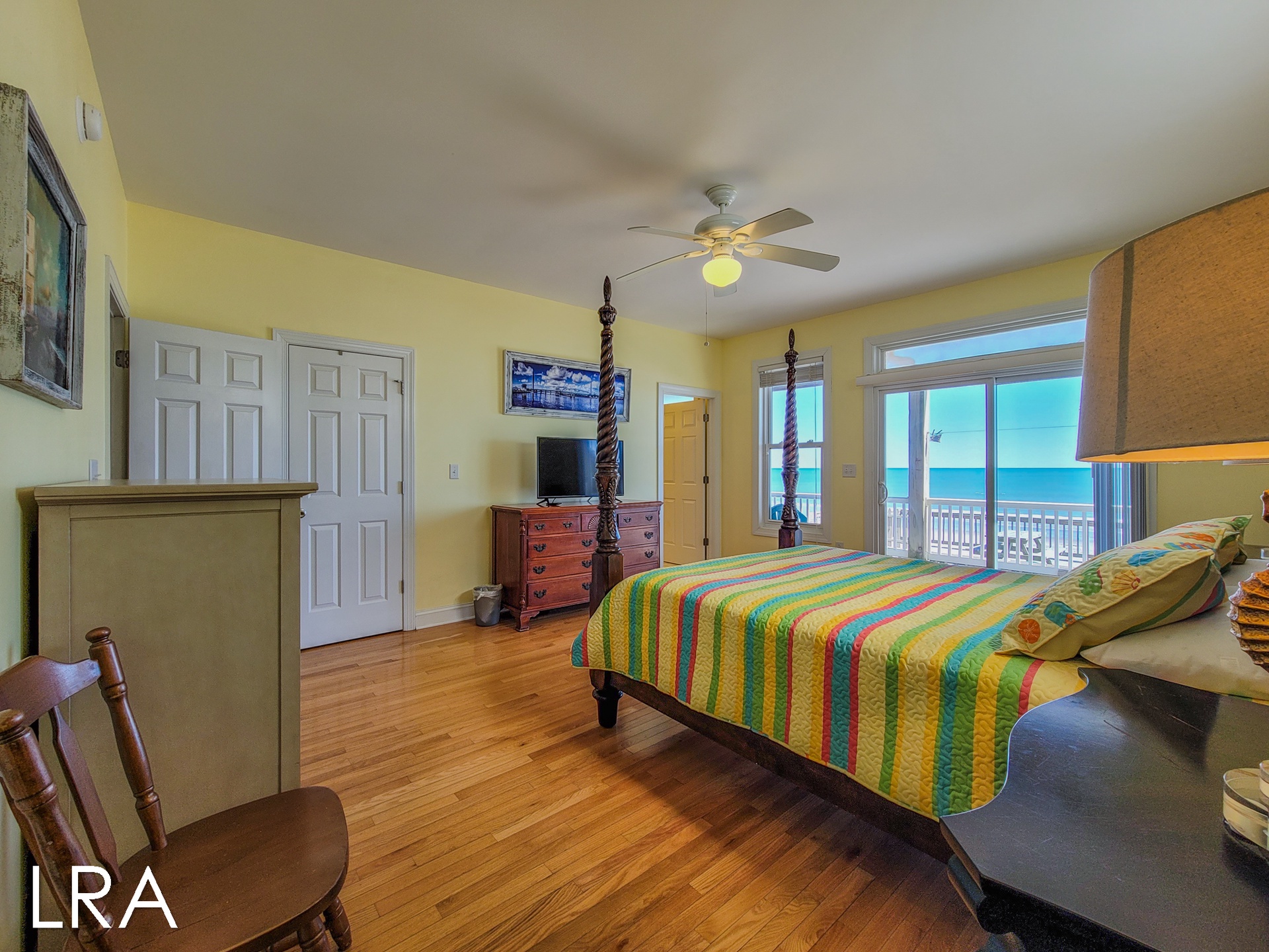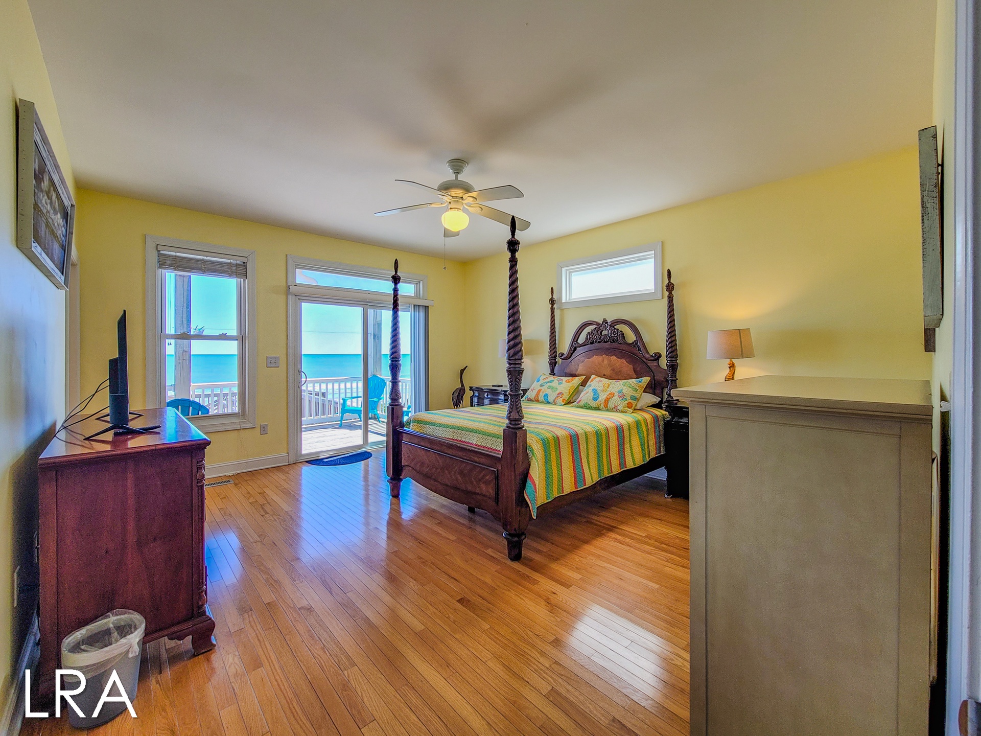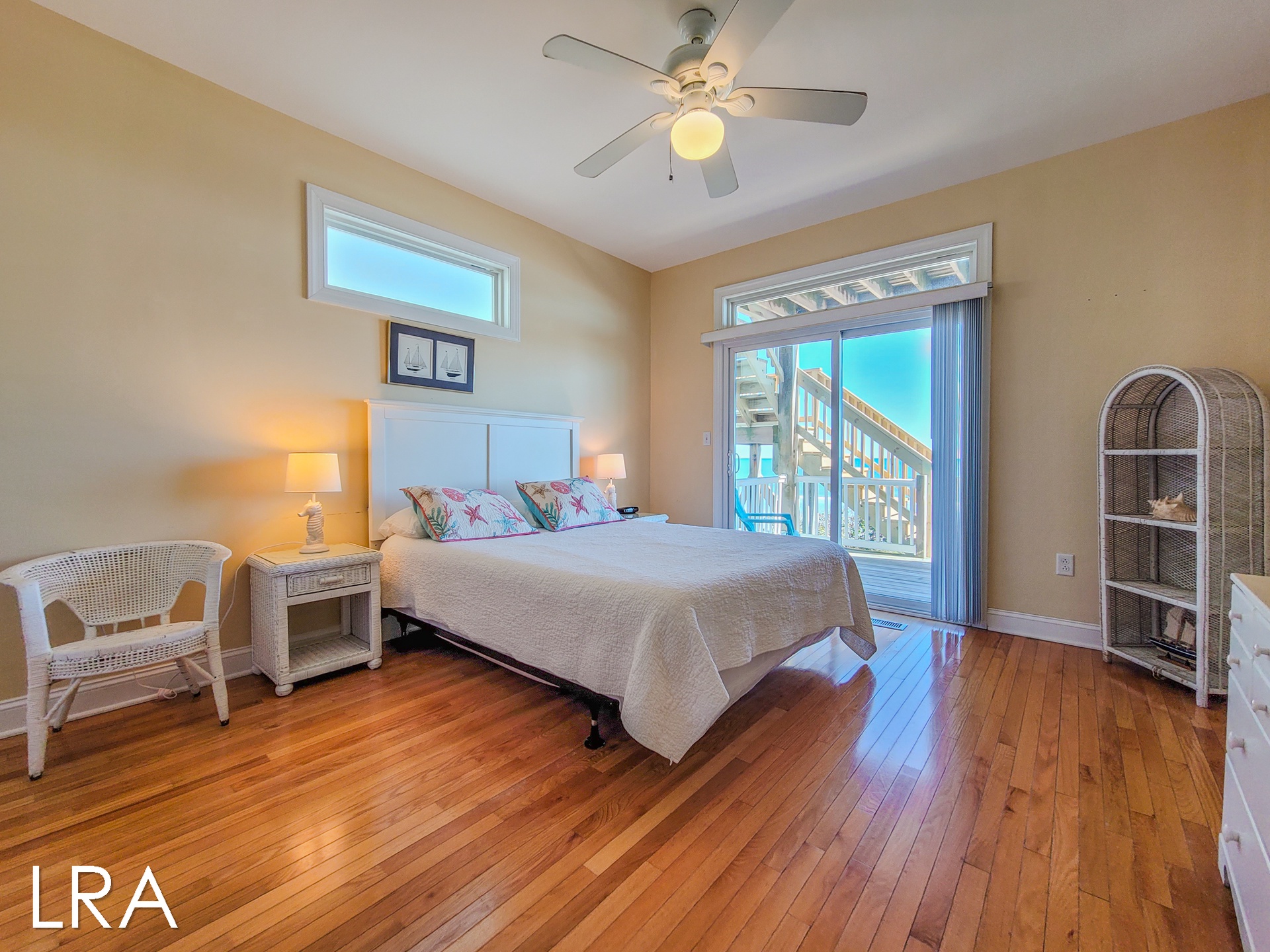 On the first floor, four beautifully appointed bedrooms and three bathrooms provide a cozy, private space for everyone. On the north side, the street-side bedroom includes a bunk bed (two twins) and a daybed with a rollout trundle (two twins), while the oceanfront bedroom features a queen bed and access to the deck. These two bedrooms share a bathroom located in the hallway. On the south side, a street-side bedroom has a queen bed and private bathroom, while the oceanfront master bedroom includes a King bed, private bathroom, and access to the deck.