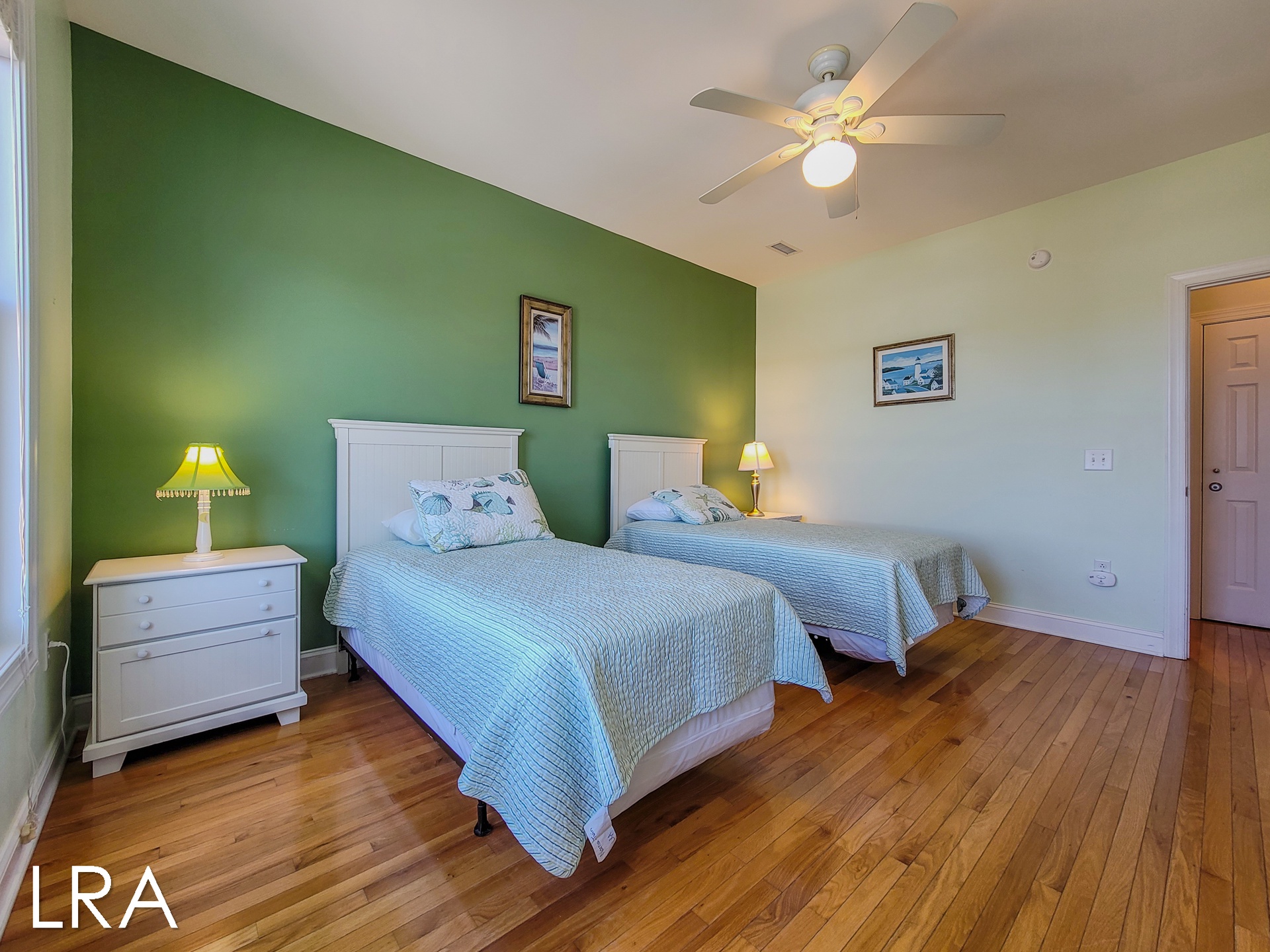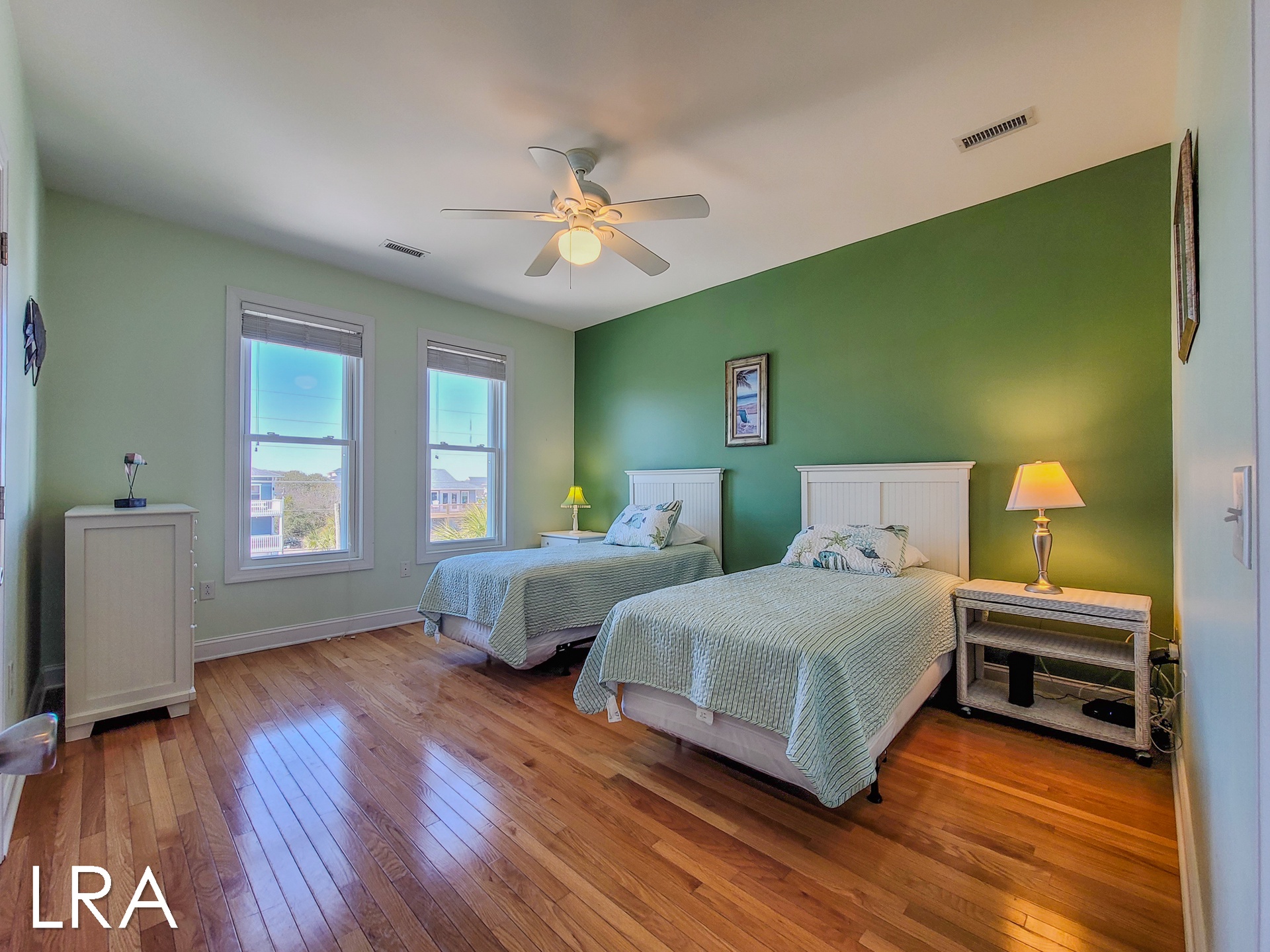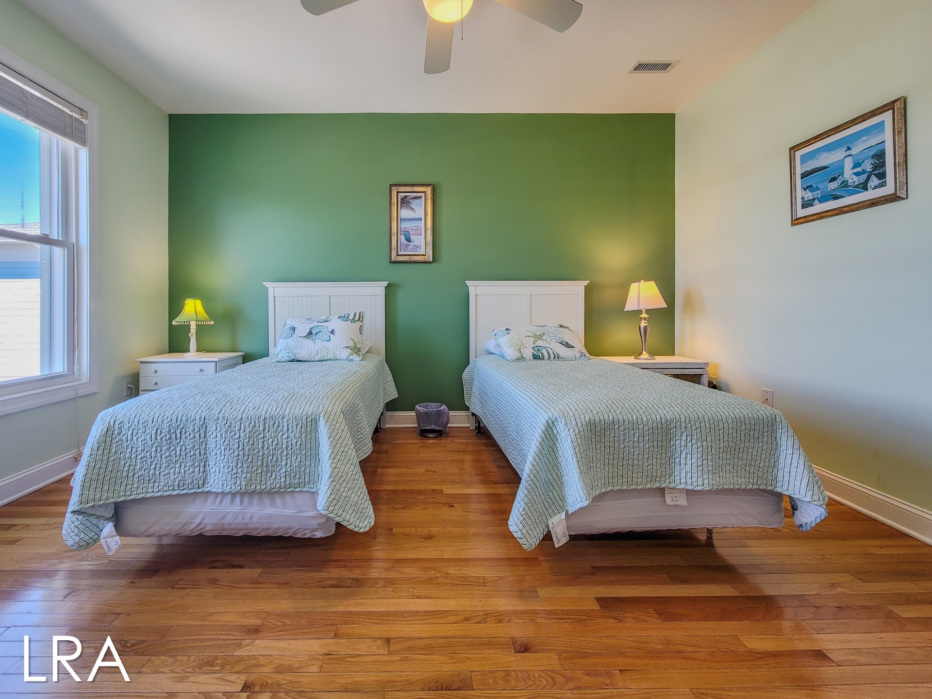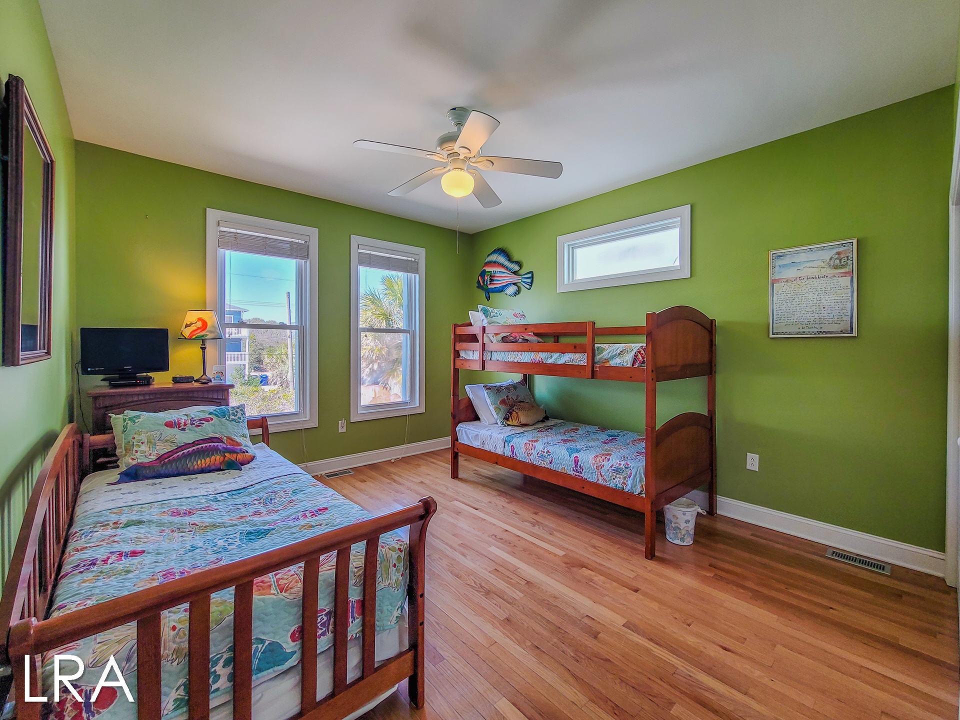 On the first floor, four beautifully appointed bedrooms and three bathrooms provide a cozy, private space for everyone. On the north side, the street-side bedroom includes a bunk bed (two twins) and a daybed with a rollout trundle (two twins), while the oceanfront bedroom features a queen bed and access to the deck. These two bedrooms share a bathroom located in the hallway. On the south side, a street-side bedroom has a queen bed and private bathroom, while the oceanfront master bedroom includes a King bed, private bathroom, and access to the deck.