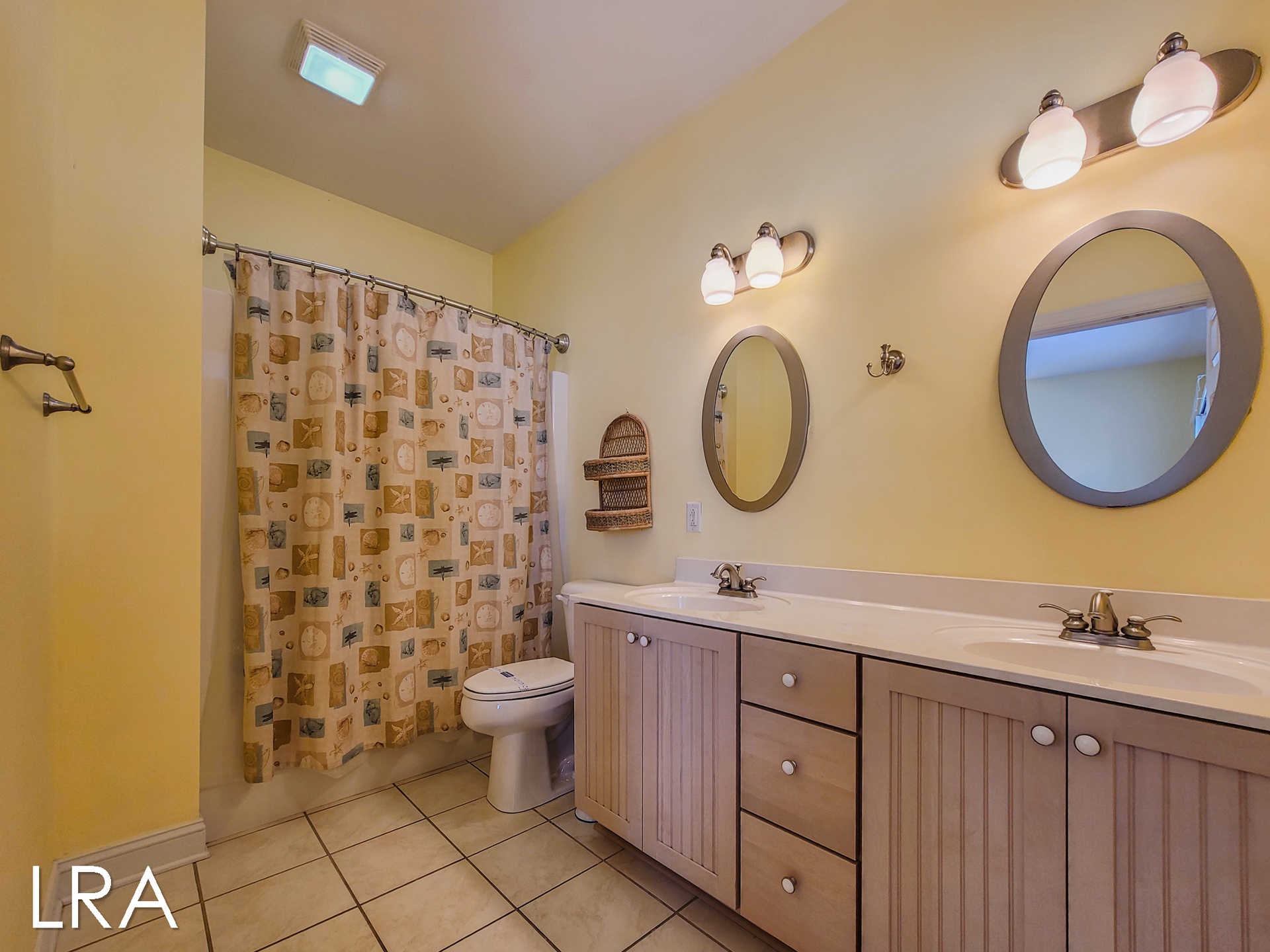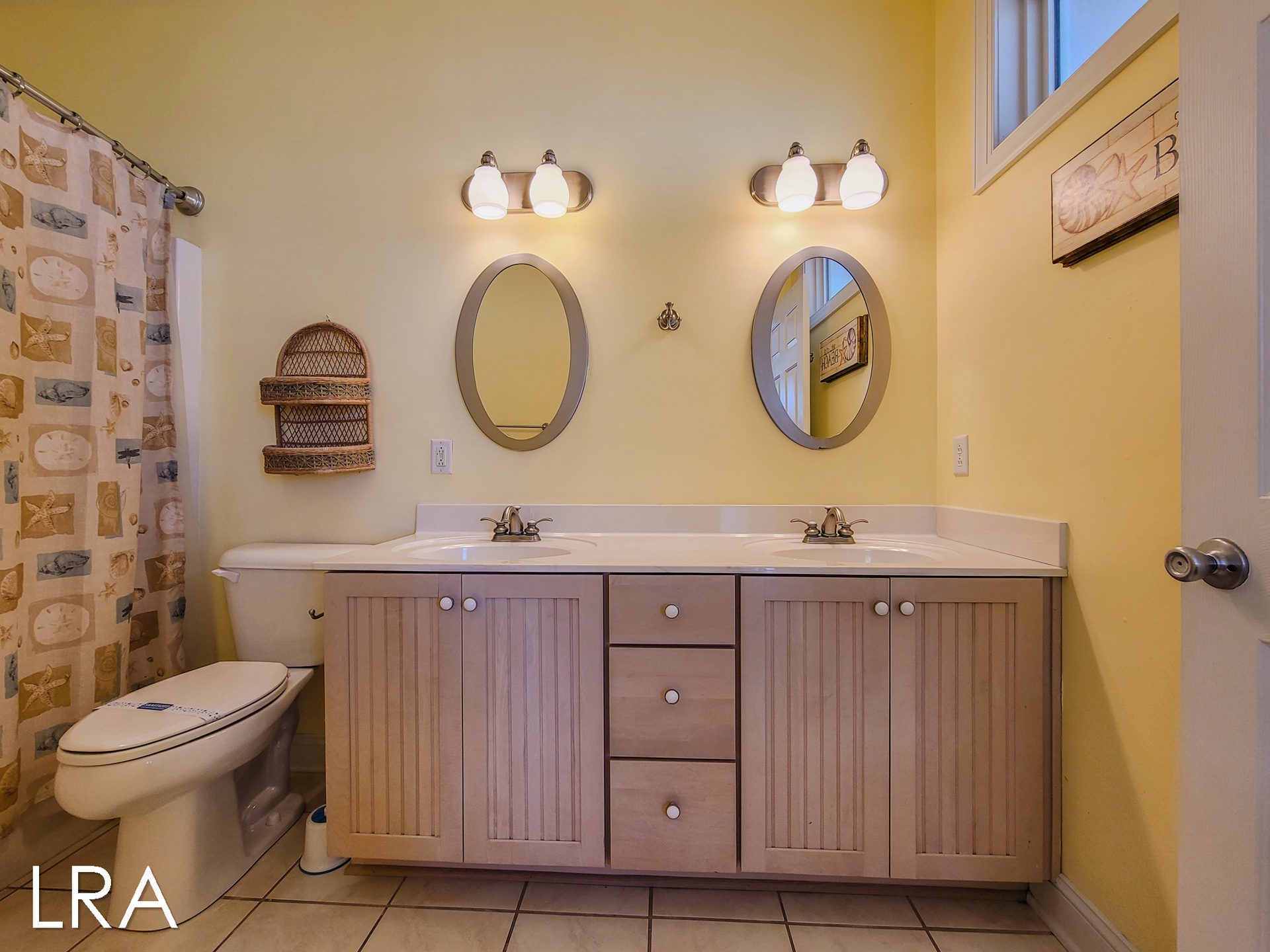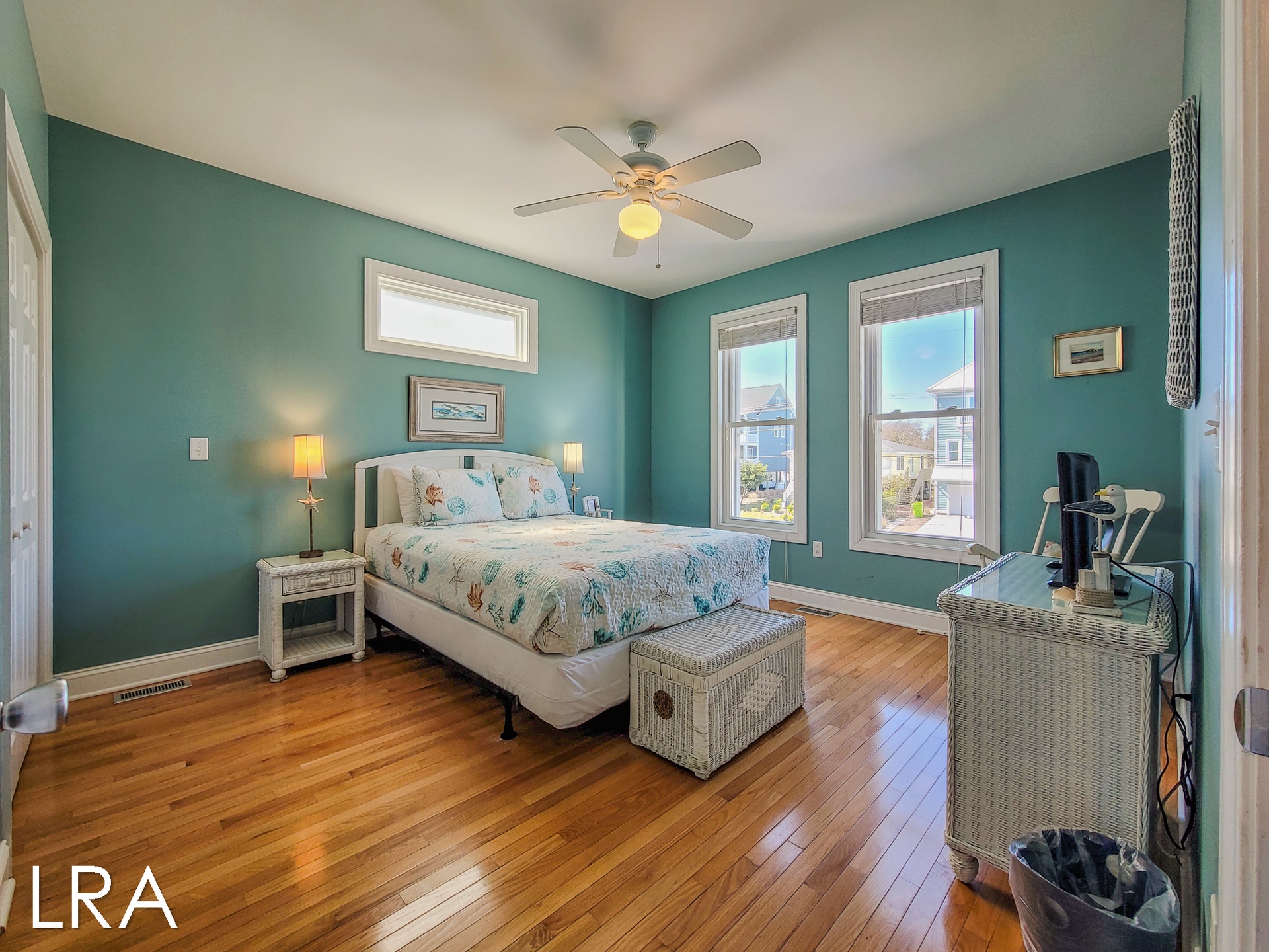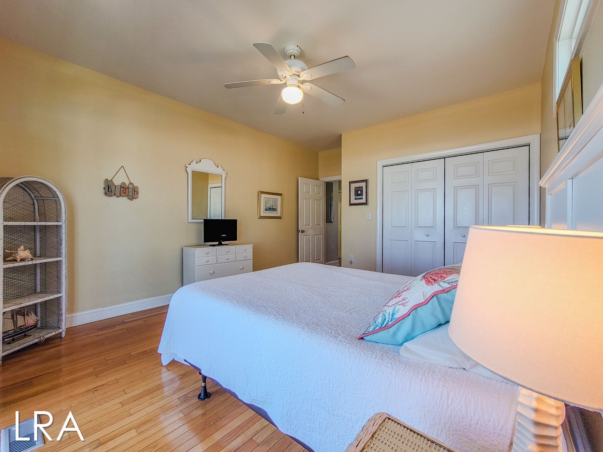 On the first floor, four beautifully appointed bedrooms and three bathrooms provide a cozy, private space for everyone. On the north side, the street-side bedroom includes a bunk bed (two twins) and a daybed with a rollout trundle (two twins), while the oceanfront bedroom features a queen bed and access to the deck. These two bedrooms share a bathroom located in the hallway. On the south side, a street-side bedroom has a queen bed and private bathroom, while the oceanfront master bedroom includes a King bed, private bathroom, and access to the deck.