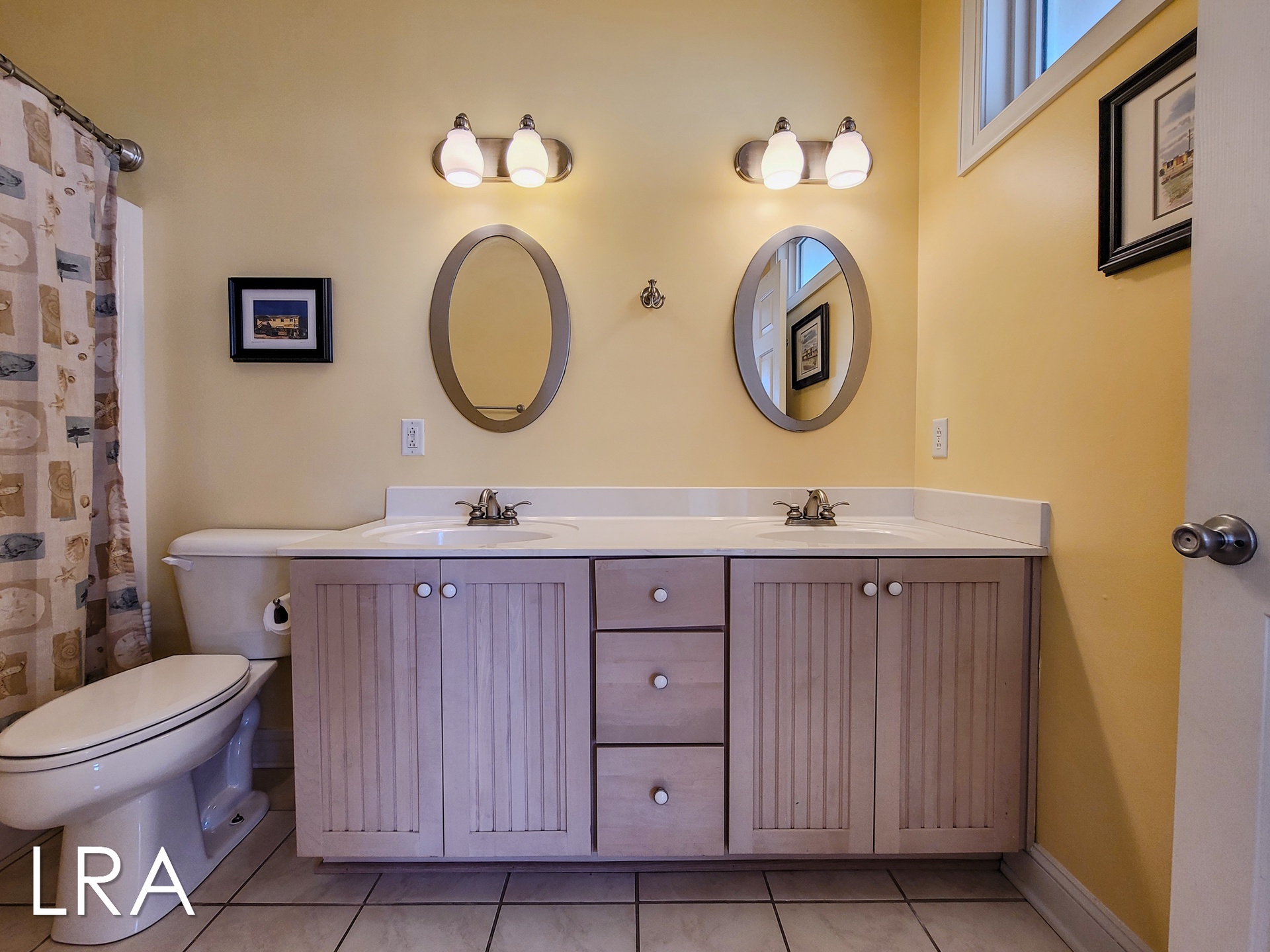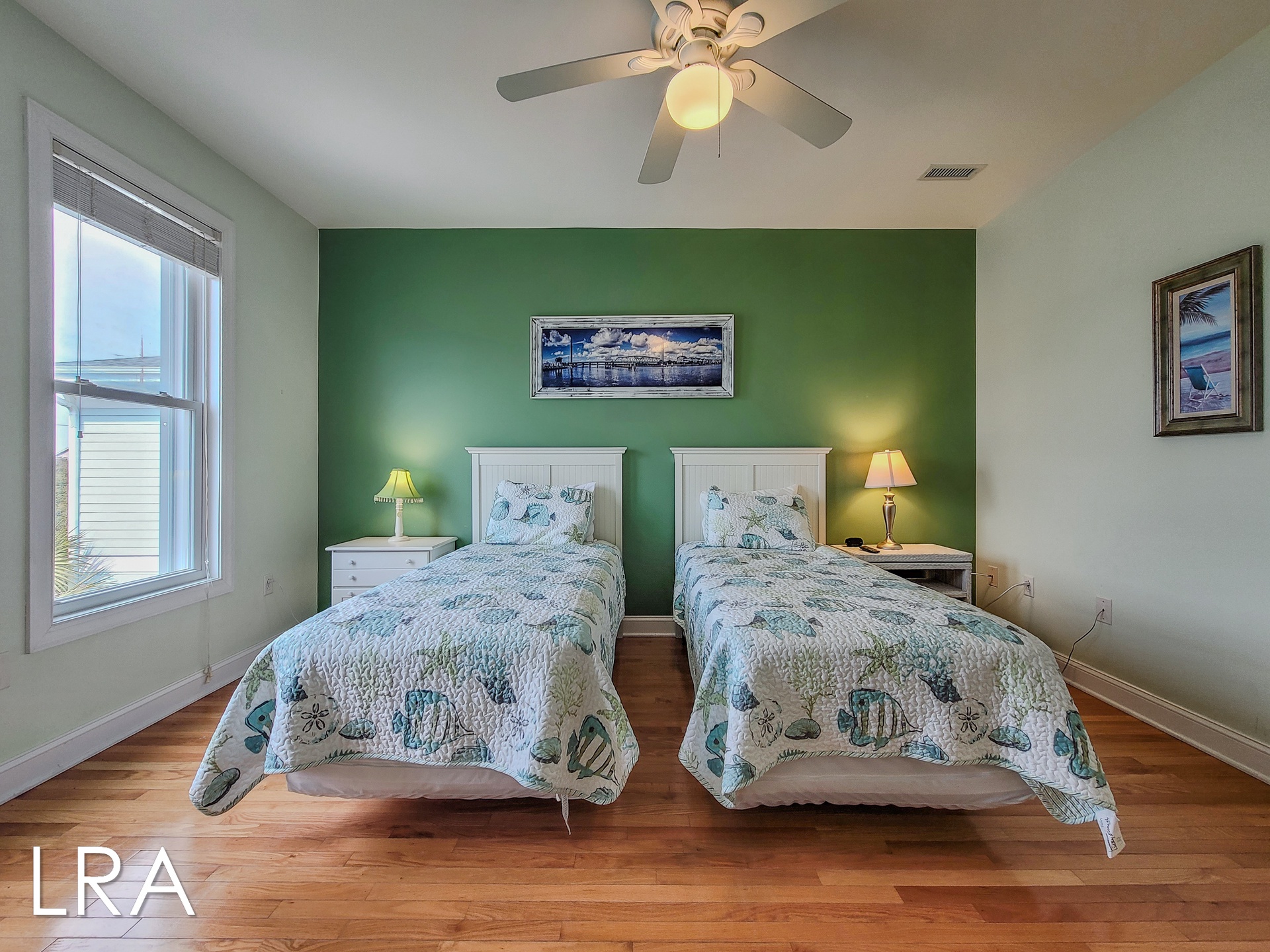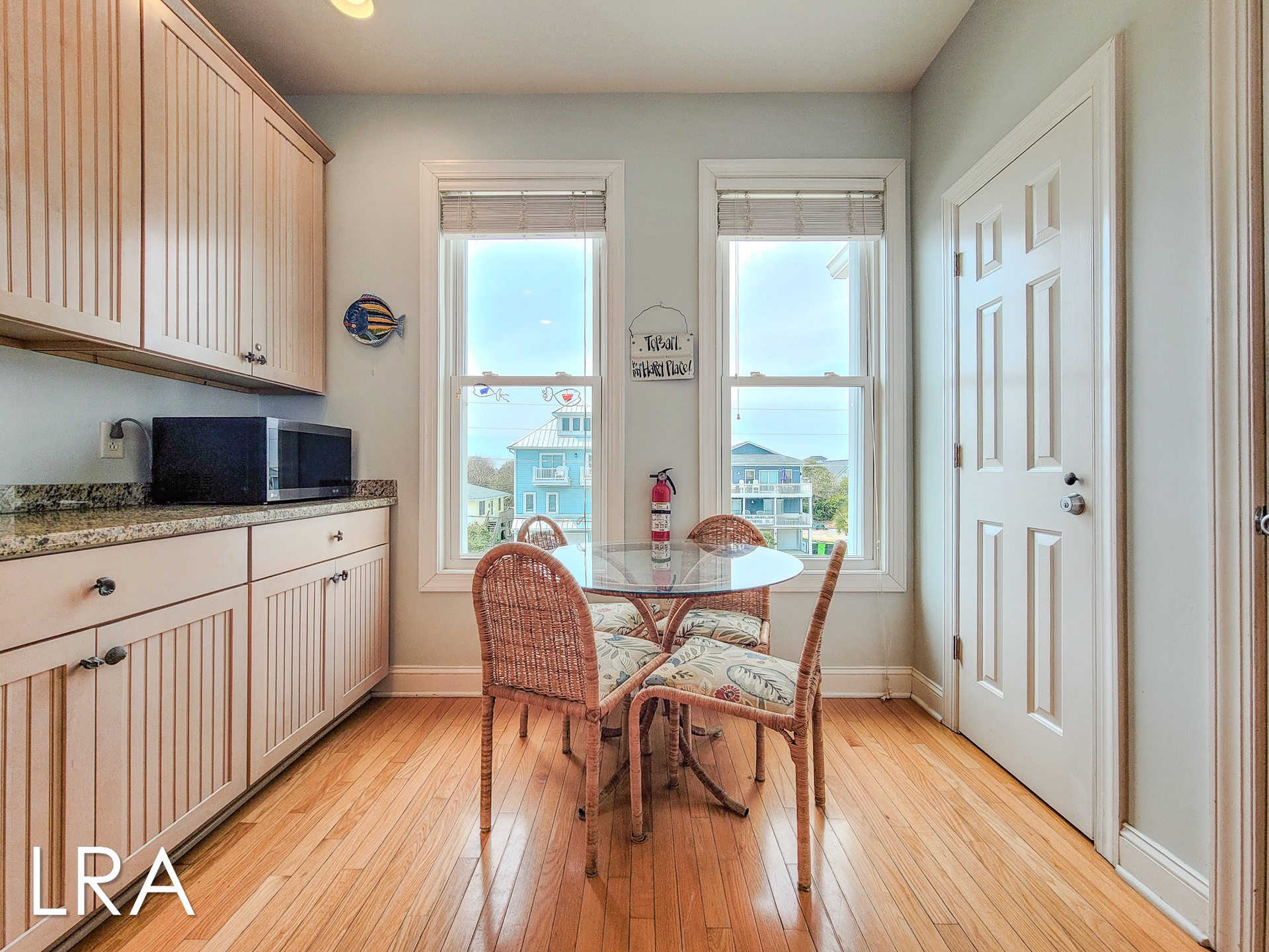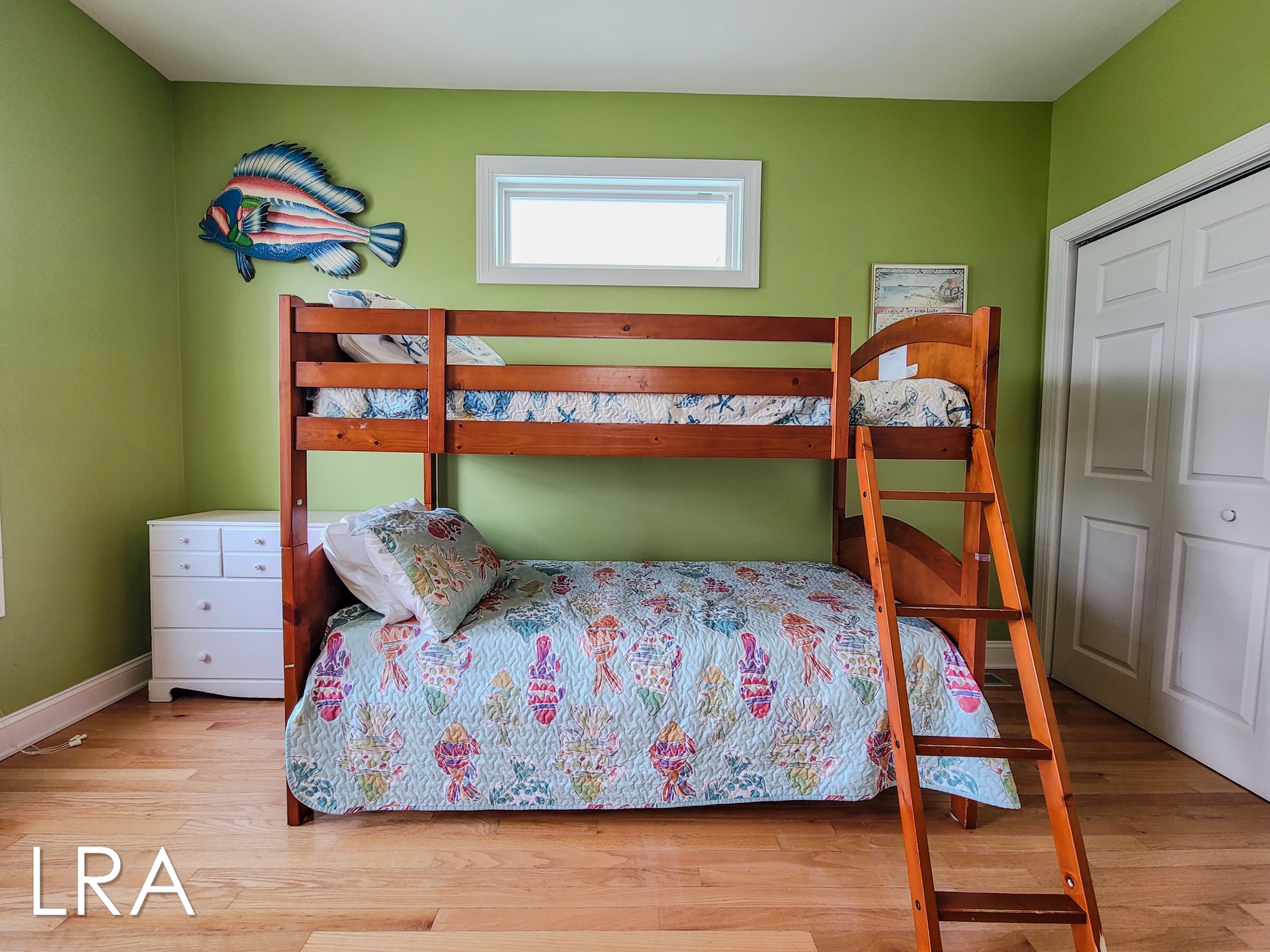 On the first floor, four beautifully appointed bedrooms and three bathrooms provide a cozy, private space for everyone. On the north side, the street-side bedroom includes a bunk bed (two twins) and a daybed with a rollout trundle (two twins), while the oceanfront bedroom features a queen bed and access to the deck. These two bedrooms share a bathroom located in the hallway. On the south side, a street-side bedroom has a queen bed and private bathroom, while the oceanfront master bedroom includes a King bed, private bathroom, and access to the deck.