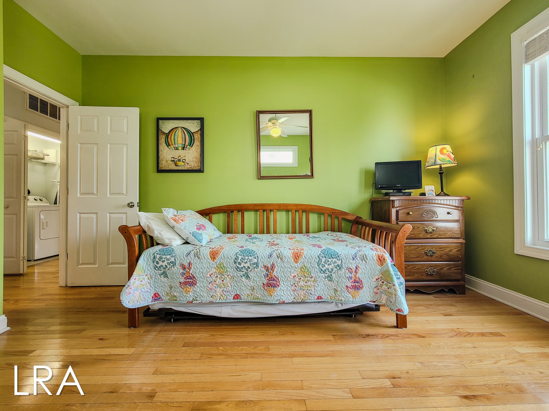 The second floor opens into a spacious great room with a comfortable living area, dining space, and a large, fully equipped kitchen for family meals. A street-side bedroom with two twin beds and a full bathroom at the end of the hall completes the layout of this level.