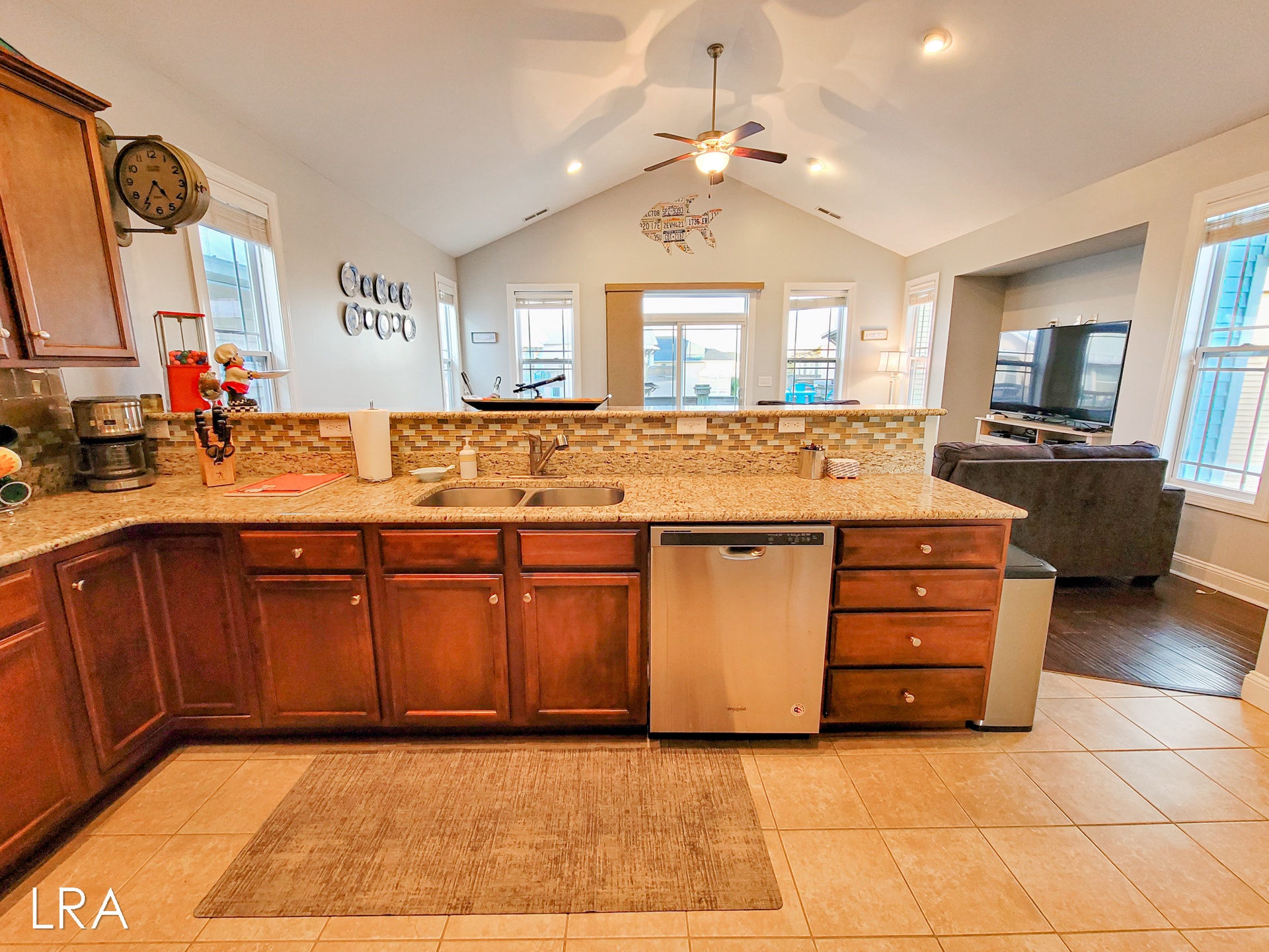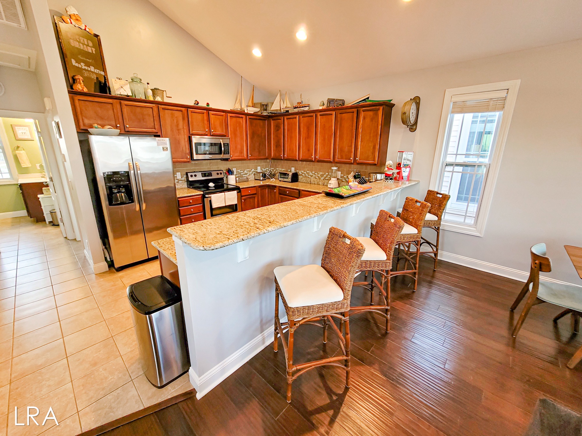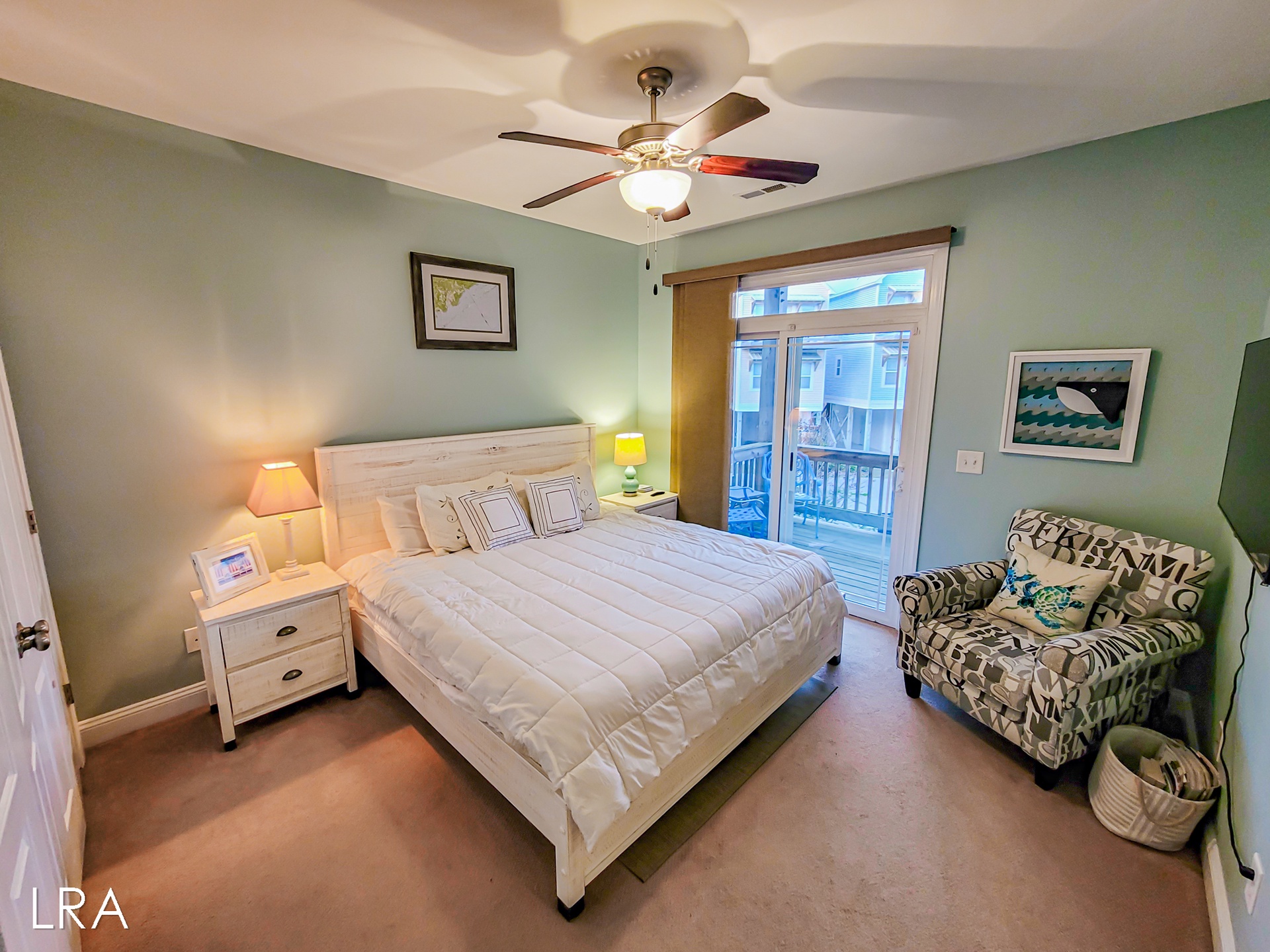 Head upstairs to the top floor where you are greeted by the open living area. The living room features ample seating with multiple couches and a large flat-screen smaaht TV. Enjoy island views through the multiple windows that surround the room. Step outside onto the spacious top-floor deck to enjoy your morning coffee or soak up the sun all afternoon. When it's time to feed the crew head back inside and whip up amazing meals in the stunning well-equipped kitchen. Enjoy your family meals at the large dining room table, complete with 6 chairs. You will also find 4 additional bar stools located at the kitchen bar so everyone can eat together. The final bedroom is located just past the kitchen and offers a king-sized bed flat-screen smaaht tv and street-side views. This bedroom has access to the full shared bath located in the hallway, which offers a tiled shower and vanity sink.