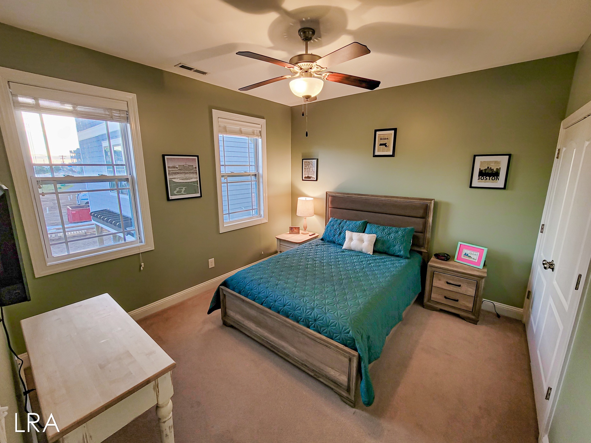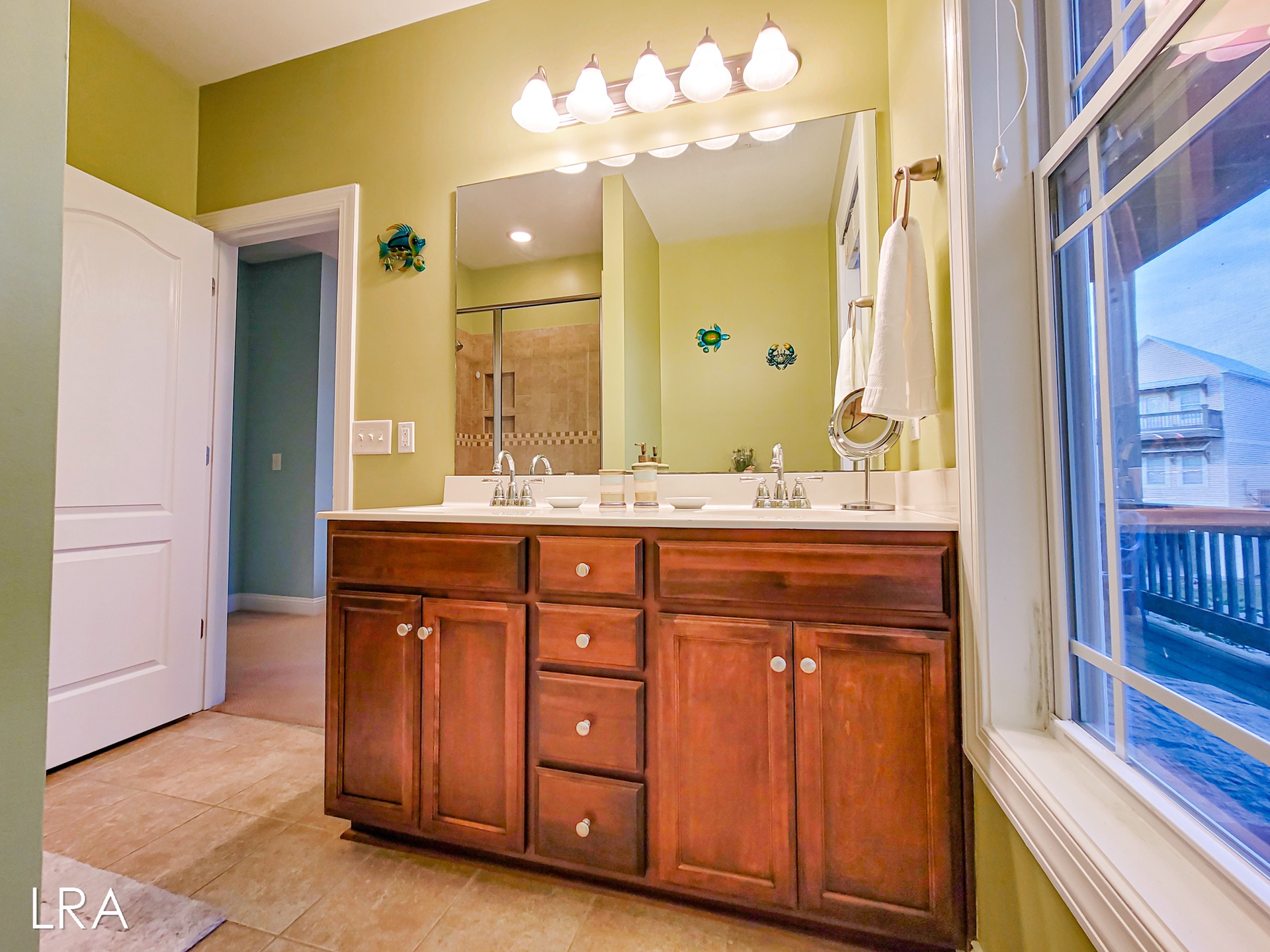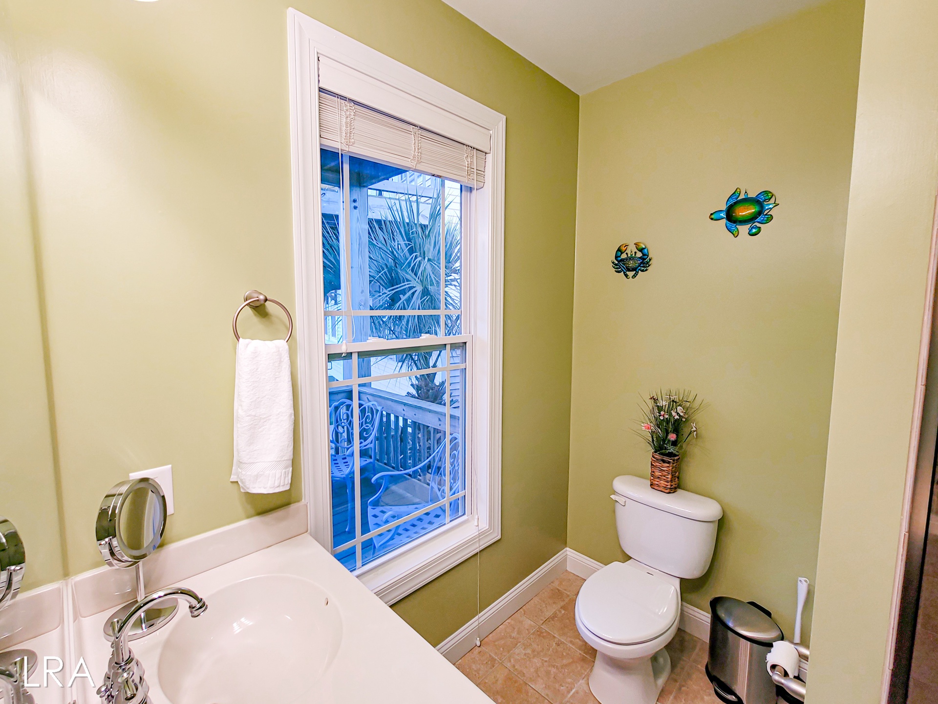 Head upstairs to the top floor where you are greeted by the open living area. The living room features ample seating with multiple couches and a large flat-screen smaaht TV. Enjoy island views through the multiple windows that surround the room. Step outside onto the spacious top-floor deck to enjoy your morning coffee or soak up the sun all afternoon. When it's time to feed the crew head back inside and whip up amazing meals in the stunning well-equipped kitchen. Enjoy your family meals at the large dining room table, complete with 6 chairs. You will also find 4 additional bar stools located at the kitchen bar so everyone can eat together. The final bedroom is located just past the kitchen and offers a king-sized bed flat-screen smaaht tv and street-side views. This bedroom has access to the full shared bath located in the hallway, which offers a tiled shower and vanity sink.