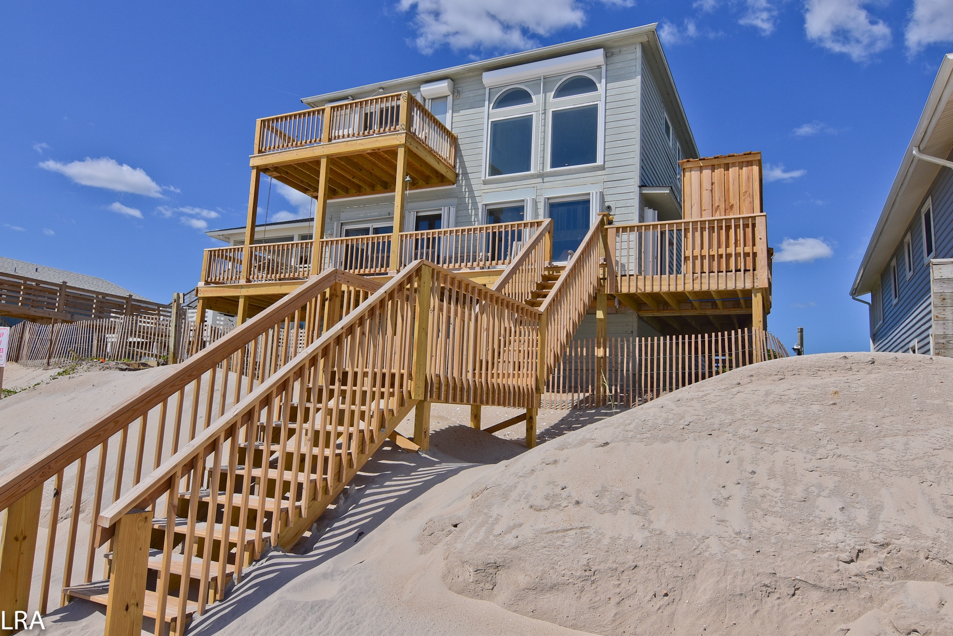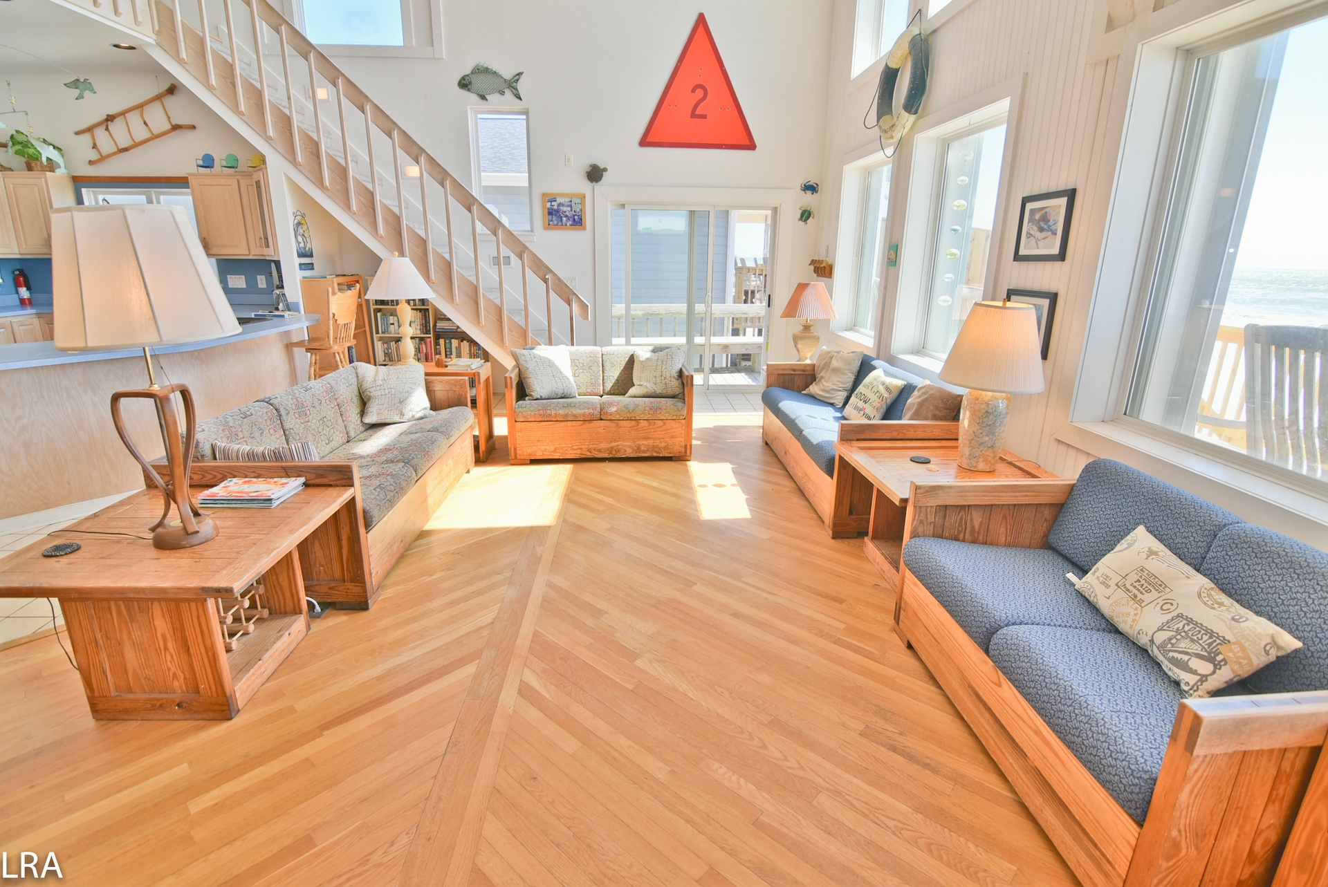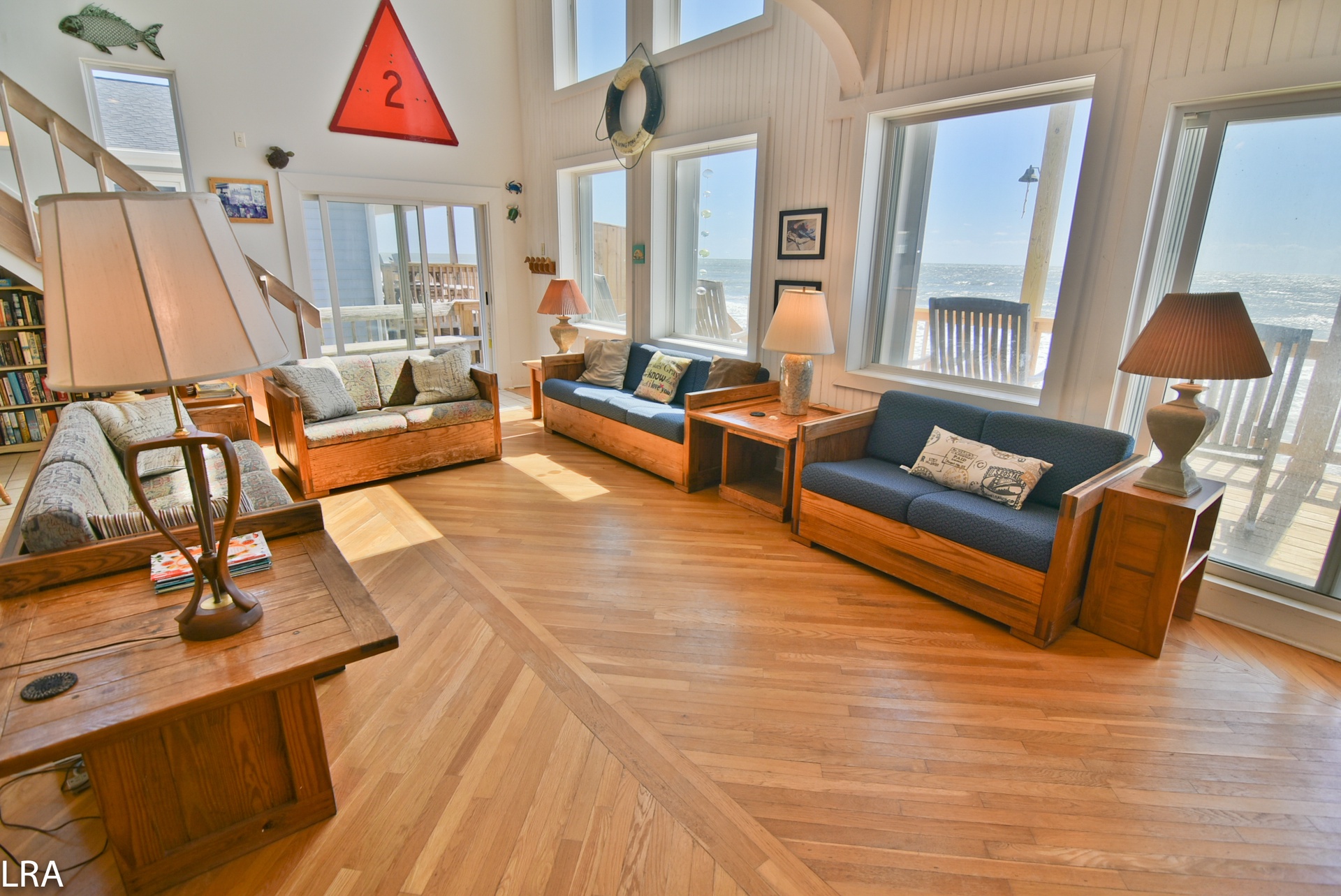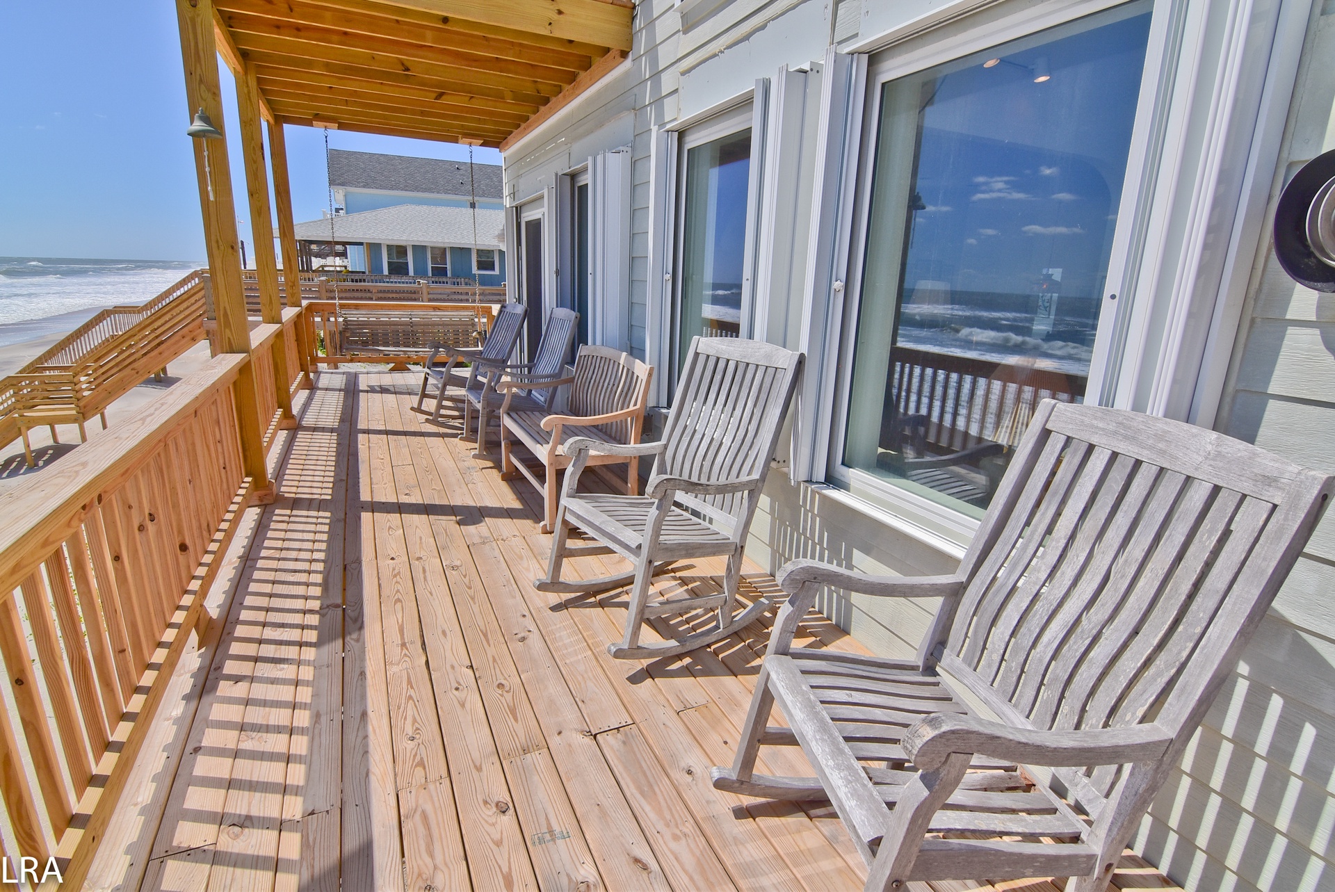 The large, spacious kitchen area provides ample room for several guests to cook simultaneously. Two open dining areas allow for two large tables to be near each other so that guests can dine together without crowding one space. The great room provides plenty of seating for guests and has one large portion open with a tall vaulted ceiling to let in natural light from large oceanfront windows. The oceanfront deck provides ample room for everyone to sit and has rocking chairs and a picnic table with an umbrella to use. Cable TV and high-speed wireless internet are provided for the time you spend indoors. An enclosed outside shower has hot & cold water for when you come in from enjoying the waves. The washer & dryer are located inside the property.