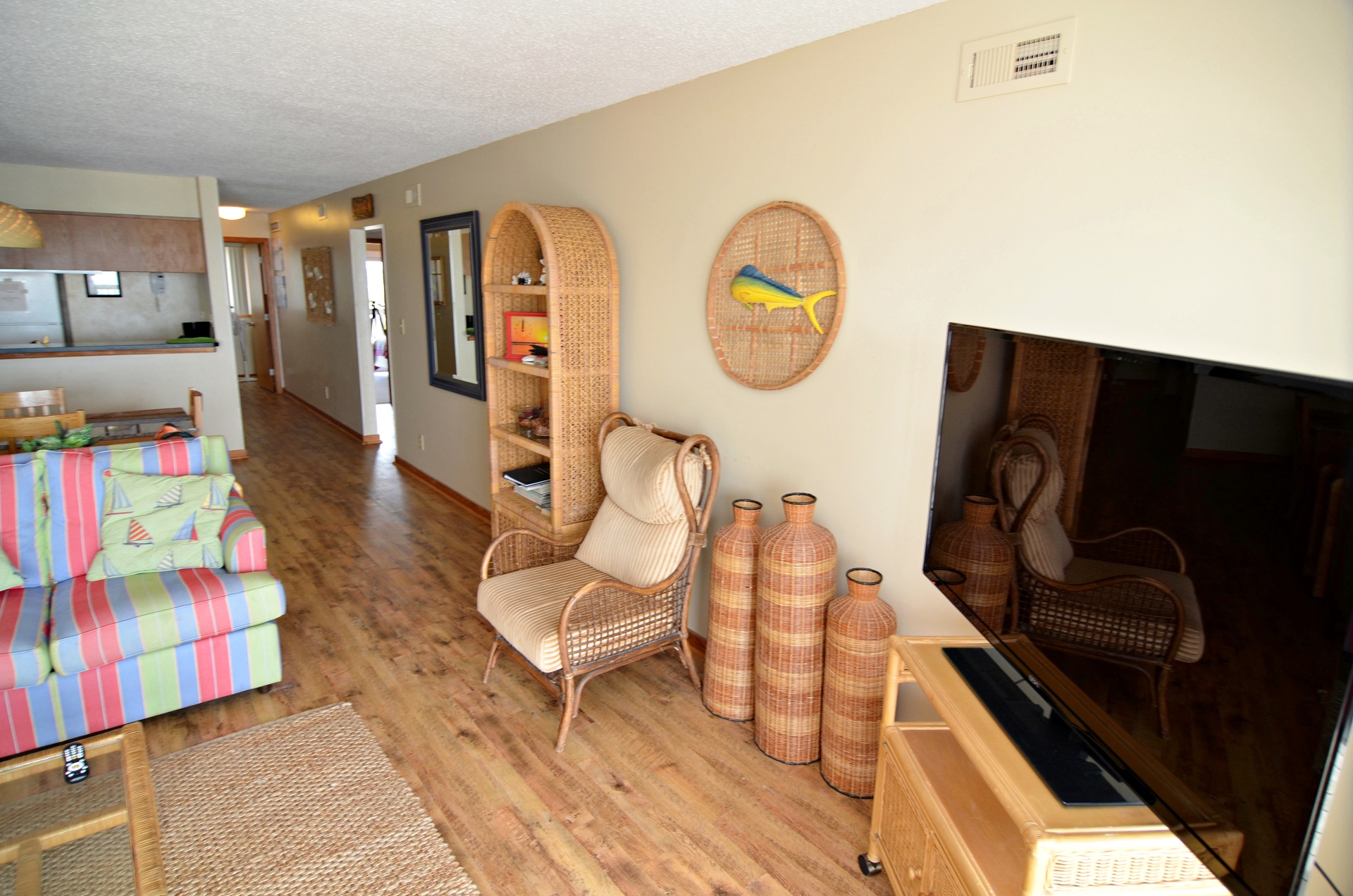 This comfortable condo will ensure your beach vacation is pleasant and cozy. The "rustic meets relaxing" decor makes you feel at home while paying homage to the earthy feel of early beach cottages. Wake up each morning to that gorgeous ocean view from the master bedroom, then take your coffee and bagel out on the oceanfront deck so the sound of the waves can alleviate all that built-up stress and worry from daily life. If you need to go to the beach, just step out on the oceanfront deck and take the connecting walkway to the nearest beach access, all the while never letting the ocean view go out of sight! Do you have a fishing boat or jet skis? The sound side of the complex has boat docks, a boat ramp, and trailer parking (first come, first serve). You can't go wrong with Queen's Grant, and you'll be greatly relaxed with the wonderful atmosphere of B-105.