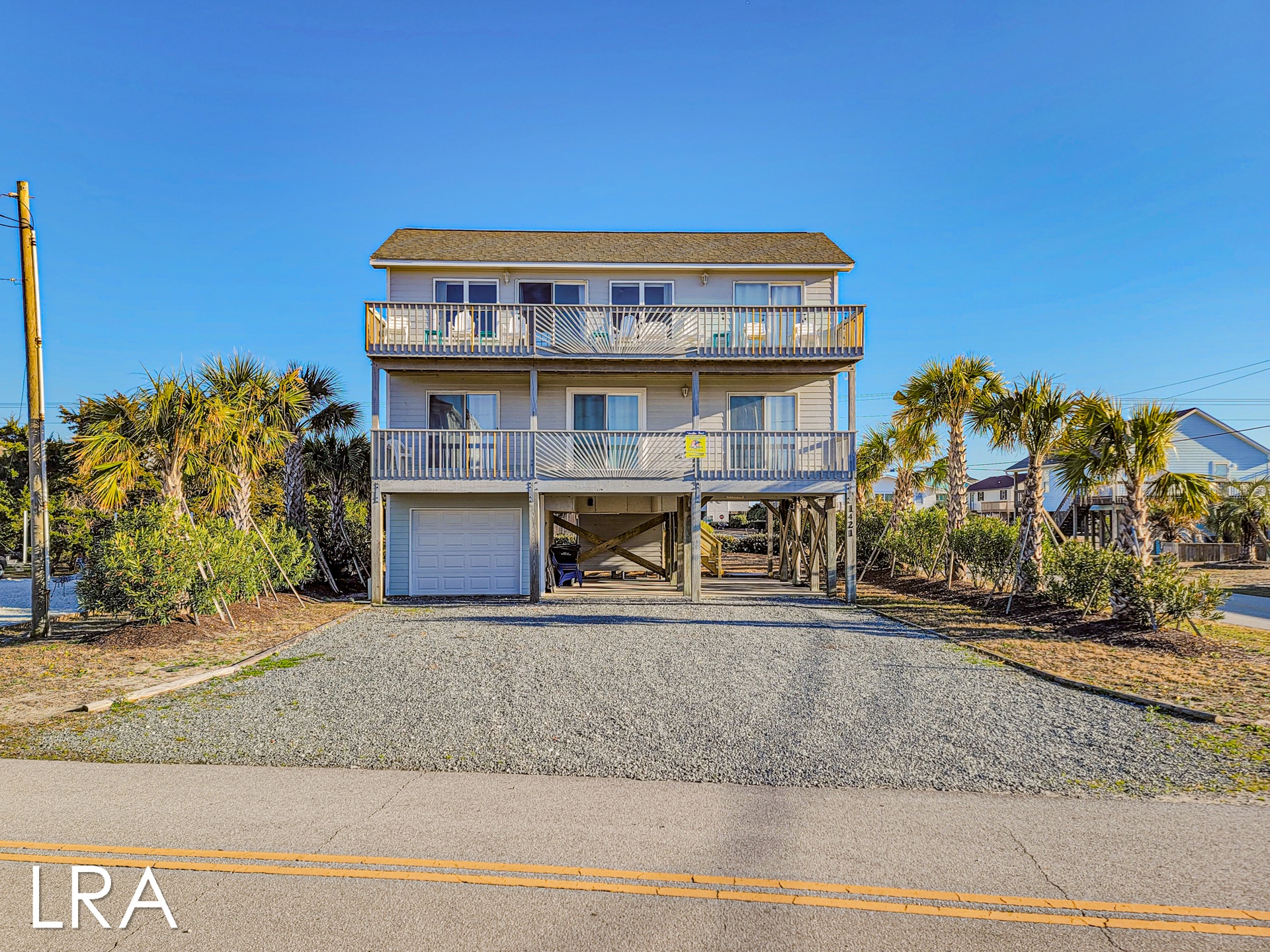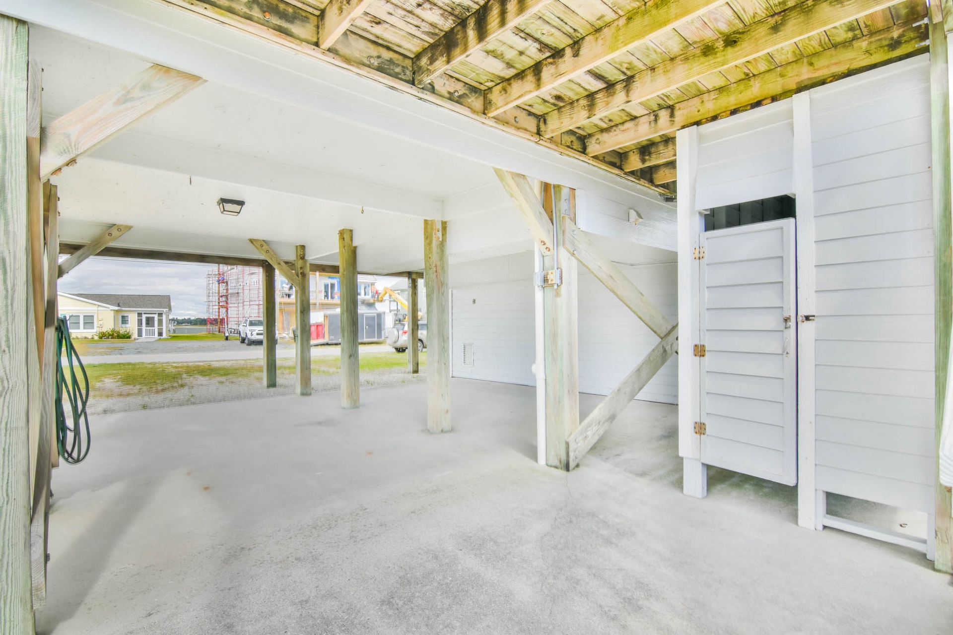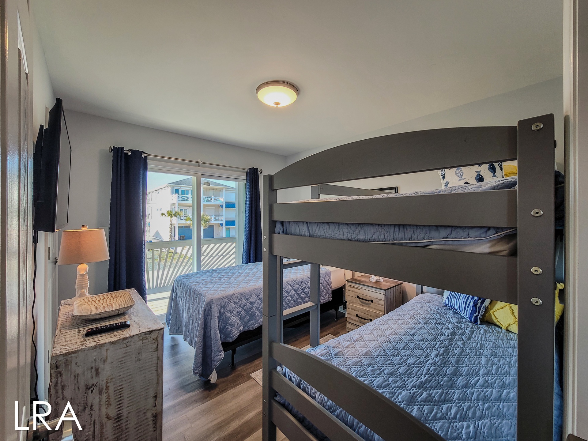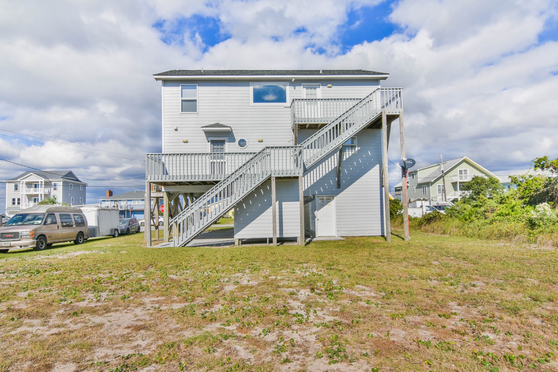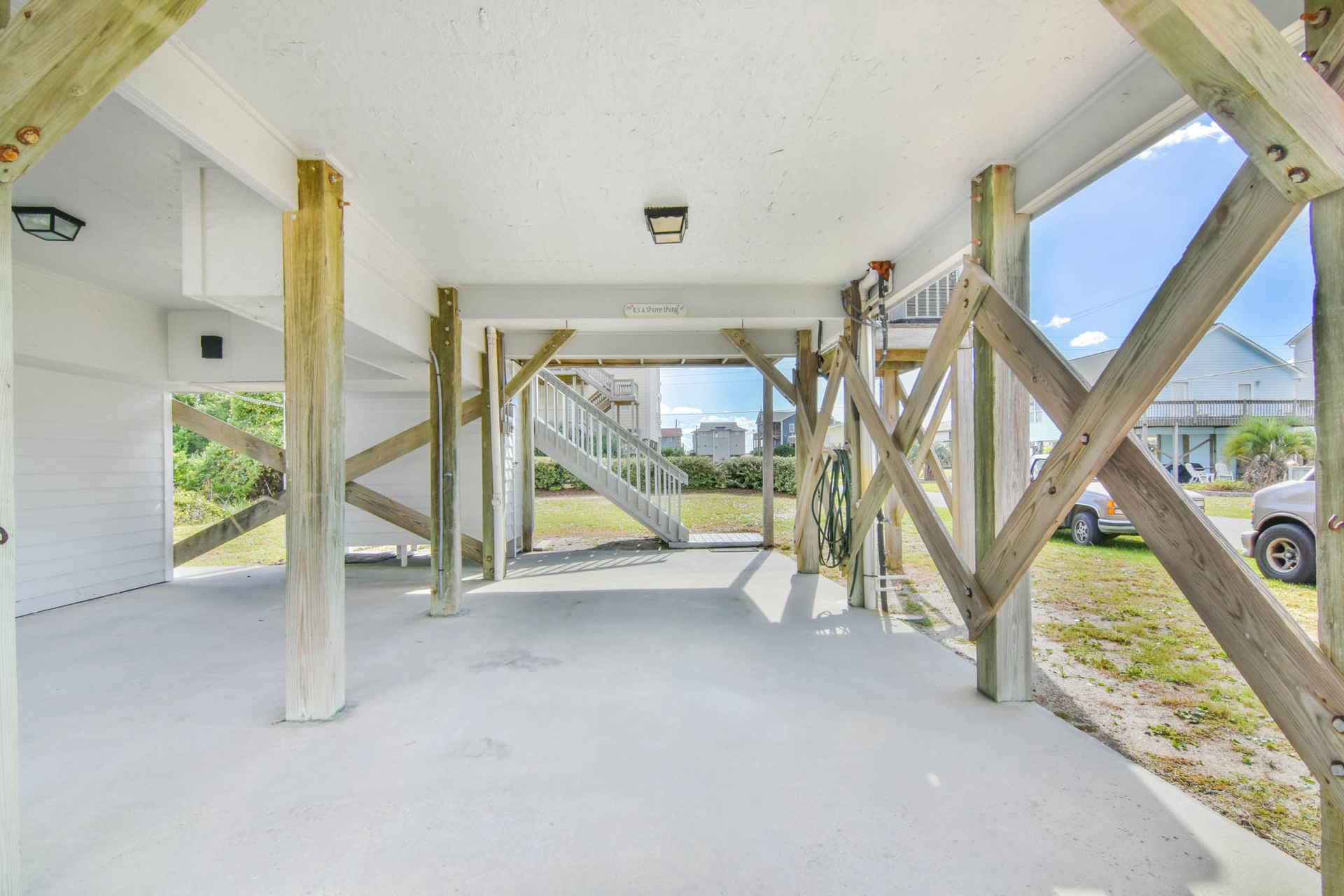 As you arrive at the property you are greeted by ample parking, both covered and not covered. The carport area offers easy access to the hot and cold enclosed shower so you can wash the sand away before you head inside. Accessible from the backside of the house, the main door is located on the middle floor and offers personal pin pad access for guest entry. Access codes will be sent to guests shortly before arrival. You will enter this reverse floor plan property on the bedroom level. Directly ahead is the Queen bedroom. This room offers a Queen Bed, Flat Screen Smart TV, sound side deck access, and access to the shared full bathroom. The next bedroom down the hall is the Twin Bunk room. This room offers a Twin bed and a set of Twin Bunk Beds, along with a Flat Screen Smart TV, and sound side deck access. The last bedroom on this floor is located at the end of the hall and would be considered the Master Suite. This room offers a King Bed, private full bath with tub, Flat Screen Smart TV, and access to the sound side deck as well. The full-sized washer and dryer are located in the hall behind the bifold doors for easy access.