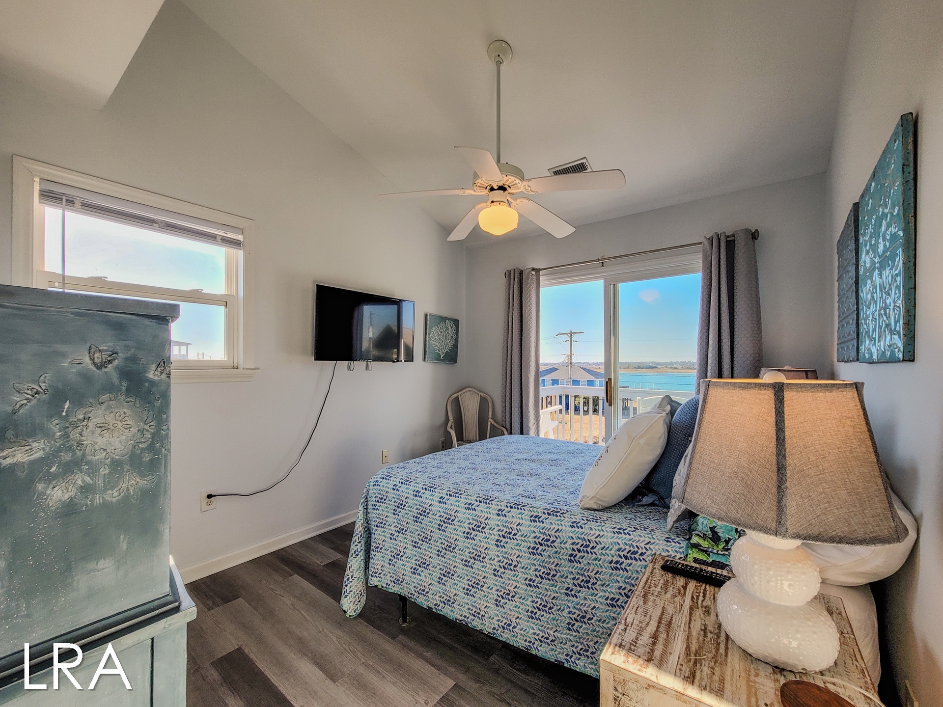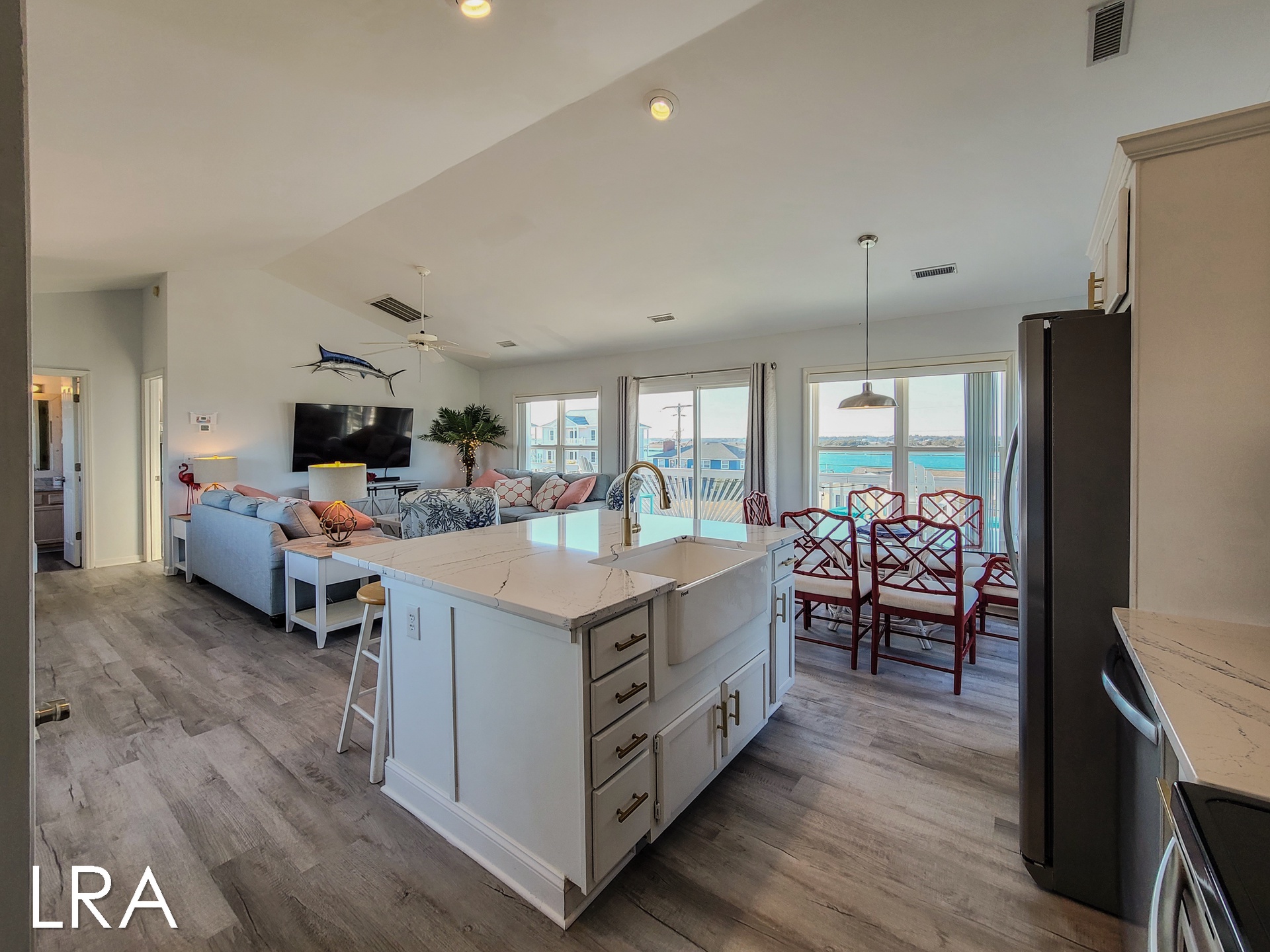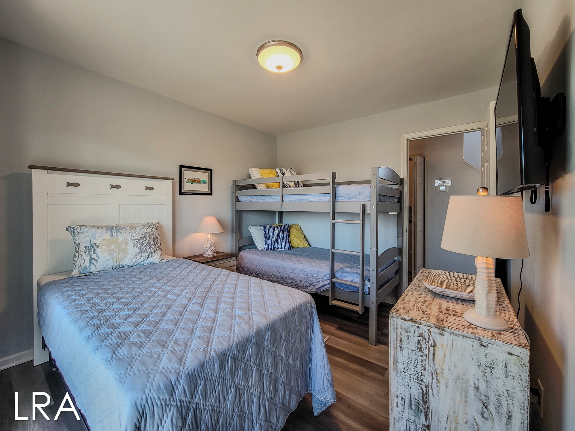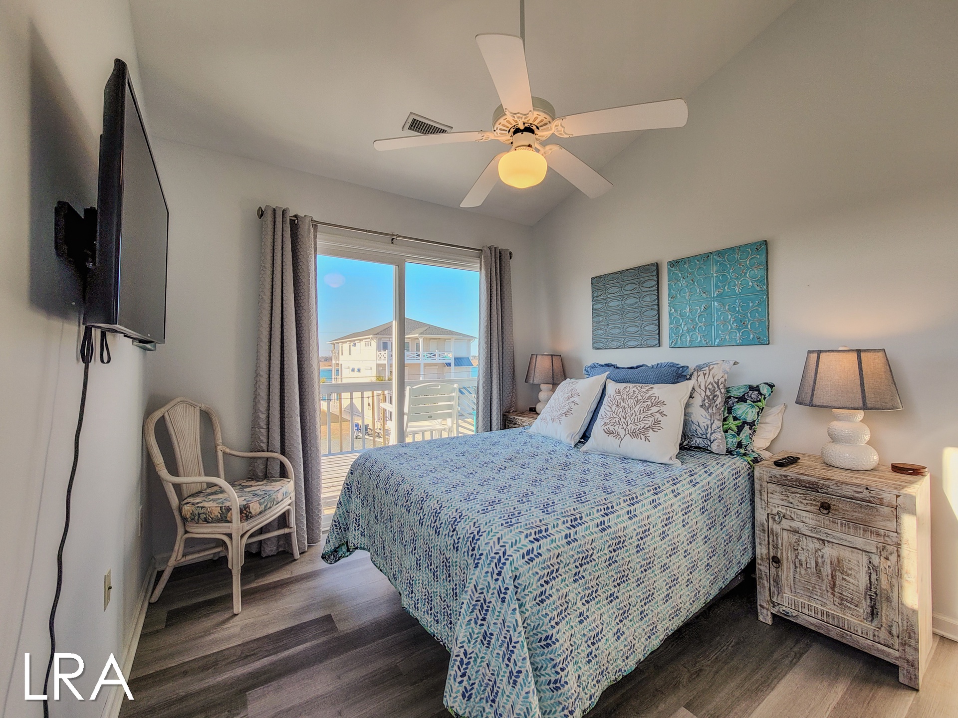 As you arrive at the property you are greeted by ample parking, both covered and not covered. The carport area offers easy access to the hot and cold enclosed shower so you can wash the sand away before you head inside. Accessible from the backside of the house, the main door is located on the middle floor and offers personal pin pad access for guest entry. Access codes will be sent to guests shortly before arrival. You will enter this reverse floor plan property on the bedroom level. Directly ahead is the Queen bedroom. This room offers a Queen Bed, Flat Screen Smart TV, sound side deck access, and access to the shared full bathroom. The next bedroom down the hall is the Twin Bunk room. This room offers a Twin bed and a set of Twin Bunk Beds, along with a Flat Screen Smart TV, and sound side deck access. The last bedroom on this floor is located at the end of the hall and would be considered the Master Suite. This room offers a King Bed, private full bath with tub, Flat Screen Smart TV, and access to the sound side deck as well. The full-sized washer and dryer are located in the hall behind the bifold doors for easy access.