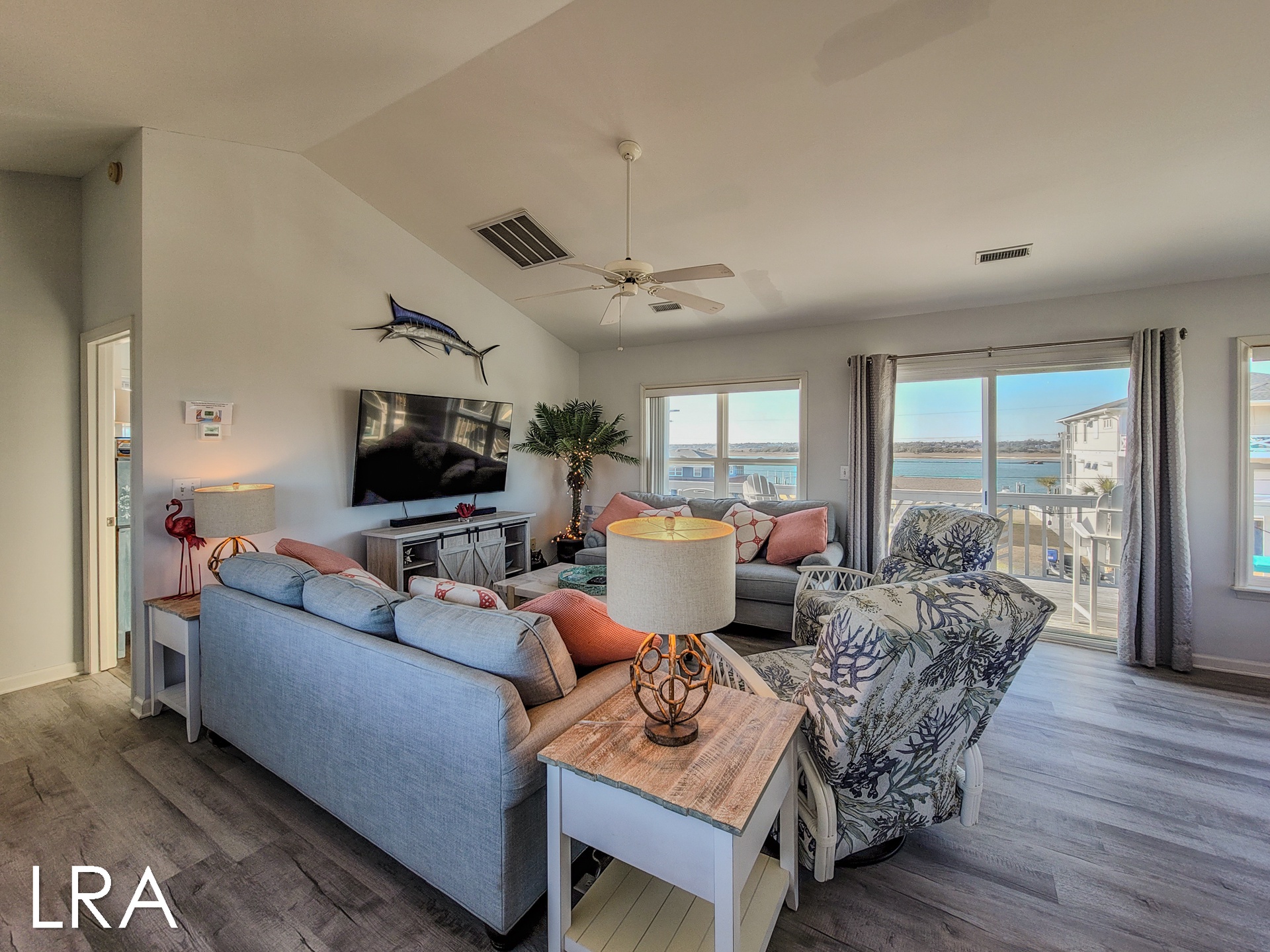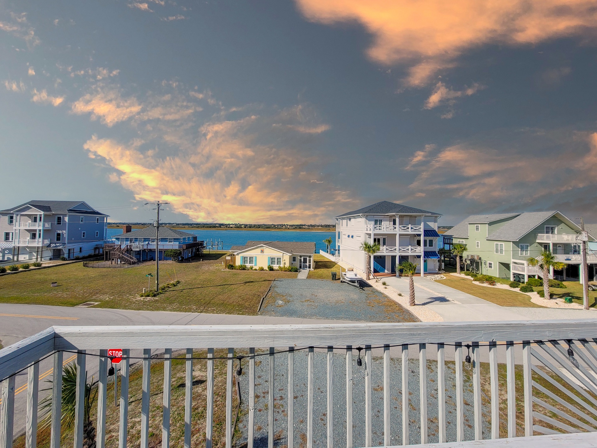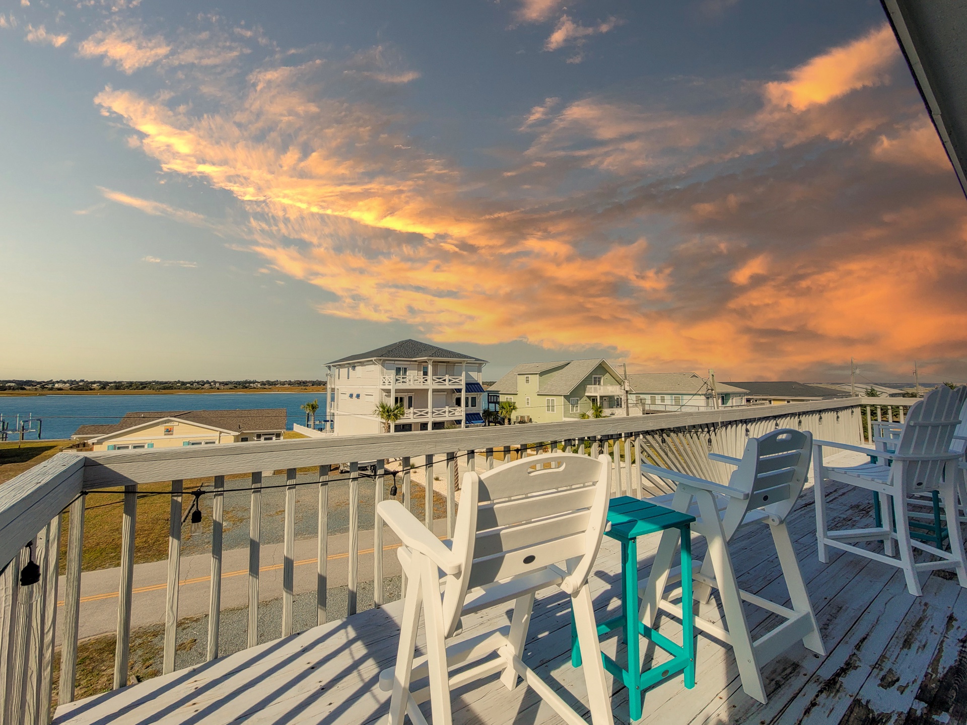 Upstairs, on the main living floor, you are greeted by breathtaking views through the sliding glass doors and multiple windows on the sound side of the house. The modern kitchen is stocked with stainless steel appliances and a plethora of basic cooking essentials including pots, pans, dinnerware, and utensils. The dining room offers seating for 6 at the table as well as 4 additional stools at the bar, so the whole family can gather together to enjoy fresh local seafood and each other's company. The open living room area offers comfortable custom couches and decorative chairs so that you can relax after a long day on the beach. Gather around the large Flat Screen Smart TV to catch up on your favorite shows and movies when you have had enough fun in the sun for the day. The sliding glass doors in the living room lead you to the spacious sound side deck where you can sit out and enjoy watching the boats travel down the Intracoastal waterway. At the end of a long day nothing beats the spectacular sunset views, so pull up a chair and enjoy the show! Just off the living room, you will find the final bed and bathroom. This bedroom offers a Queen bed, Flat Screen Smart TV, and access to the sound side deck. The shared full bathroom for this floor is located at the end of the hall and offers a vanity sink and shower stall.