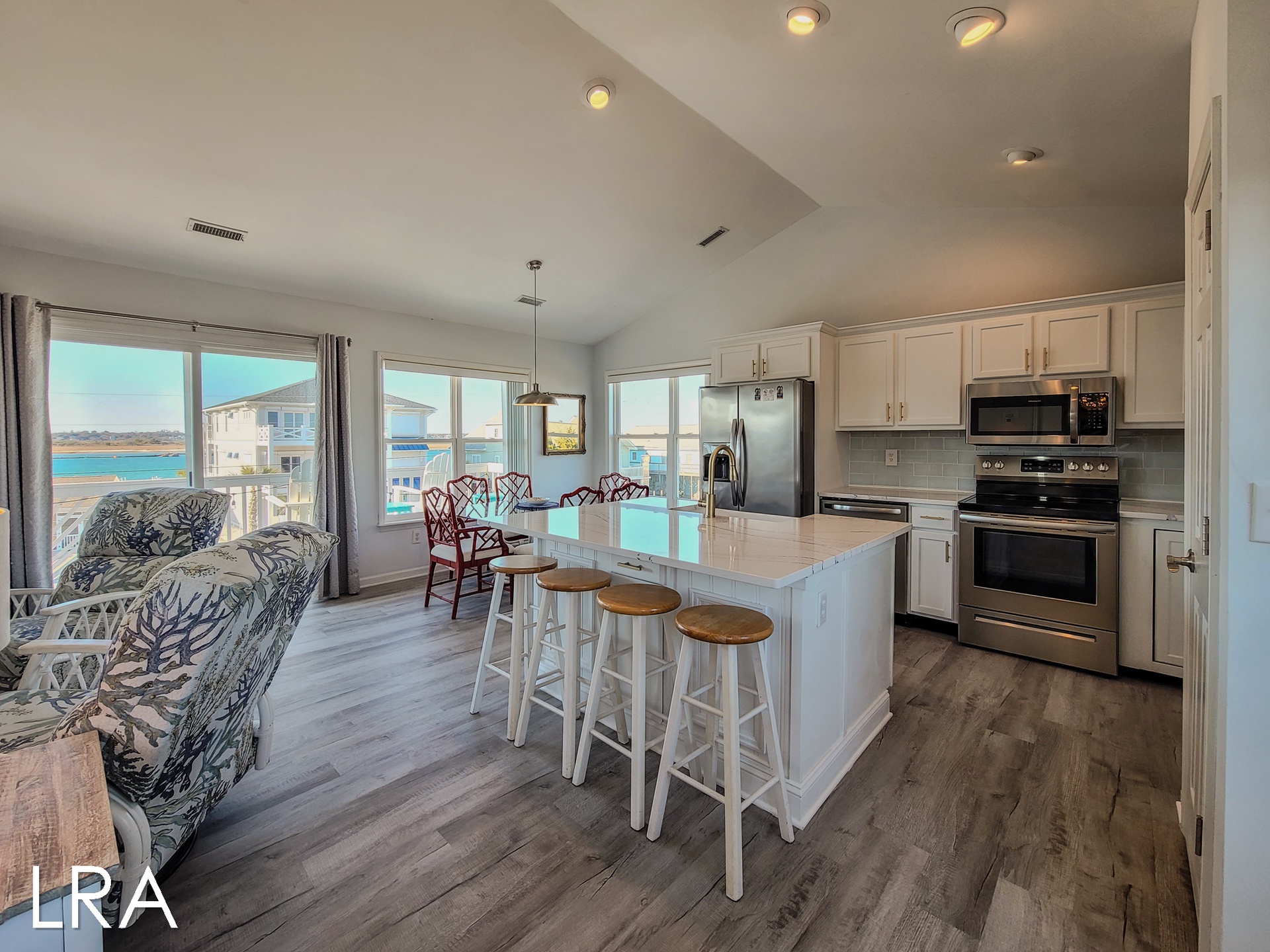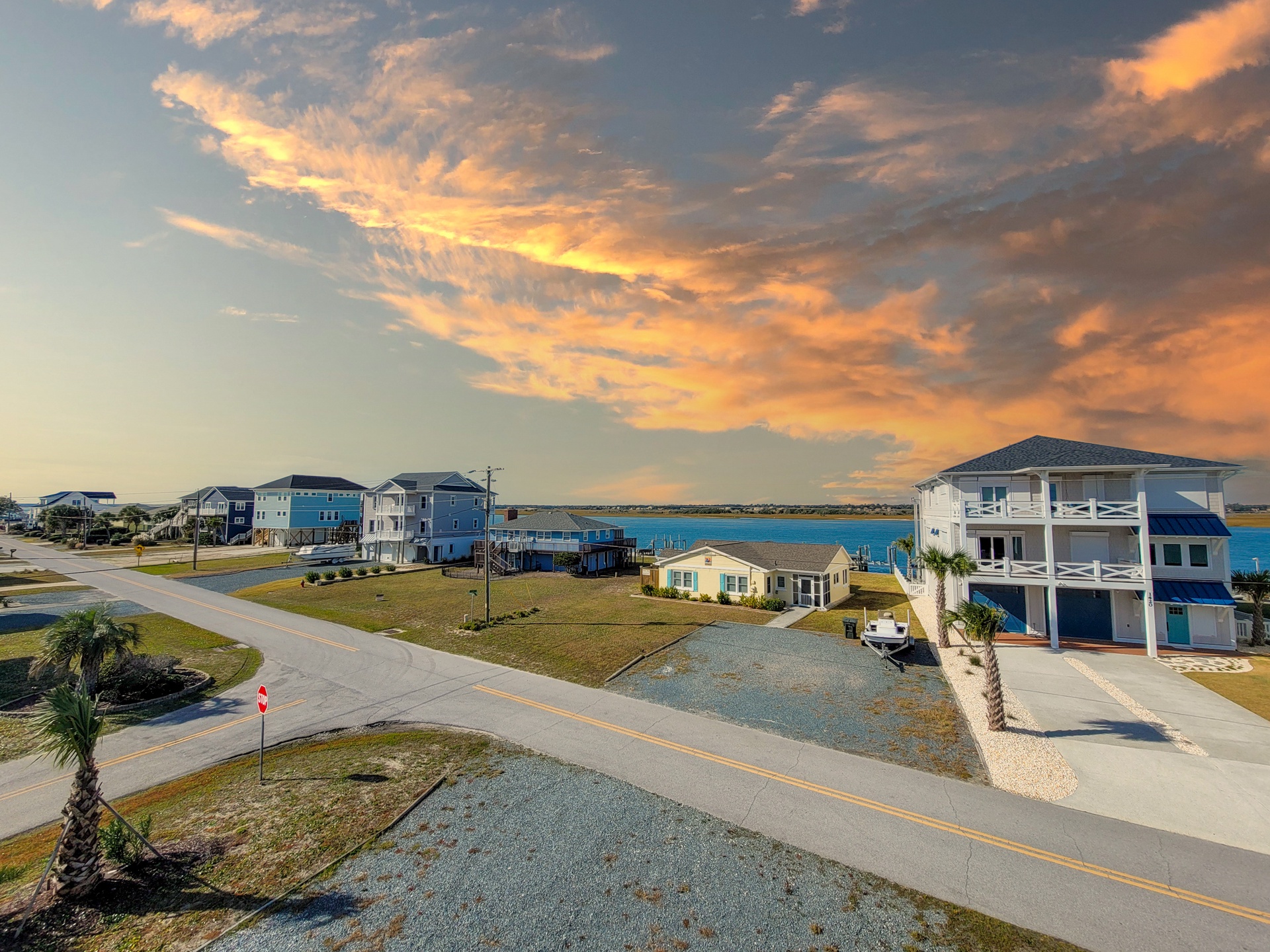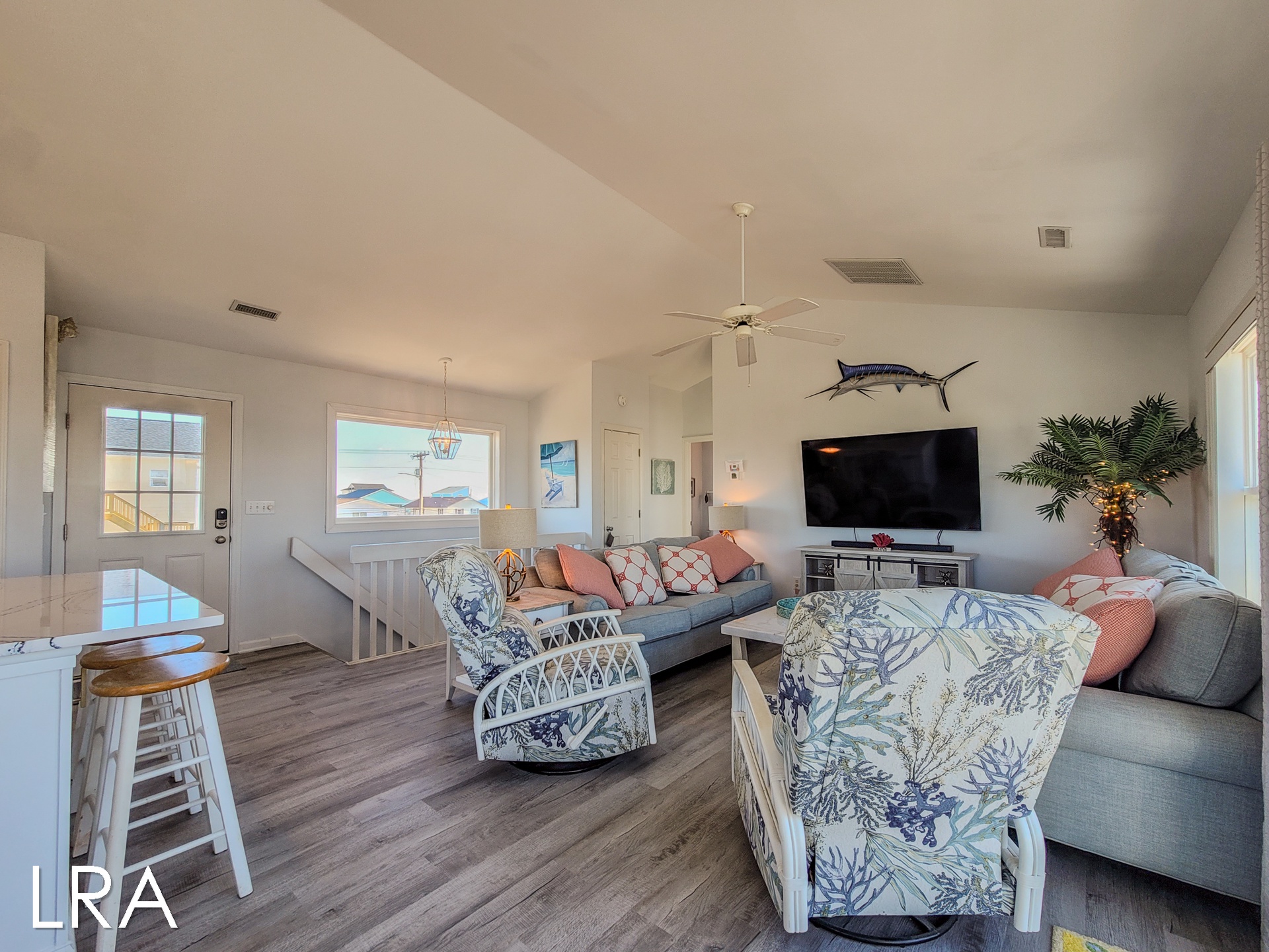 Upstairs, on the main living floor, you are greeted by breathtaking views through the sliding glass doors and multiple windows on the sound side of the house. The modern kitchen is stocked with stainless steel appliances and a plethora of basic cooking essentials including pots, pans, dinnerware, and utensils. The dining room offers seating for 6 at the table as well as 4 additional stools at the bar, so the whole family can gather together to enjoy fresh local seafood and each other's company. The open living room area offers comfortable custom couches and decorative chairs so that you can relax after a long day on the beach. Gather around the large Flat Screen Smart TV to catch up on your favorite shows and movies when you have had enough fun in the sun for the day. The sliding glass doors in the living room lead you to the spacious sound side deck where you can sit out and enjoy watching the boats travel down the Intracoastal waterway. At the end of a long day nothing beats the spectacular sunset views, so pull up a chair and enjoy the show! Just off the living room, you will find the final bed and bathroom. This bedroom offers a Queen bed, Flat Screen Smart TV, and access to the sound side deck. The shared full bathroom for this floor is located at the end of the hall and offers a vanity sink and shower stall.