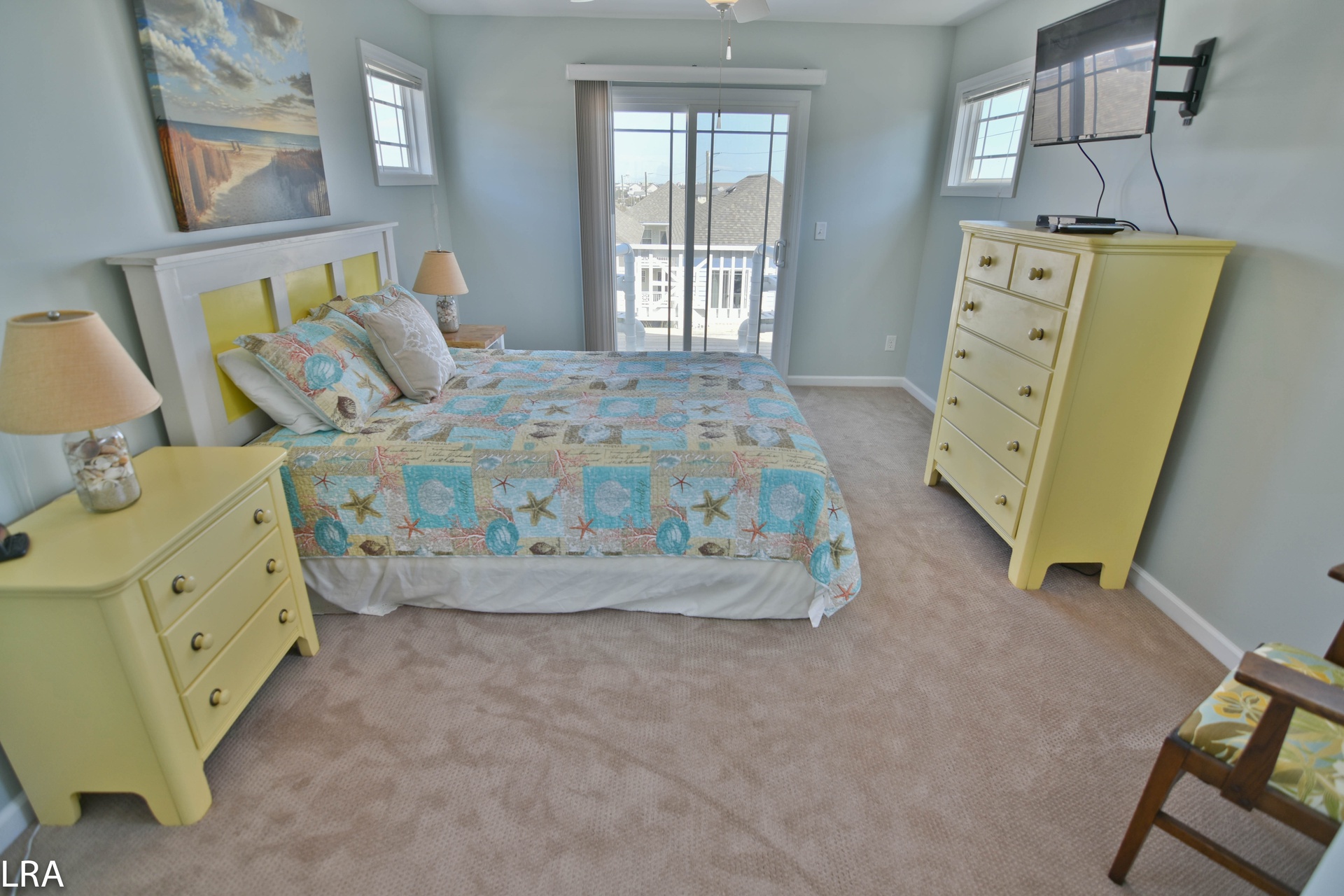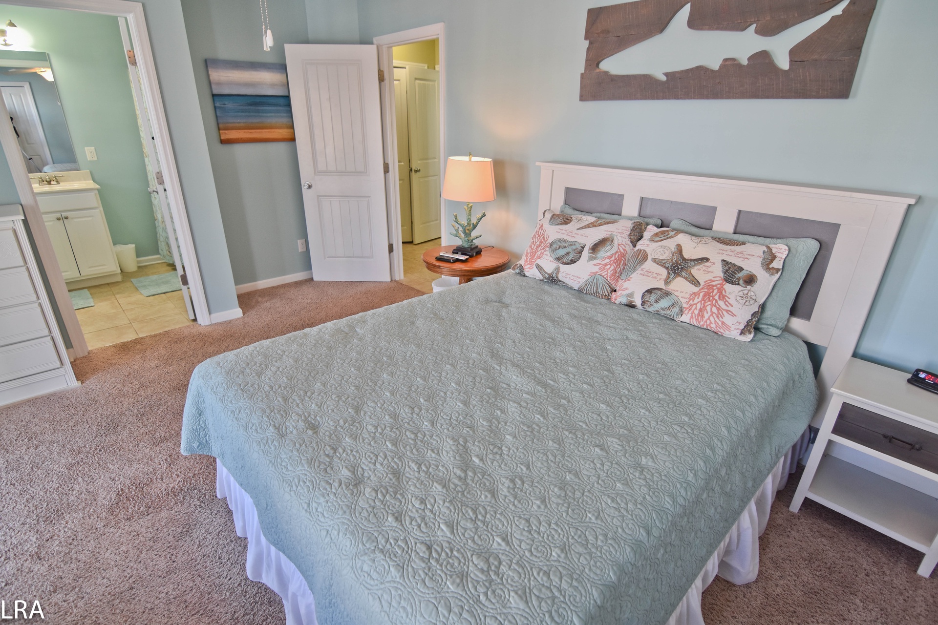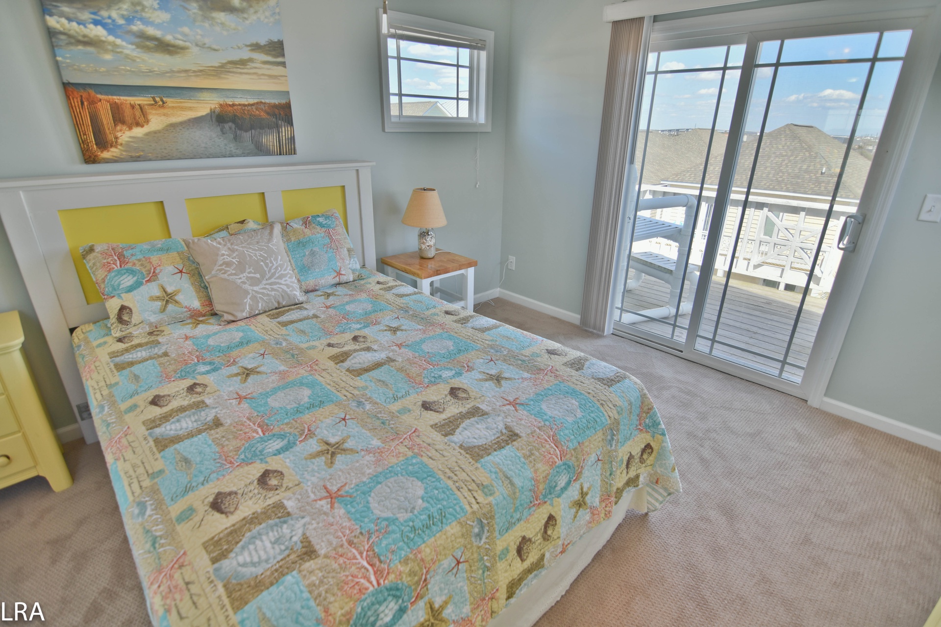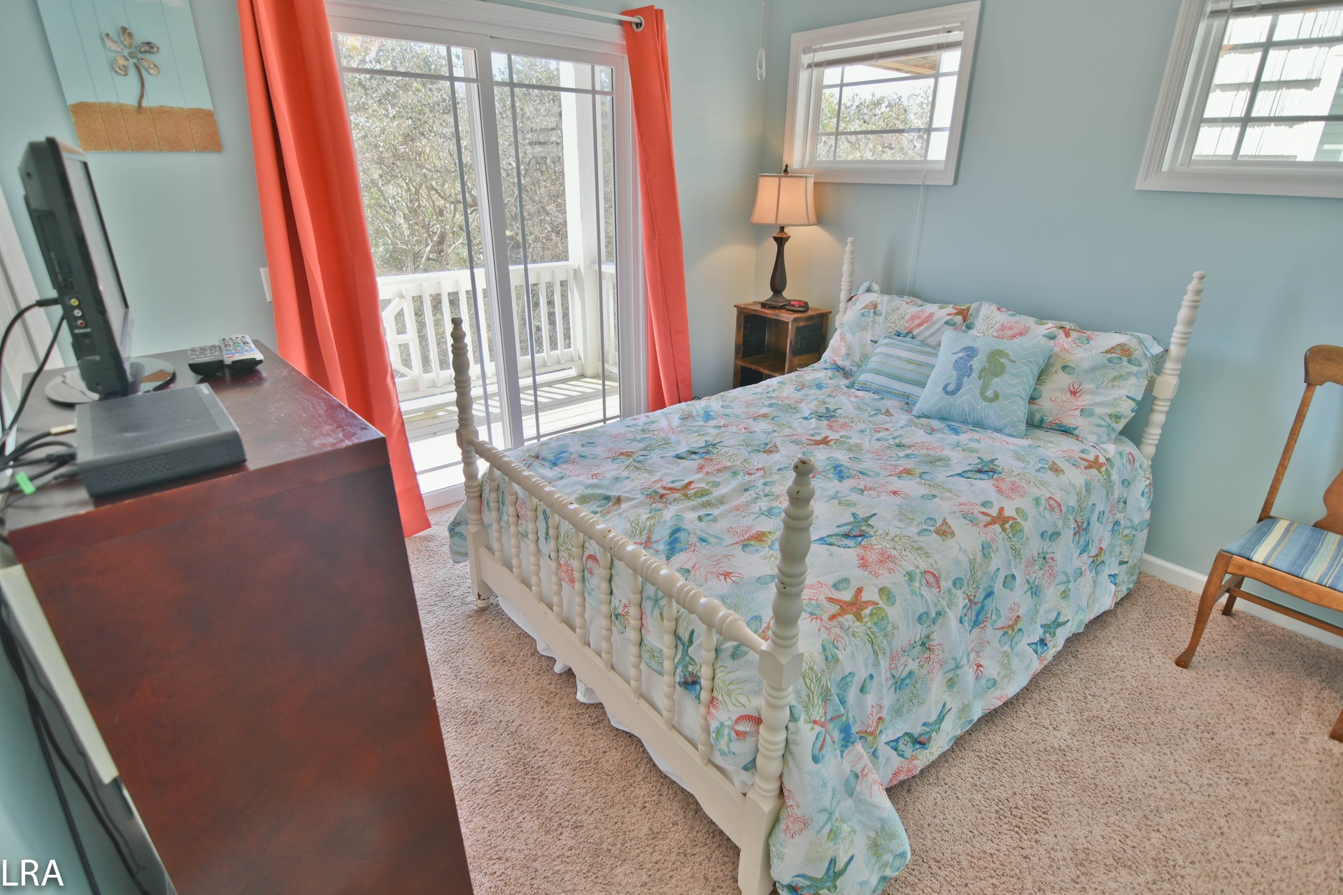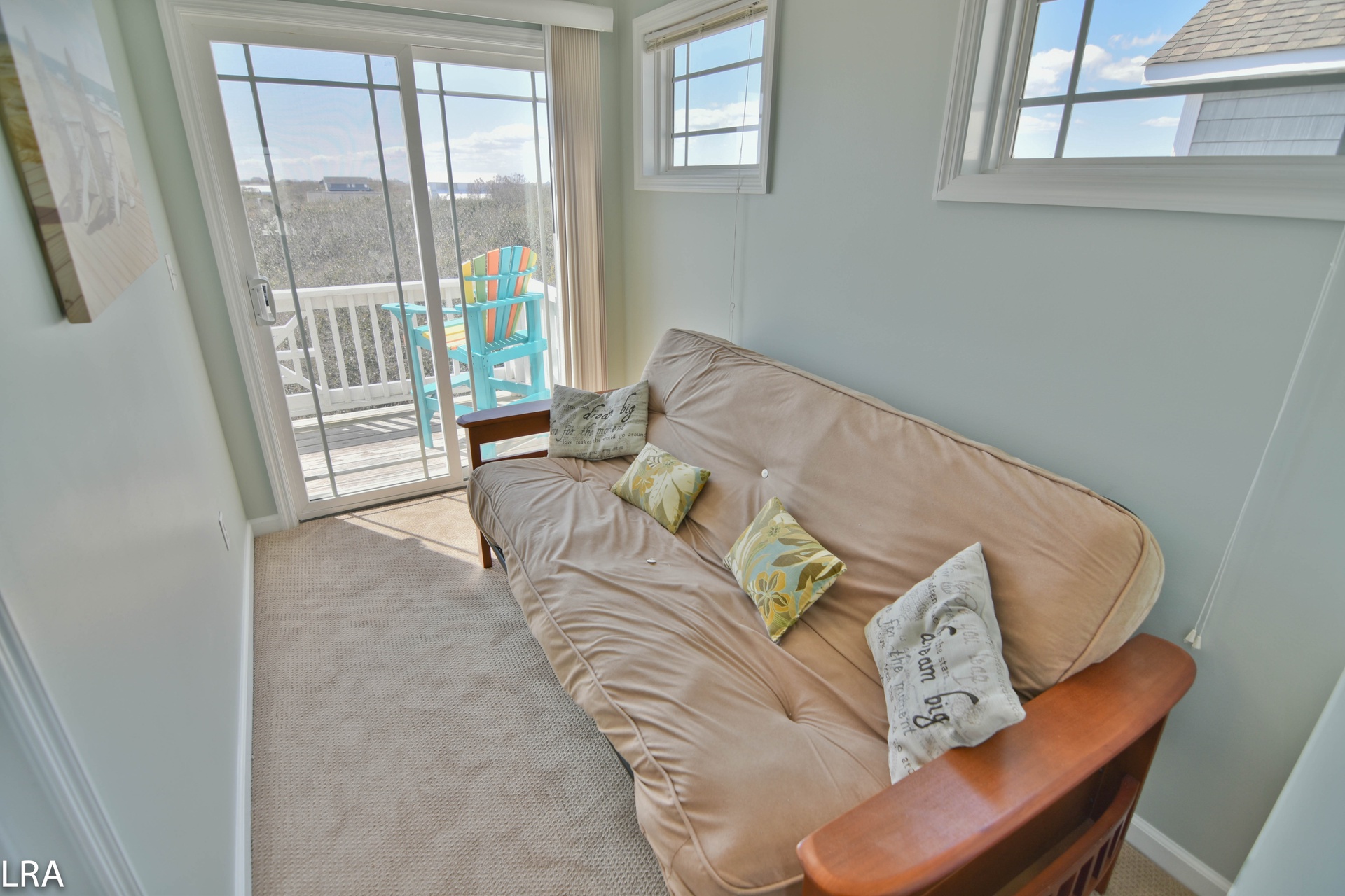 Up the stairs, you will find the master suite exclusive to the top floor. The bedroom features a queen bed with flat panel television. The master suite also offers a full bath to keep you from having to run downstairs. There is direct access to the private deck which quite possibly offers some of the best views Topsail Island has to offer. The deck gives you a 360-degree view of the salt marshes, the town itself, and of course the Atlantic Ocean! On the master suite level, there is a small bonus room with a futon for the little one. This room also has access to its own deck.