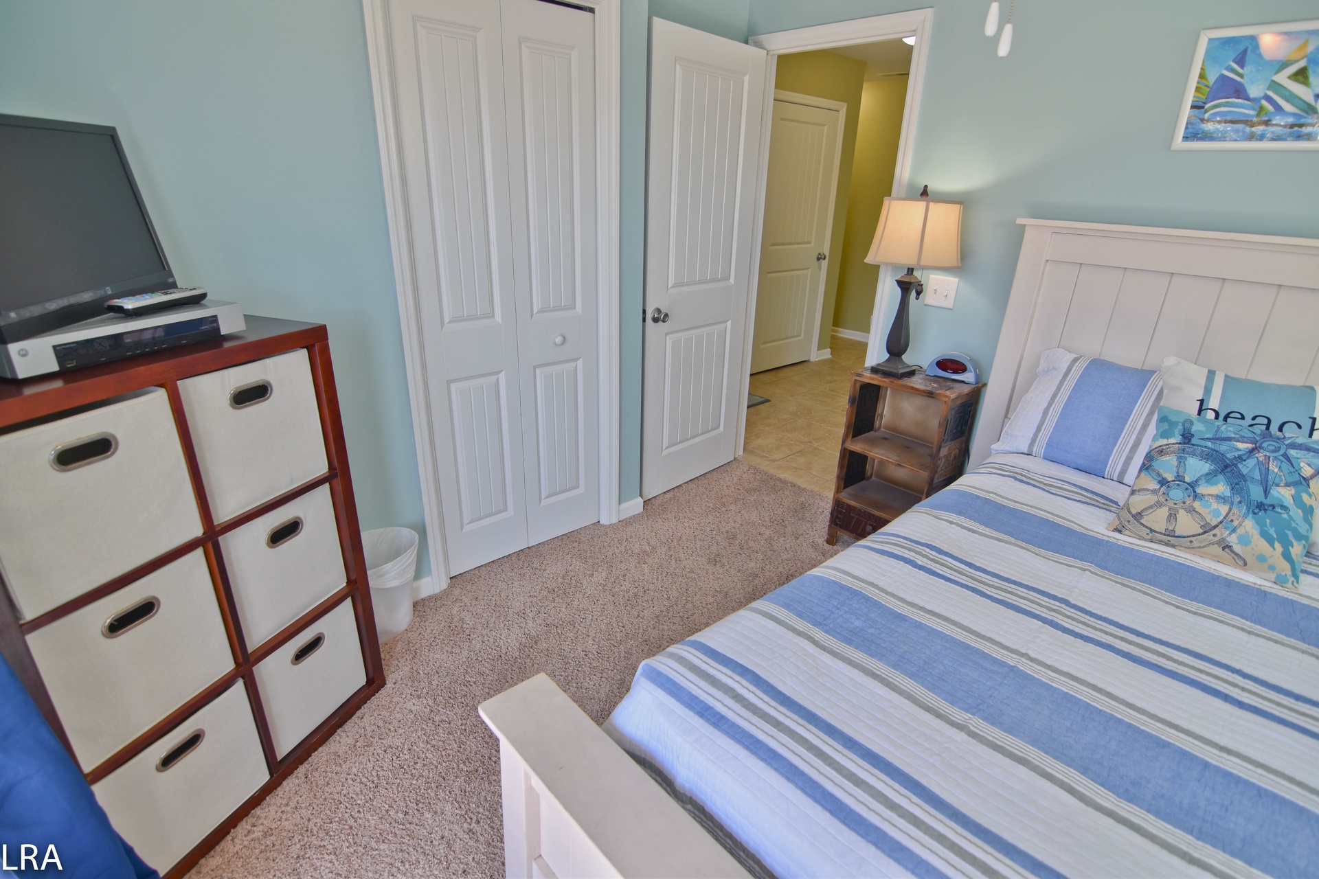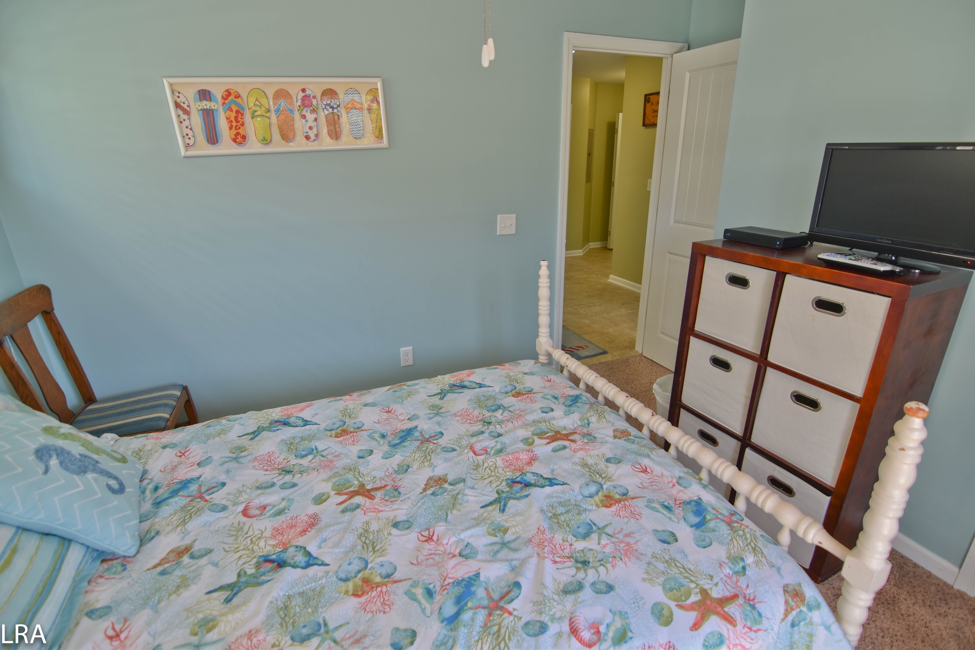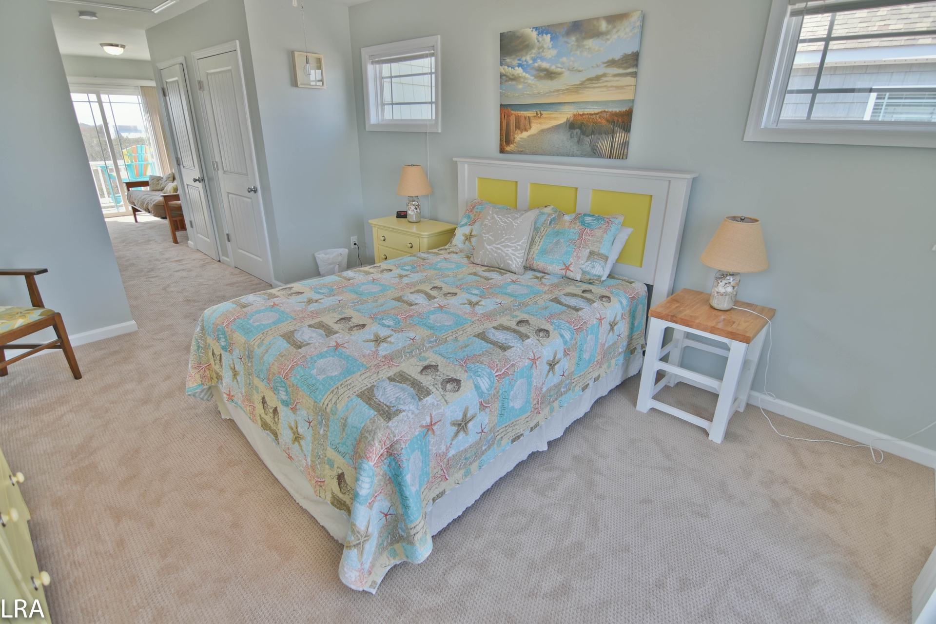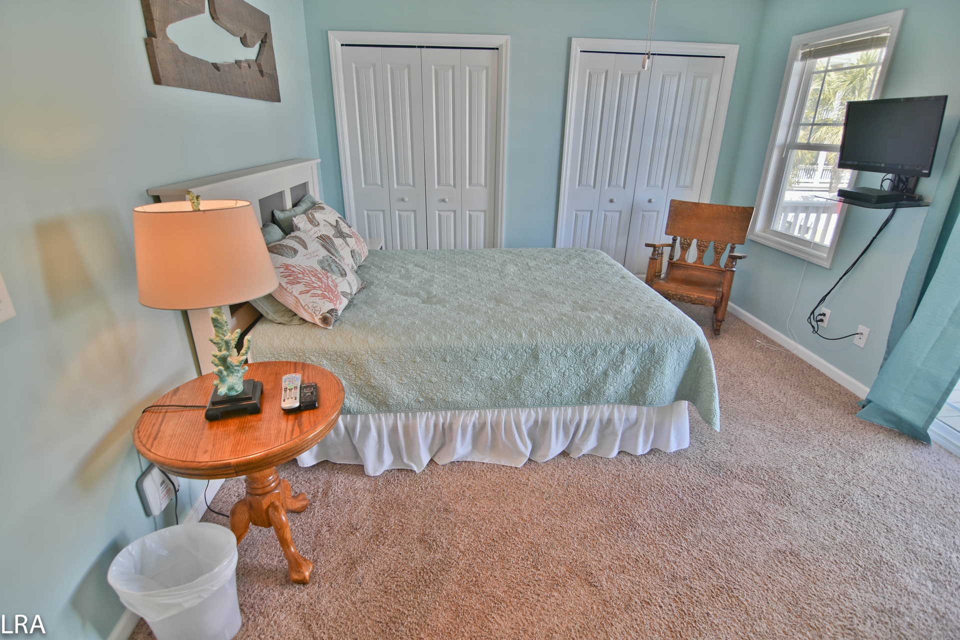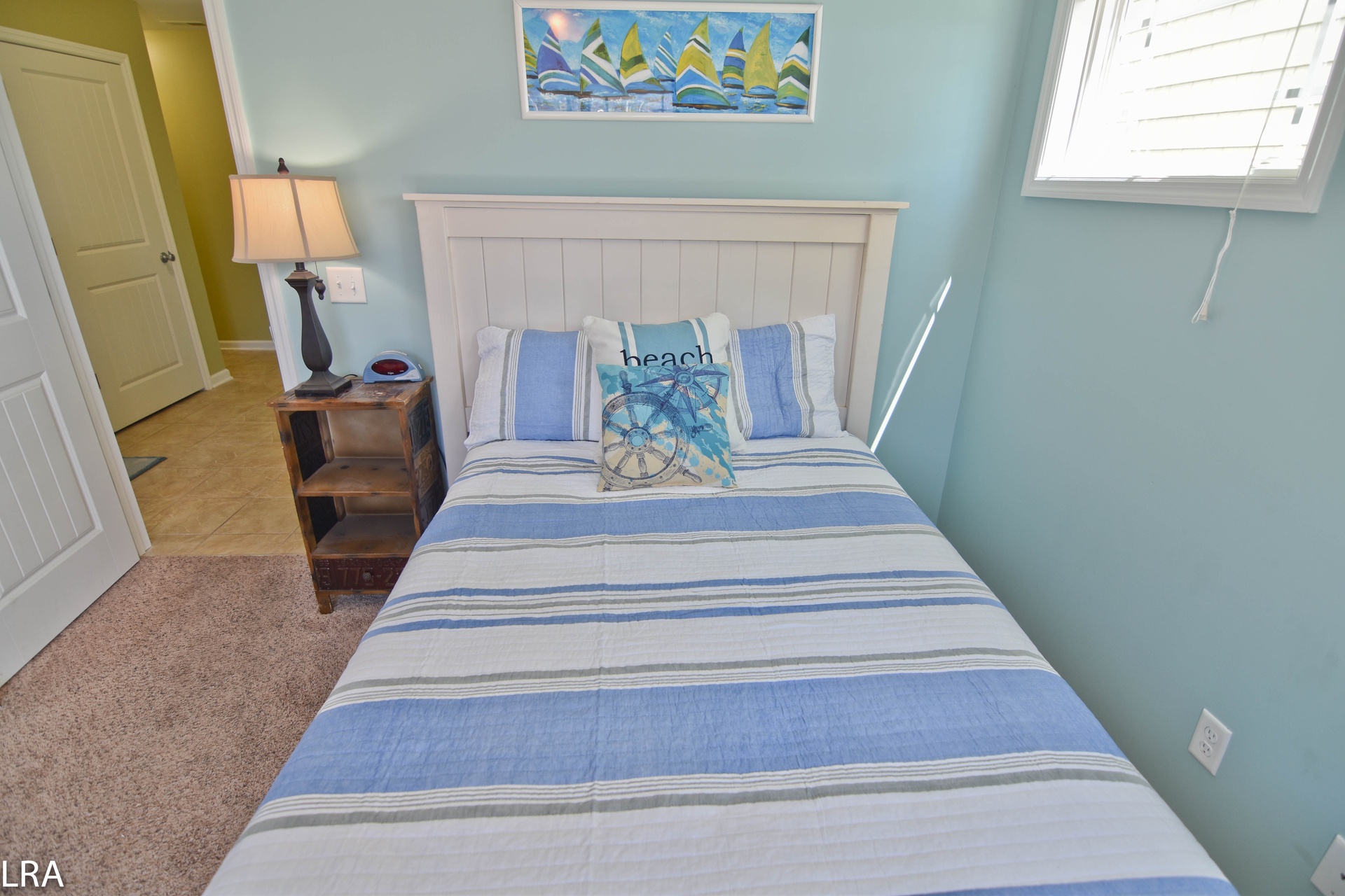 Up the stairs, you will find the master suite exclusive to the top floor. The bedroom features a queen bed with flat panel television. The master suite also offers a full bath to keep you from having to run downstairs. There is direct access to the private deck which quite possibly offers some of the best views Topsail Island has to offer. The deck gives you a 360-degree view of the salt marshes, the town itself, and of course the Atlantic Ocean! On the master suite level, there is a small bonus room with a futon for the little one. This room also has access to its own deck.