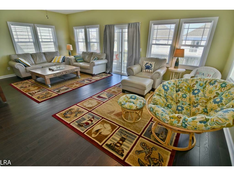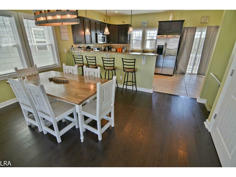 Up to the second floor, you are greeted by a large open and airy living area and kitchen. The living area features leather sofas along with a very comfortable papasan chair. The family will be entertained well with the large screen flat panel television and wireless internet access. Most of your time may be spent on the deck, which is just steps away from the living area. The kitchen features stainless appliances, granite countertops, and all the modern conveniences such as a microwave, dishwasher, blender, toaster, and coffee maker. The dining area features a handmade table with seating for six along with the bar area providing another four seats. The living level also offers a half bath for your convenience during those family times.