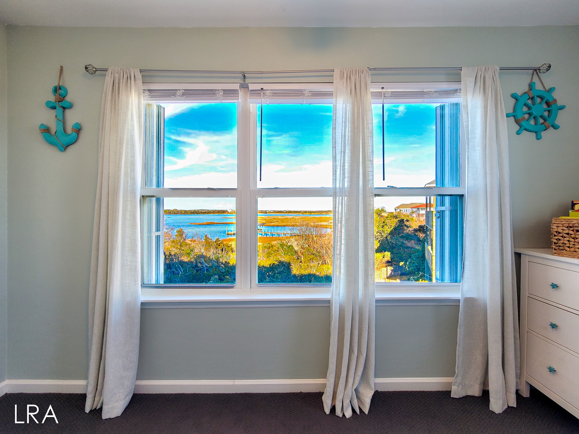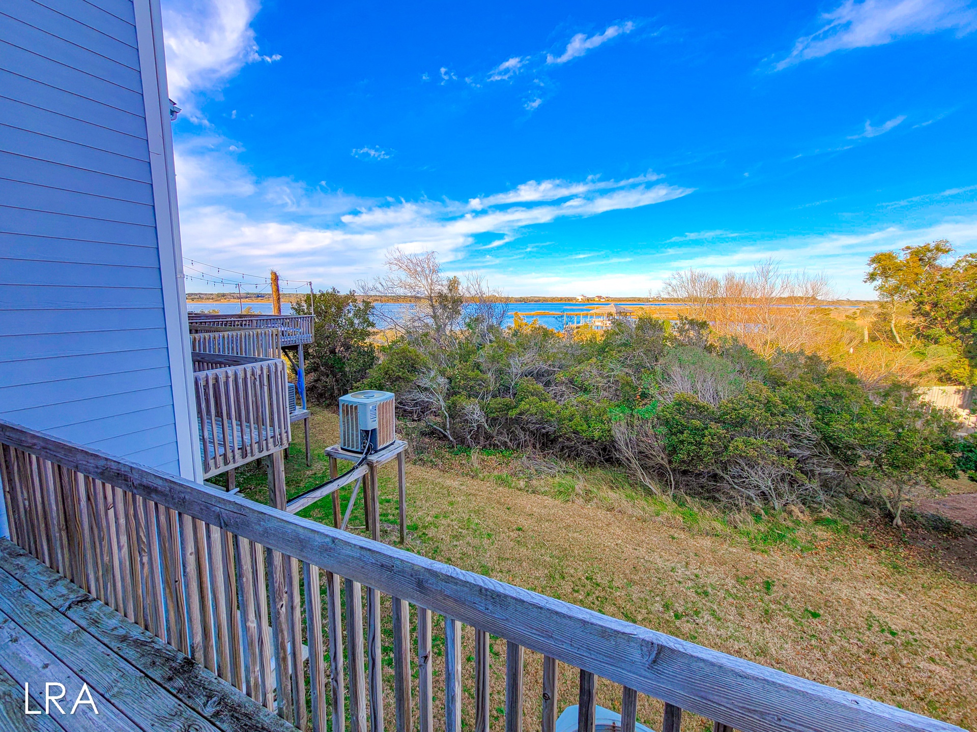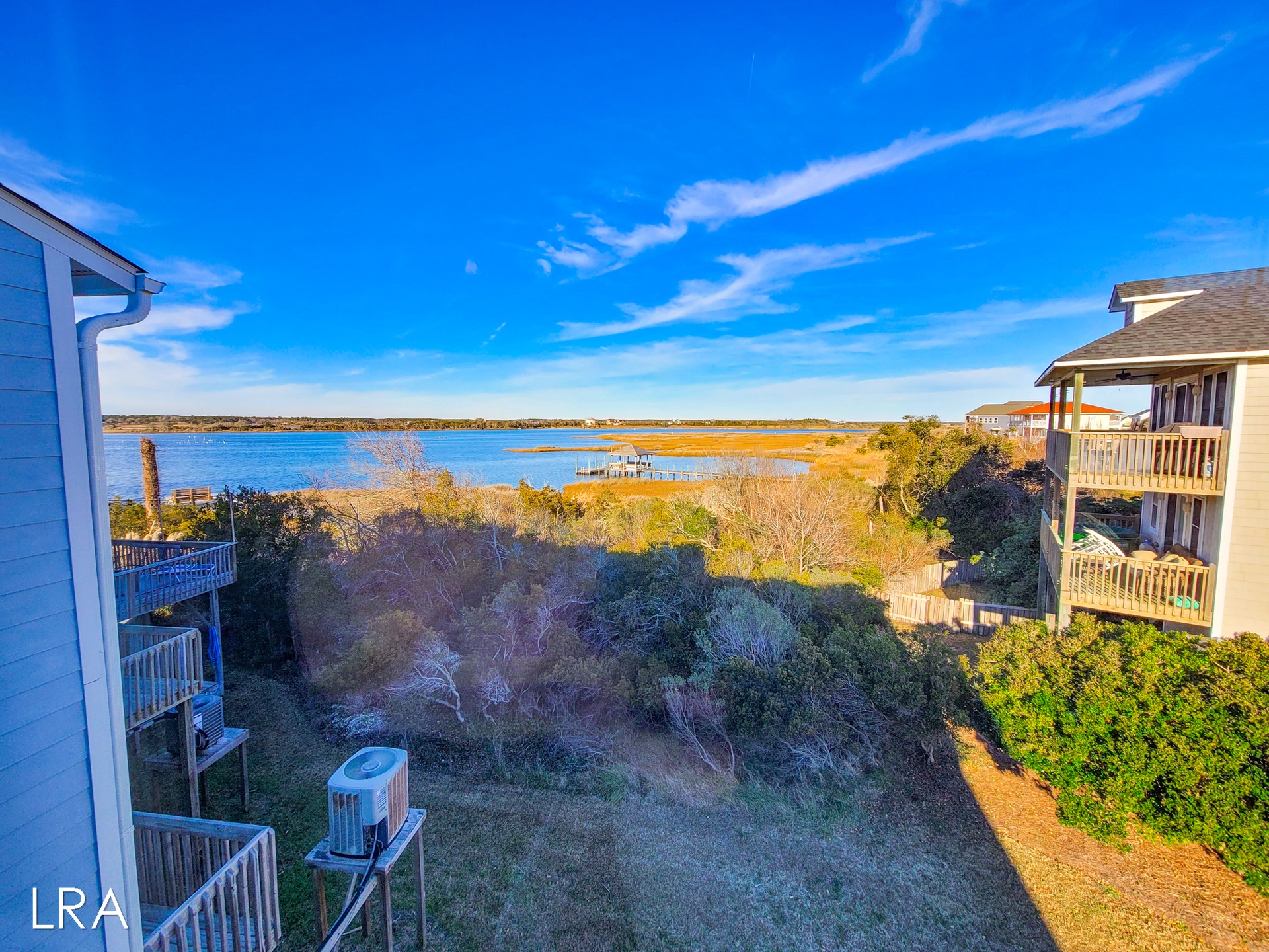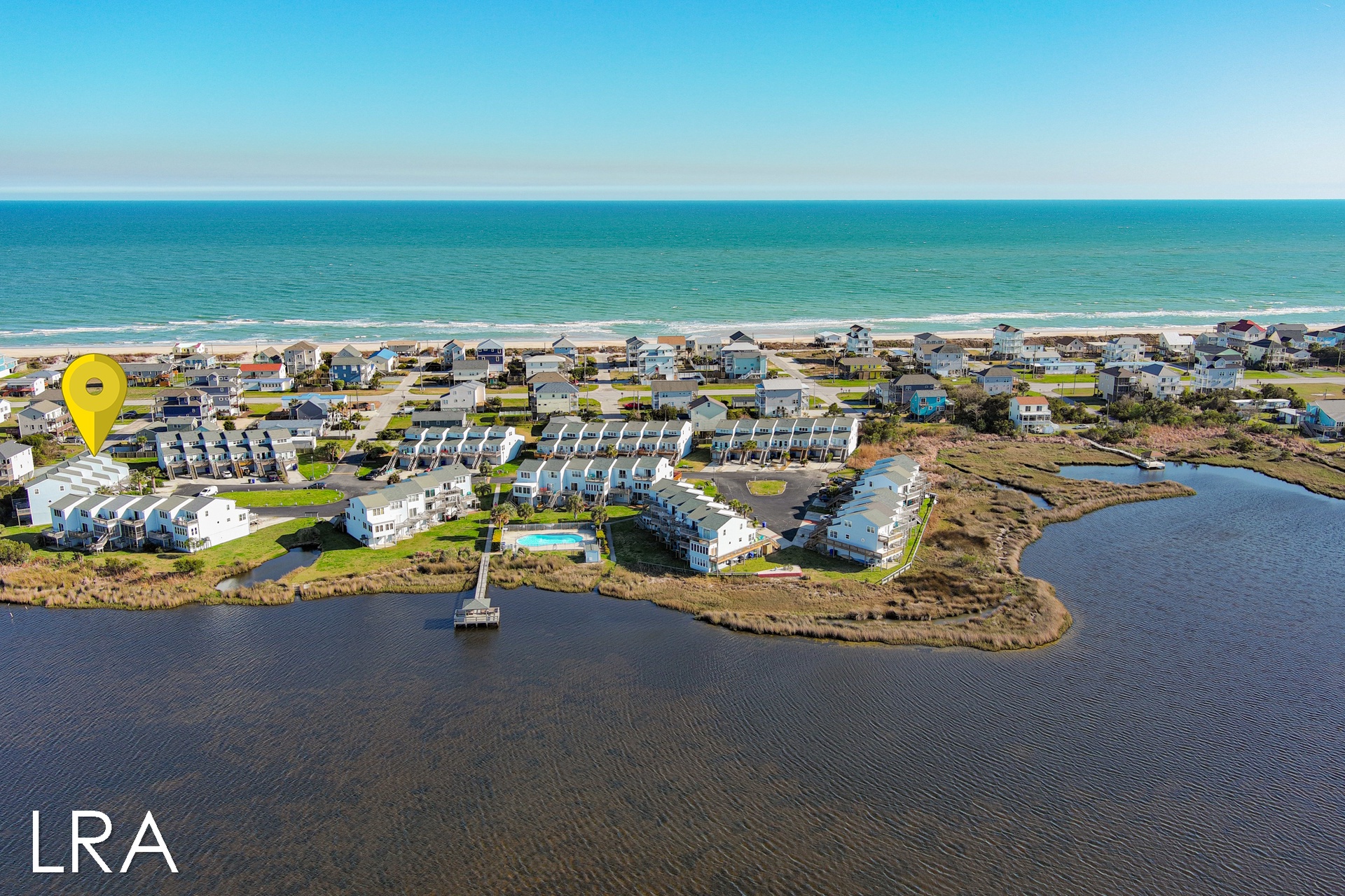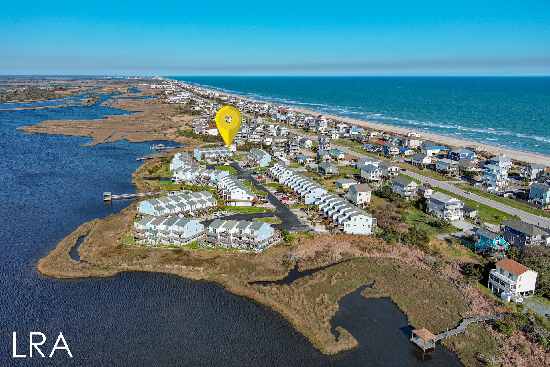 This beautiful 3 bedroom, 2 bathroom Waterfront Townhouse is located in the Bermuda Landing complex of North Topsail Beach. When you first arrive you will find parking for 2 cars in the driveway. *Please note, that guests do not have access to the garage.* Head up the stairs and use your keyless access code to get your vacation started! Walking in, you are greeted by the open living and kitchen area. Enjoy the comfortable seating and stunning coastal decor as you relax after a long day on the beach. A Flat Screen Smart TV is provided so you can kick back and enjoy catching up on your favorite shows and movies. This end-unit townhome enjoys amazing views and gets flooded with natural light during the day to brighten up your vacation. When you want to soak in the sun you can step out front and enjoy the private porch. You can even close the gate at the top of the stairs so your pup can enjoy the view too! The kitchen offers all major appliances, spacious countertops, and is equipped with all of your basic cooking needs so that you can whip up great meals throughout your stay. The kitchen bar offers 4 stools and folding tables have been provided so your party can all sit together when you want to enjoy a meal. Just off the kitchen area, and down the hall you come to the first bedroom. This room offers a queen-sized bed and access to the private deck with stunning waterfront views. Next to the bedroom is a full bath with a Shower and vanity sink. The full-sized washer and dryer are conveniently located in the hall on this level.