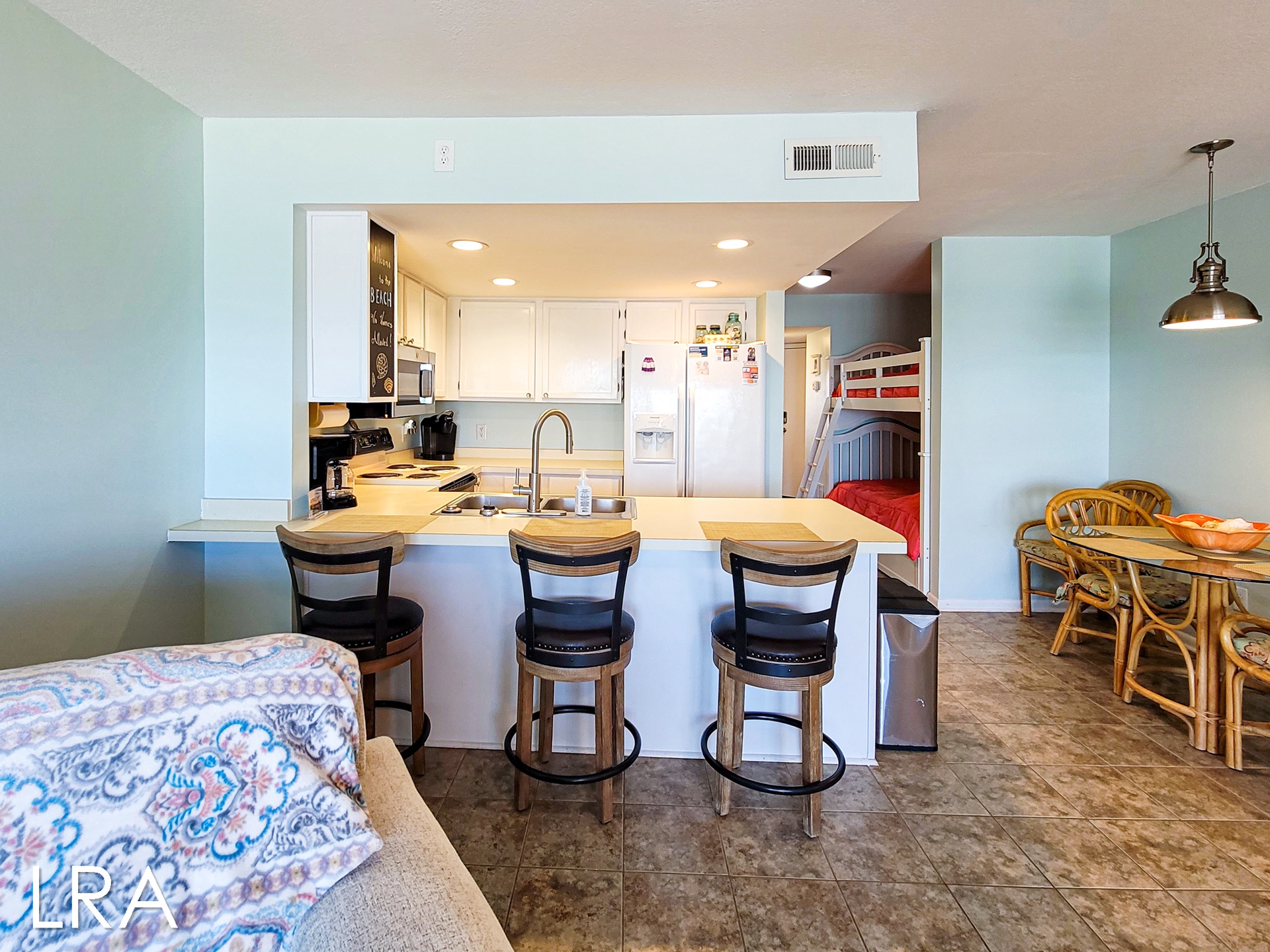 Bed sizes include a Queen, Queen Sleeper Sofa and a bunk bed. Pillows, spreads, and blankets are provided.