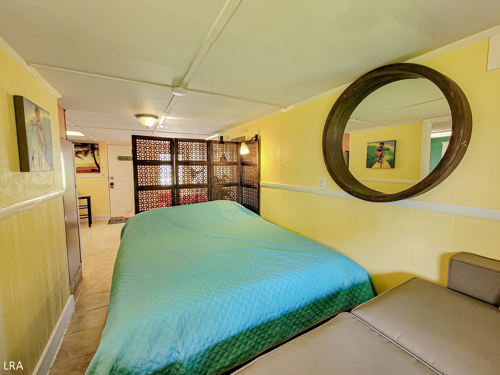 The second half of this property is an adorable studio apartment which is located just outside the back door of the cottage. There is a backyard area, an enclosed Beach Shower, and a rocking chair patio that separates the two buildings. This makes “The Roost” the perfect mother-in-law suite, or tucked-away oasis for members of your party to have their own space. Inside you are greeted with festive surf decor. The living room offers a cozy couch that converts to a sleeper sofa. Across the room, you will find a fantastic full Kitchen, dining area, and the Flat Screen Cable TV. A stunning divider separates the Queen bedroom area from the main living space. For those of you who are creative and need a safe space to write or those who need a place to set up your Laptop to stay connected while you are in town, there is a corner desk with a lamp. The Large full bathroom has tons of space with a shower/ tub combo and full-size washer and dryer.
