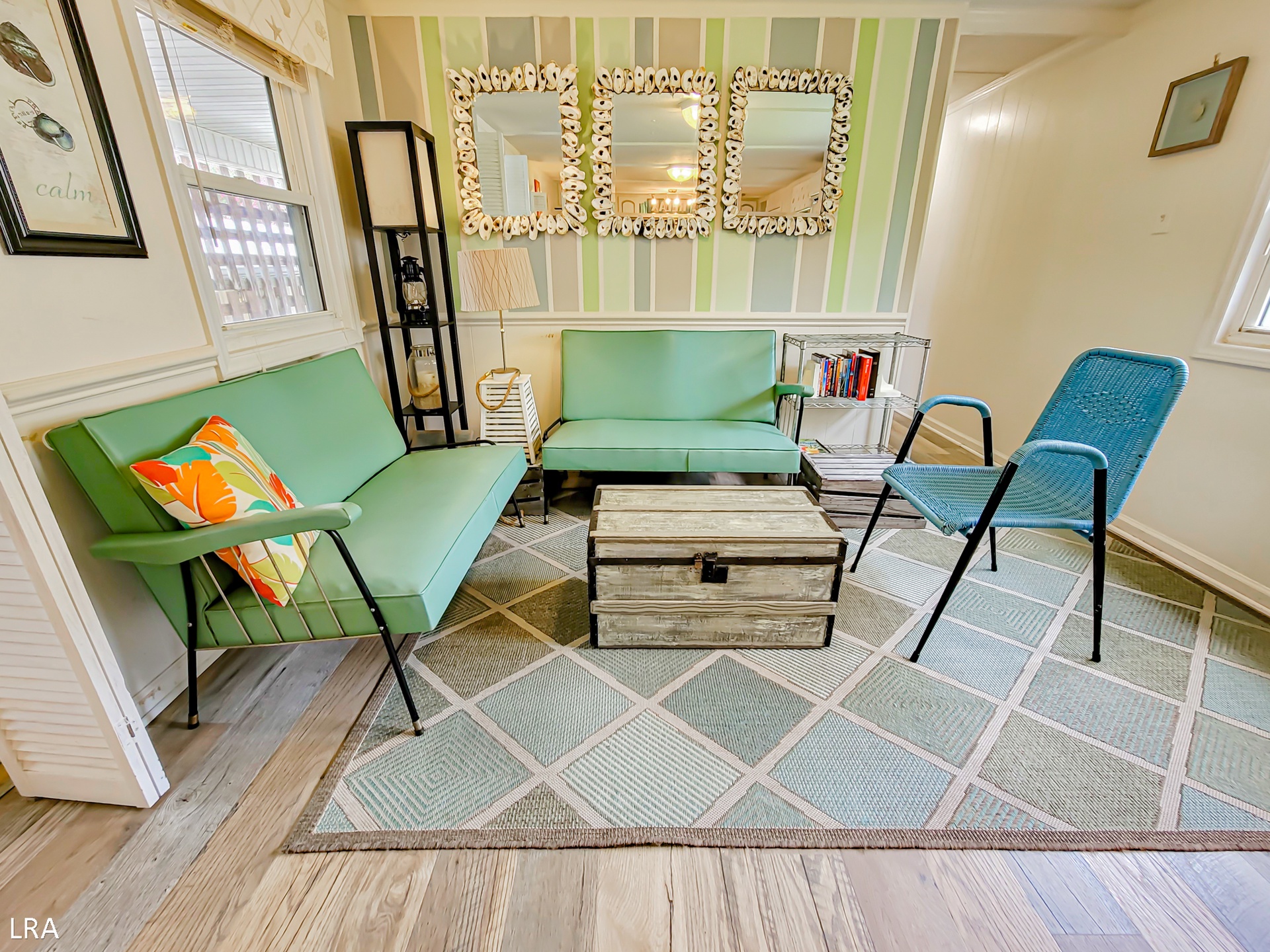 When you first arrive, you will find parking for 3 to 4 cars in the driveway area. The main house, The Cottage, welcomes you with a covered porch that is filled with comfy chairs. After a long drive to the beach, you can sit back, relax, and soak in the scenery. Walk inside and you are greeted by the living room area, complete with Flat Screen Cable TV, a comfortable sofa that doubles as a Queen Sleeper, and a cozy corner chair. Step through to the kitchen side of the property and you will be blown away by the bright, festive, and beachy decor. The antique retro furniture in the sitting area invites you to grab a book and relax while the chef in the family whips up a fantastic meal in the newly renovated Kitchen. Complete with all your major appliances as well as your basic cooking utensil needs, they will feel like a Master Chef in no time! The convertible dining room table has seating for 6 with additional seating at the bar for 2. There is also a large family picnic table out front where you can enjoy your meal while soaking up the Island atmosphere.