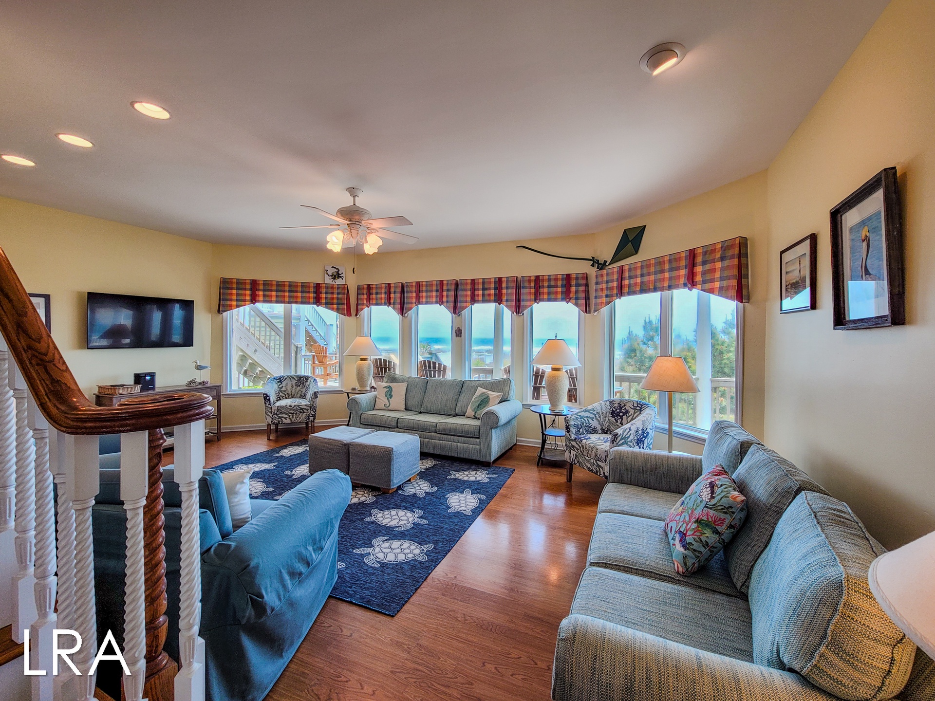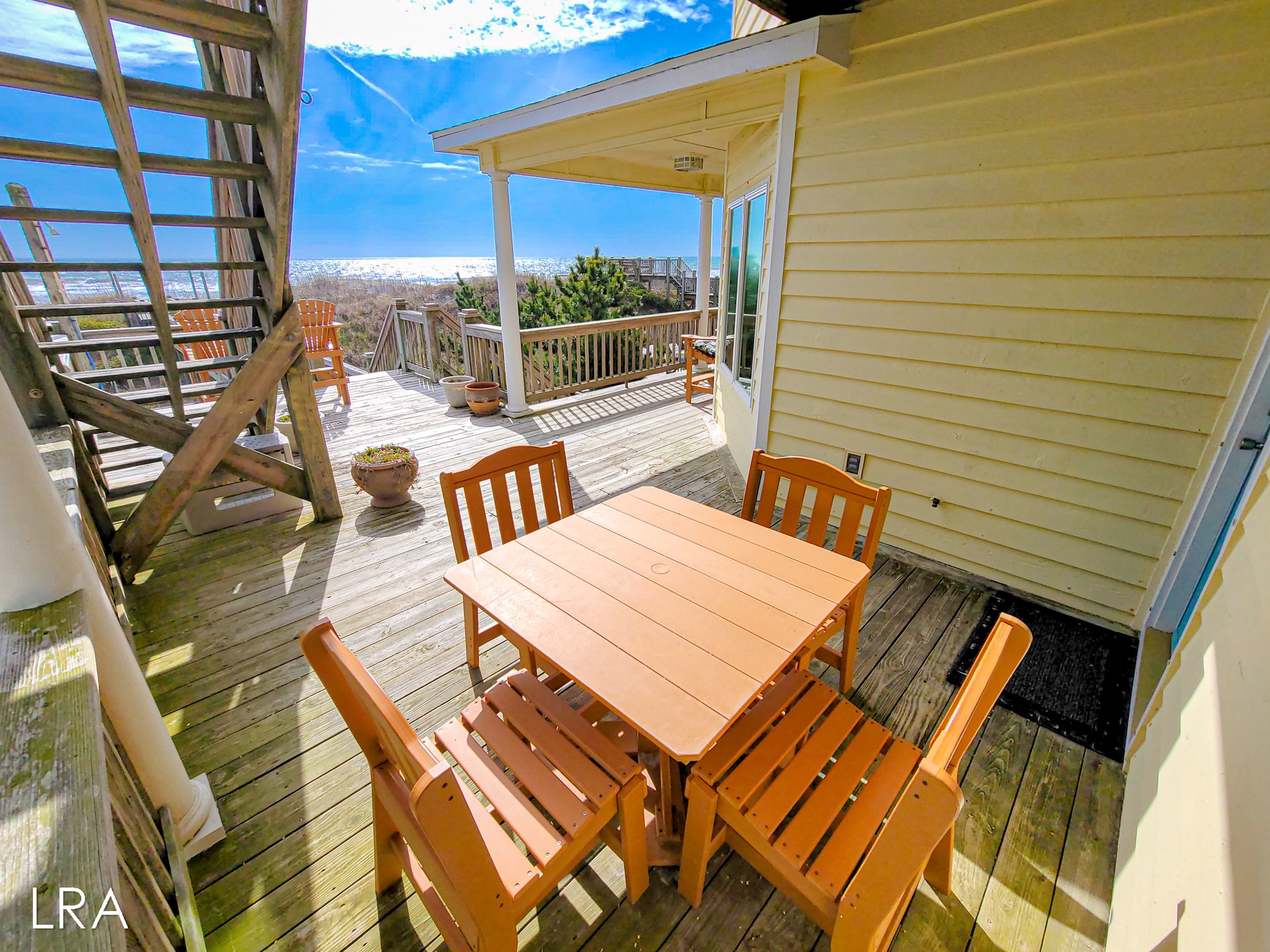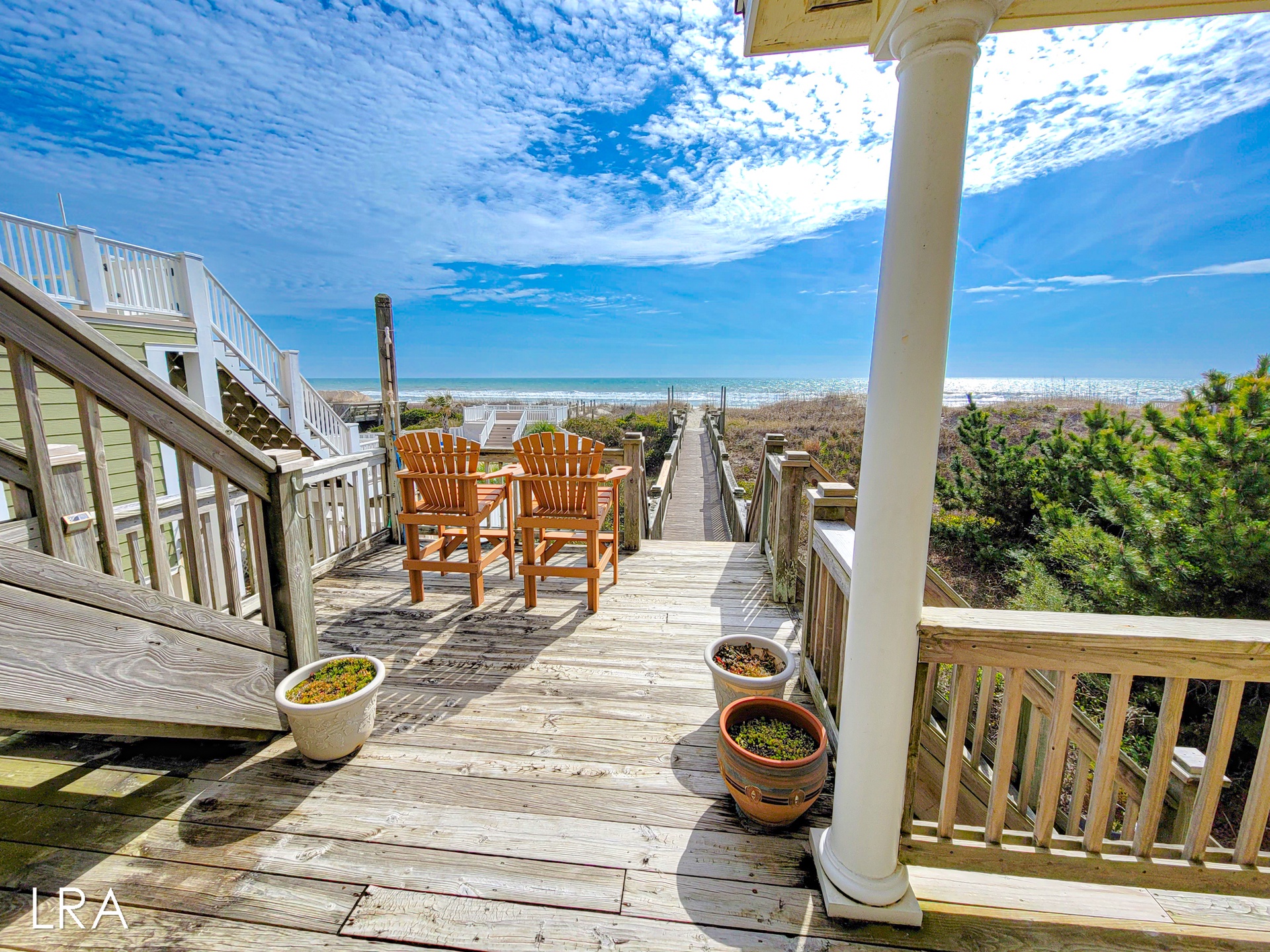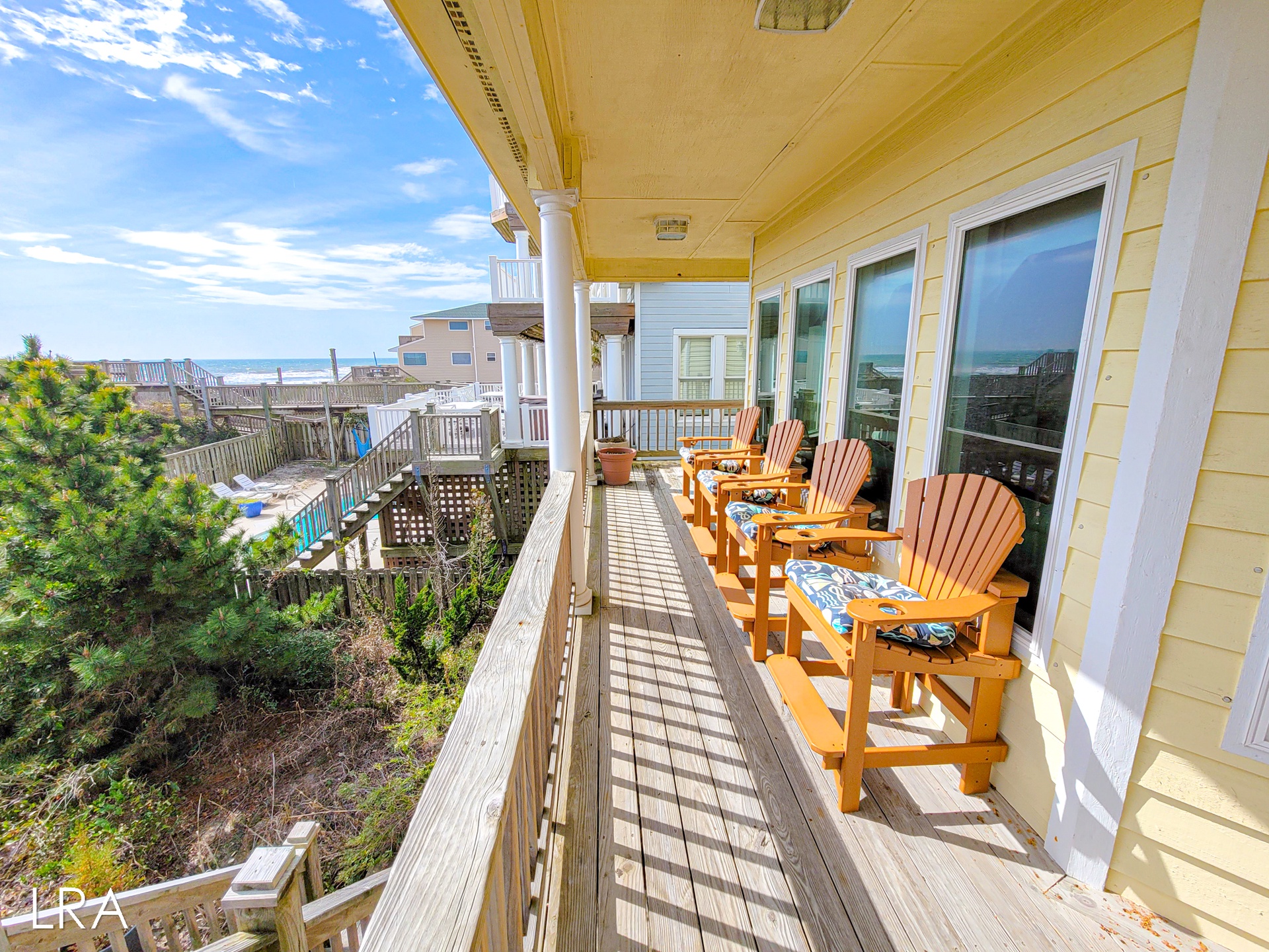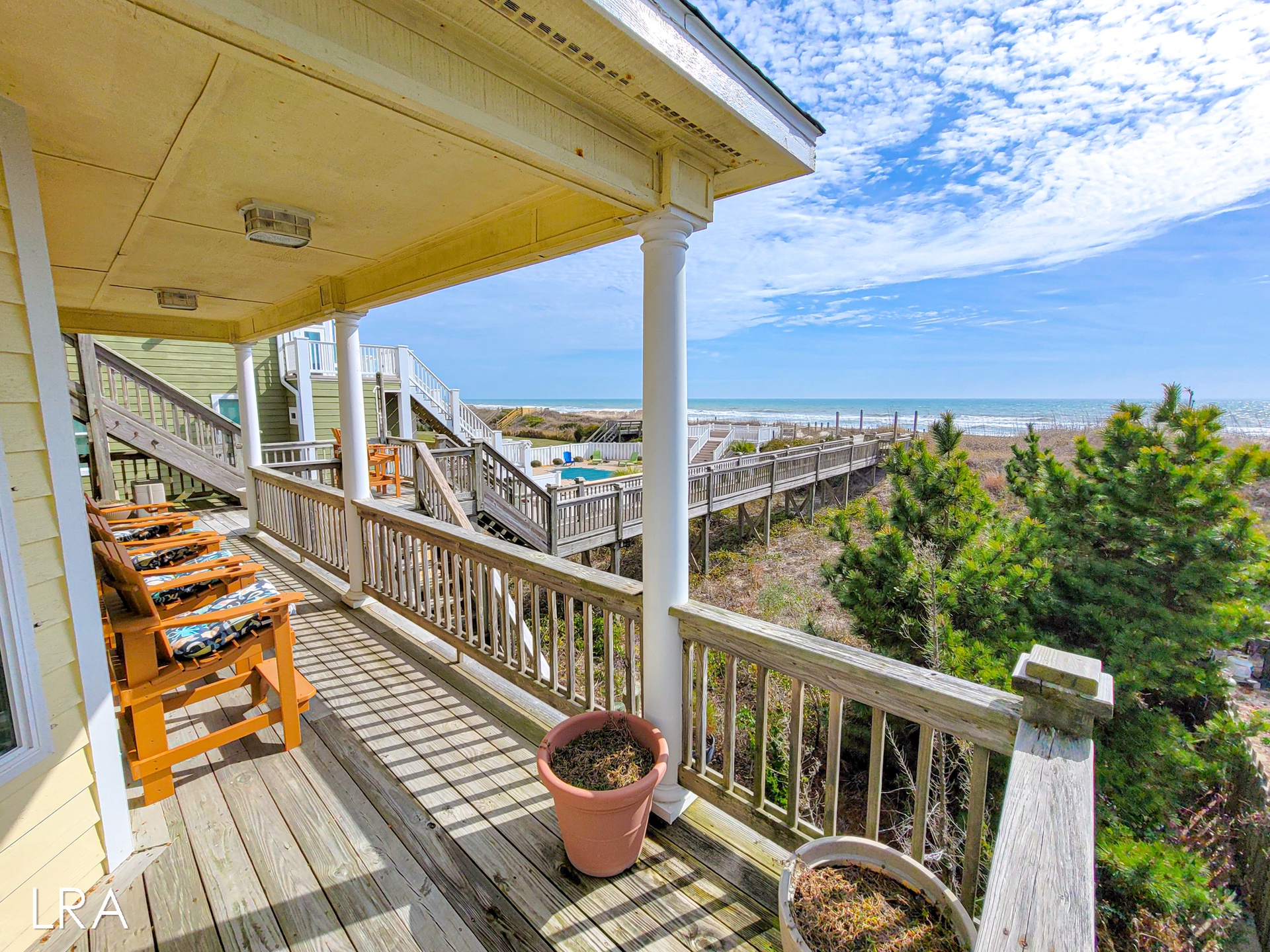 When you enter the first floor you are greeted with a crisp, white, fully equipped kitchen with all the major appliances and everything you need to serve your family proudly! The dining room offers seating for 8 people and an additional 4 seats at the bar. Past the stairwell, you have an open living room with plenty of seating (including a queen sleeper sofa) for the whole family to gather together. This room is complete with a large, flat-screen Smart TV so you can enjoy your favorite shows and movies after a long day on the beach. The rounded shape of this room invites natural light to flood in from the multiple oceanfront windows. Take a step outside and proudly enjoy your own piece of paradise. The spanning deck offers both covered and uncovered areas so you can enjoy the salt air all day long. Enjoy meals with an ocean view, or just sit back and relax in any of the multiple chairs provided while you watch Topsail Islands very own crew of Pelicans fly by throughout the day. Stepping back inside, you will find the first bedroom and bathroom. The Full shared bathroom offers a large vanity sink and shower tub combo. The private bedroom is located at the end of the hall and offers a Queen bed and street-side views.