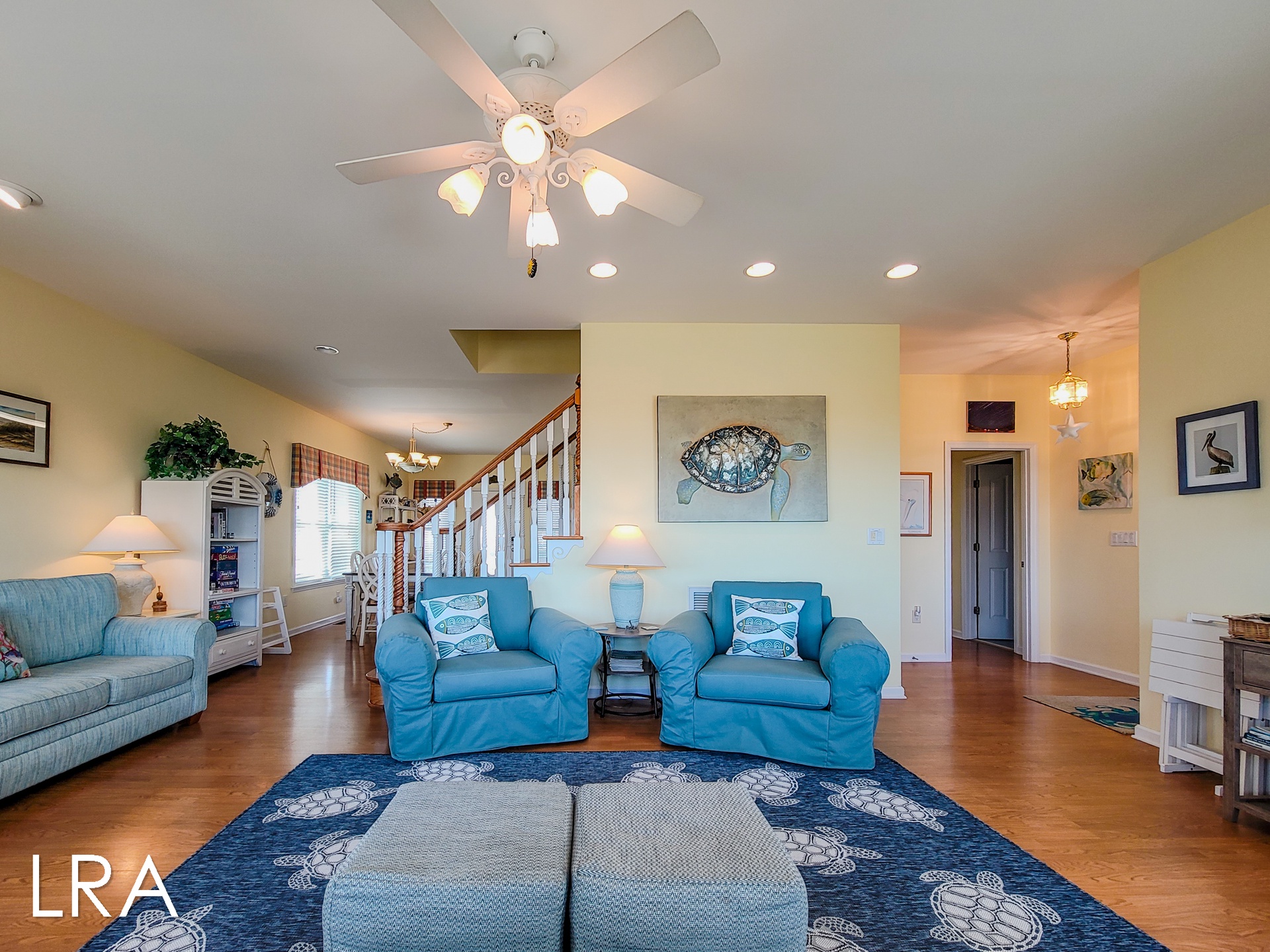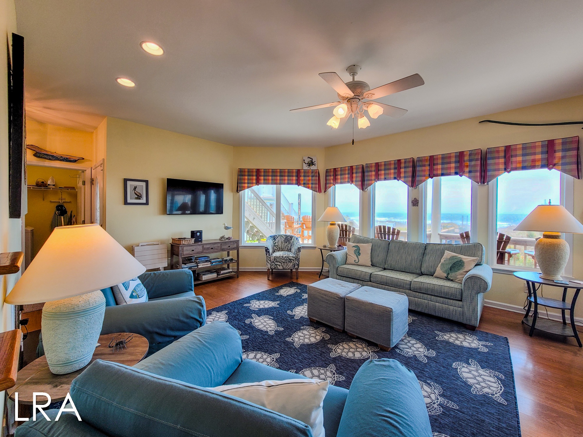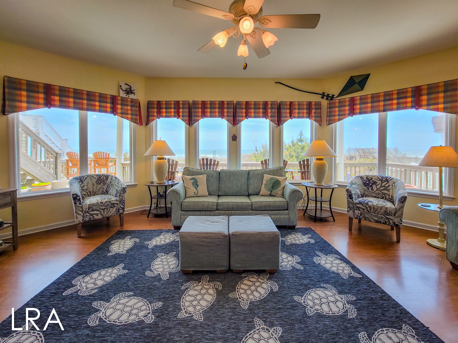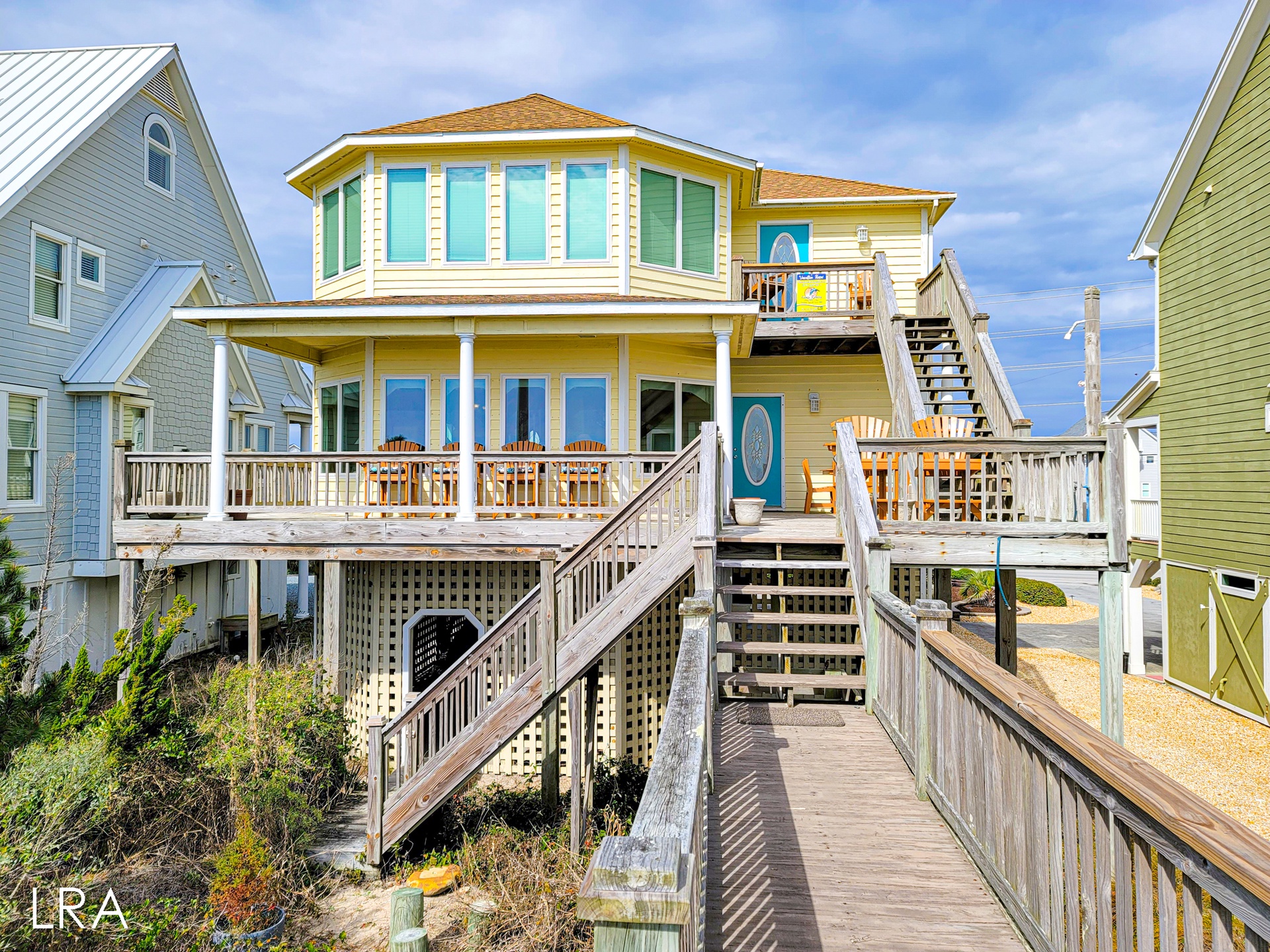 When you enter the first floor you are greeted with a crisp, white, fully equipped kitchen with all the major appliances and everything you need to serve your family proudly! The dining room offers seating for 8 people and an additional 4 seats at the bar. Past the stairwell, you have an open living room with plenty of seating (including a queen sleeper sofa) for the whole family to gather together. This room is complete with a large, flat-screen Smart TV so you can enjoy your favorite shows and movies after a long day on the beach. The rounded shape of this room invites natural light to flood in from the multiple oceanfront windows. Take a step outside and proudly enjoy your own piece of paradise. The spanning deck offers both covered and uncovered areas so you can enjoy the salt air all day long. Enjoy meals with an ocean view, or just sit back and relax in any of the multiple chairs provided while you watch Topsail Islands very own crew of Pelicans fly by throughout the day. Stepping back inside, you will find the first bedroom and bathroom. The Full shared bathroom offers a large vanity sink and shower tub combo. The private bedroom is located at the end of the hall and offers a Queen bed and street-side views.