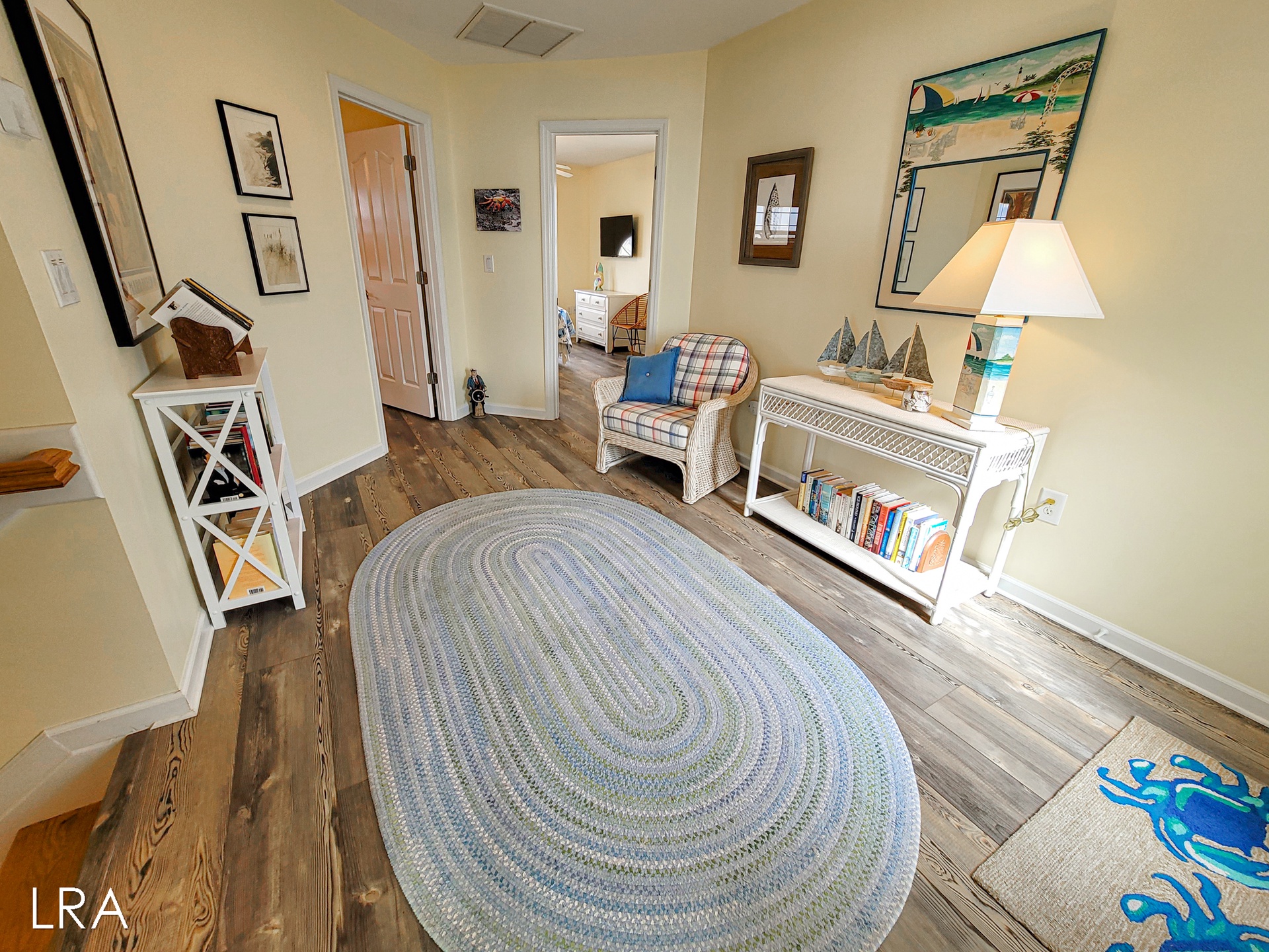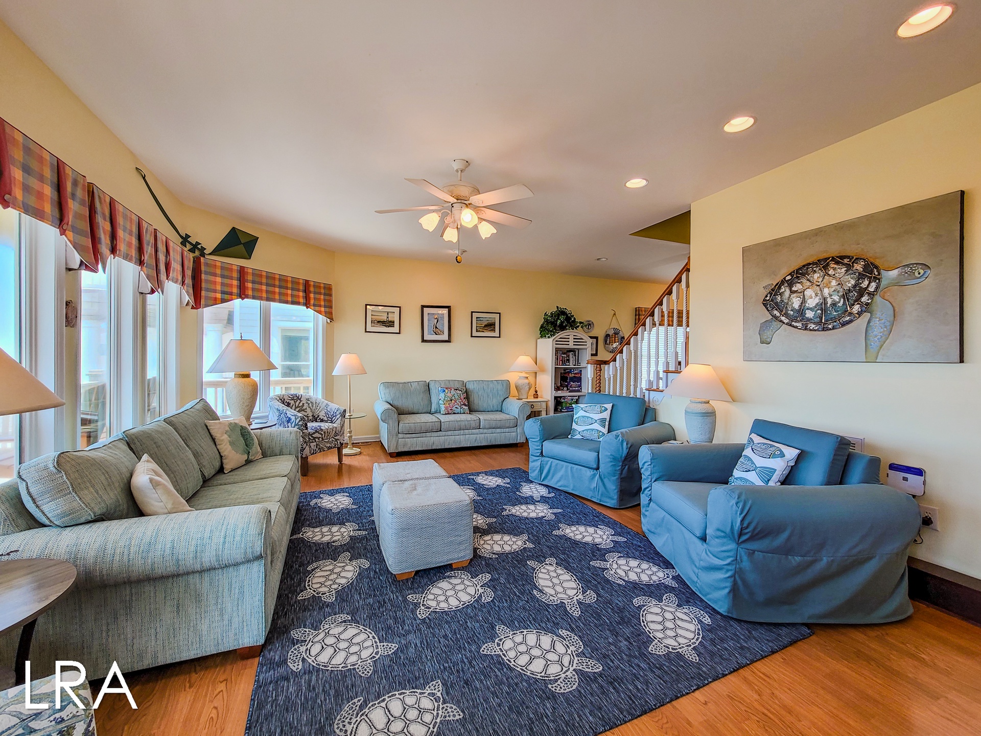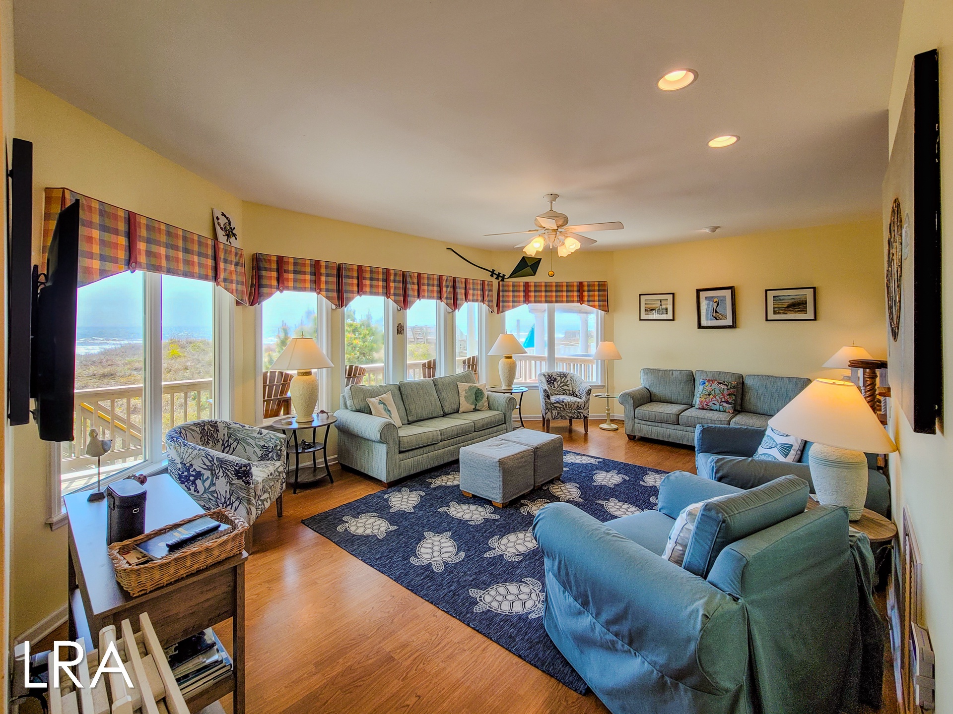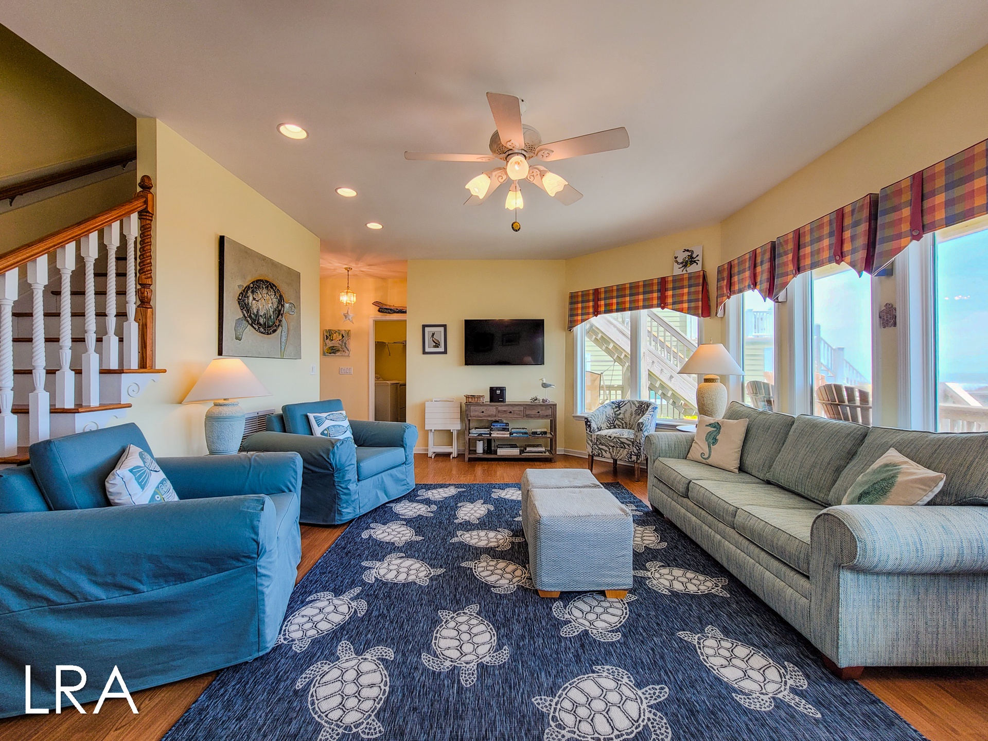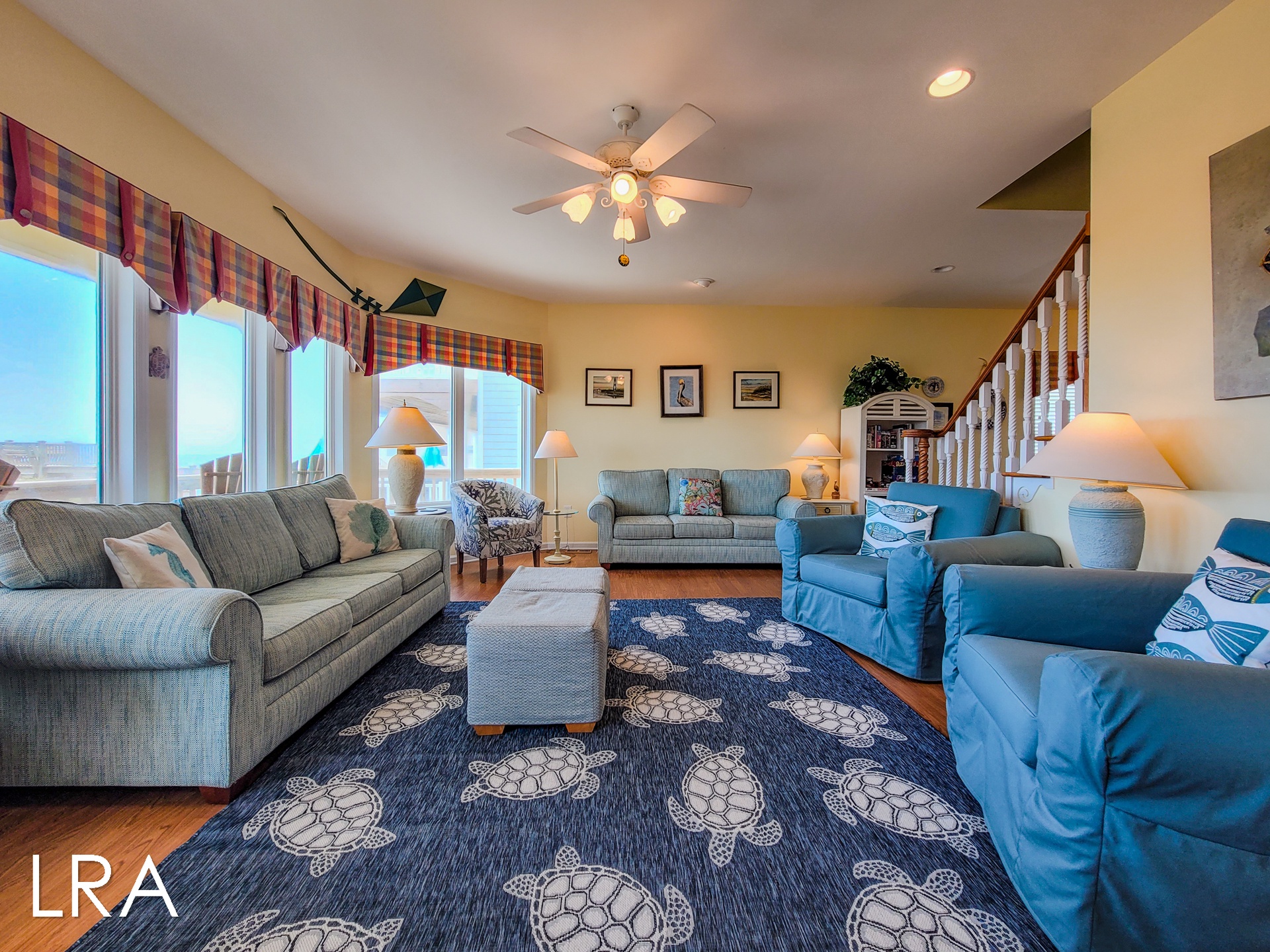 When you enter the first floor you are greeted with a crisp, white, fully equipped kitchen with all the major appliances and everything you need to serve your family proudly! The dining room offers seating for 8 people and an additional 4 seats at the bar. Past the stairwell, you have an open living room with plenty of seating (including a queen sleeper sofa) for the whole family to gather together. This room is complete with a large, flat-screen Smart TV so you can enjoy your favorite shows and movies after a long day on the beach. The rounded shape of this room invites natural light to flood in from the multiple oceanfront windows. Take a step outside and proudly enjoy your own piece of paradise. The spanning deck offers both covered and uncovered areas so you can enjoy the salt air all day long. Enjoy meals with an ocean view, or just sit back and relax in any of the multiple chairs provided while you watch Topsail Islands very own crew of Pelicans fly by throughout the day. Stepping back inside, you will find the first bedroom and bathroom. The Full shared bathroom offers a large vanity sink and shower tub combo. The private bedroom is located at the end of the hall and offers a Queen bed and street-side views.