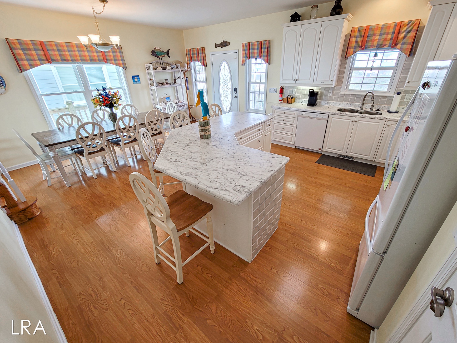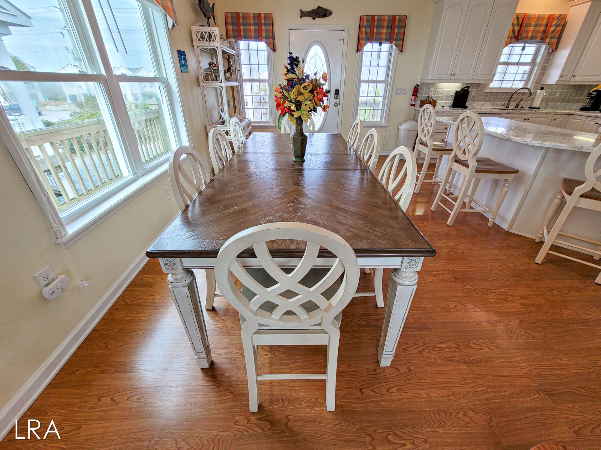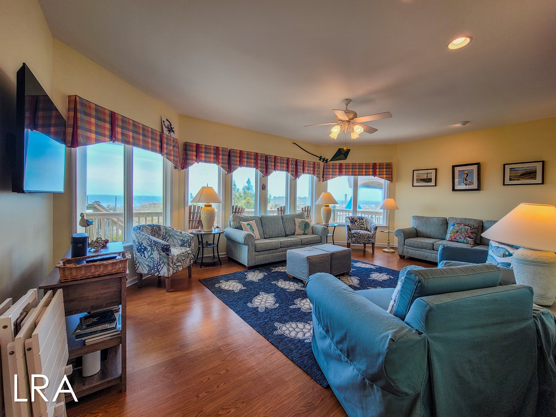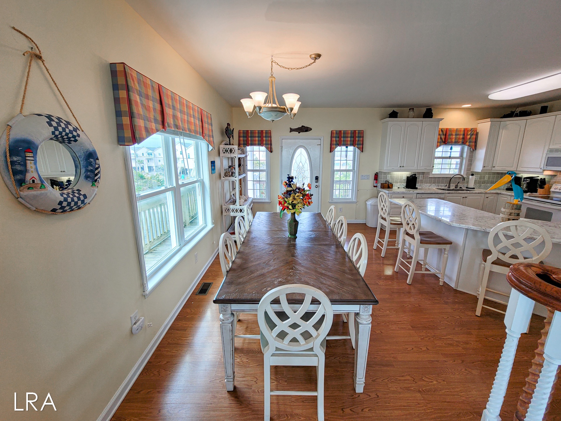 When you enter the first floor you are greeted with a crisp, white, fully equipped kitchen with all the major appliances and everything you need to serve your family proudly! The dining room offers seating for 8 people and an additional 4 seats at the bar. Past the stairwell, you have an open living room with plenty of seating (including a queen sleeper sofa) for the whole family to gather together. This room is complete with a large, flat-screen Smart TV so you can enjoy your favorite shows and movies after a long day on the beach. The rounded shape of this room invites natural light to flood in from the multiple oceanfront windows. Take a step outside and proudly enjoy your own piece of paradise. The spanning deck offers both covered and uncovered areas so you can enjoy the salt air all day long. Enjoy meals with an ocean view, or just sit back and relax in any of the multiple chairs provided while you watch Topsail Islands very own crew of Pelicans fly by throughout the day. Stepping back inside, you will find the first bedroom and bathroom. The Full shared bathroom offers a large vanity sink and shower tub combo. The private bedroom is located at the end of the hall and offers a Queen bed and street-side views.