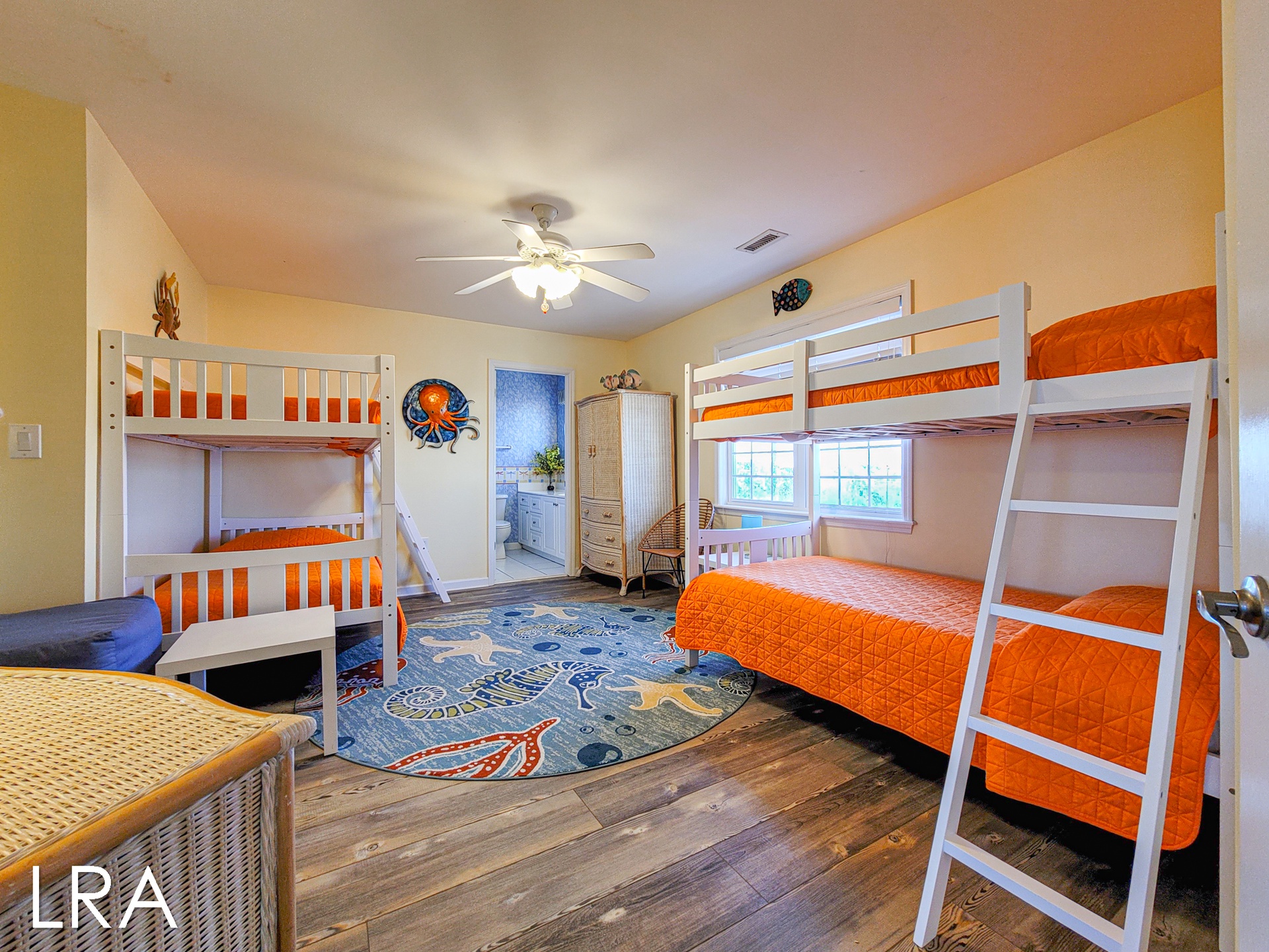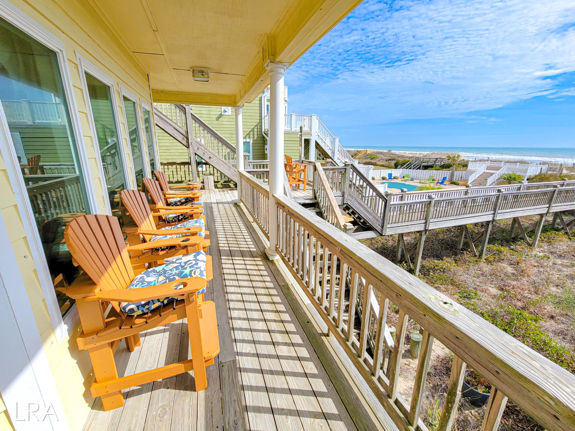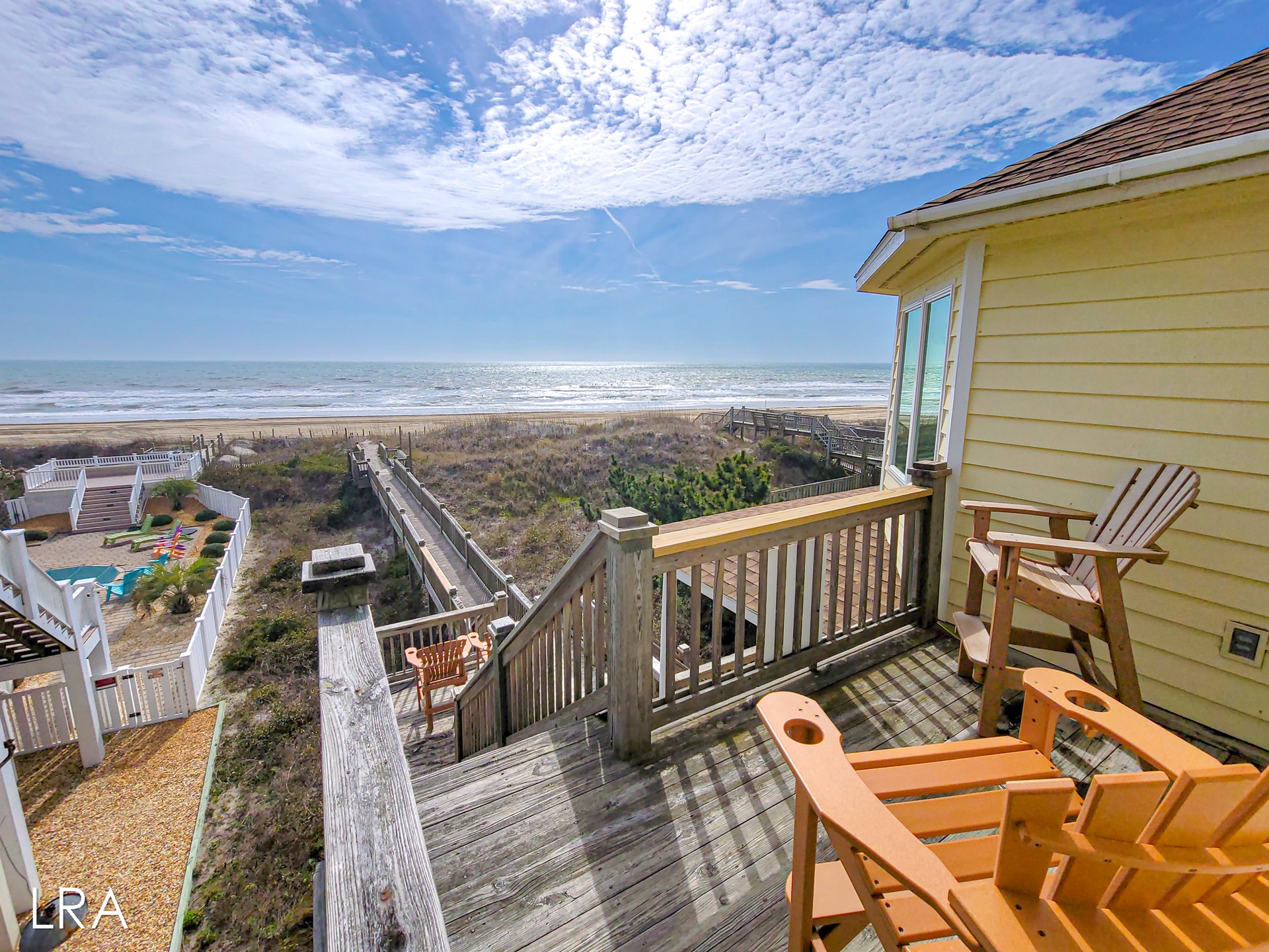 Head upstairs where you will find the remaining bedrooms and bathrooms. The spacious landing at the top of the stairs leads you everywhere you need to go. To your left, you have the Bunk Bedroom complete with two sets of Twin Bunk beds, a Flat Screen Smart TV, and a private bath with shower. Next door you have the Queen bedroom with street-side views and a private full bath with shower tub combo. Last but not least you have the Master suite. This oversized room offers a Queen Bed, Flat Screen Smart TV, incredible ocean views, and a large private bath. The bathroom is complete with double vanity sinks and a shower tub combo. Need some more fun in the fun? Enjoy a Bird's eye view of the beach from the private sundeck this floor offers.