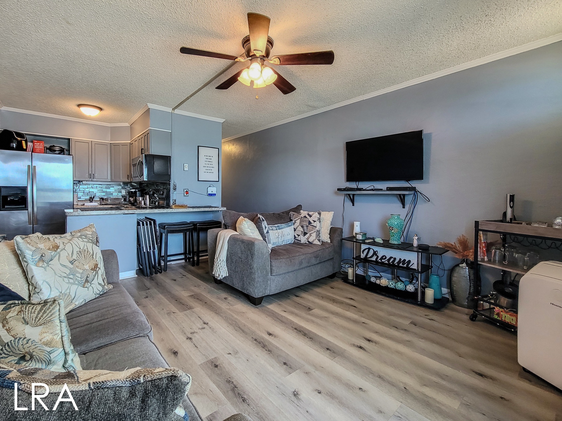 From the moment you step inside, you'll feel the thoughtful touches that make this retreat truly special. The cozy sleeping arrangements include a comfortable queen bed, a twin built-in bunk set perfect for kids or friends, and a queen sleeper sofa, providing ample space for everyone to relax and rest. With plenty of natural light, the bright and airy living area invites you to sink into relaxation mode. The open-plan layout seamlessly flows from the living room into the dining area and fully-equipped kitchen, allowing you to prepare meals, share stories, or enjoy a movie night after a day on the sand.